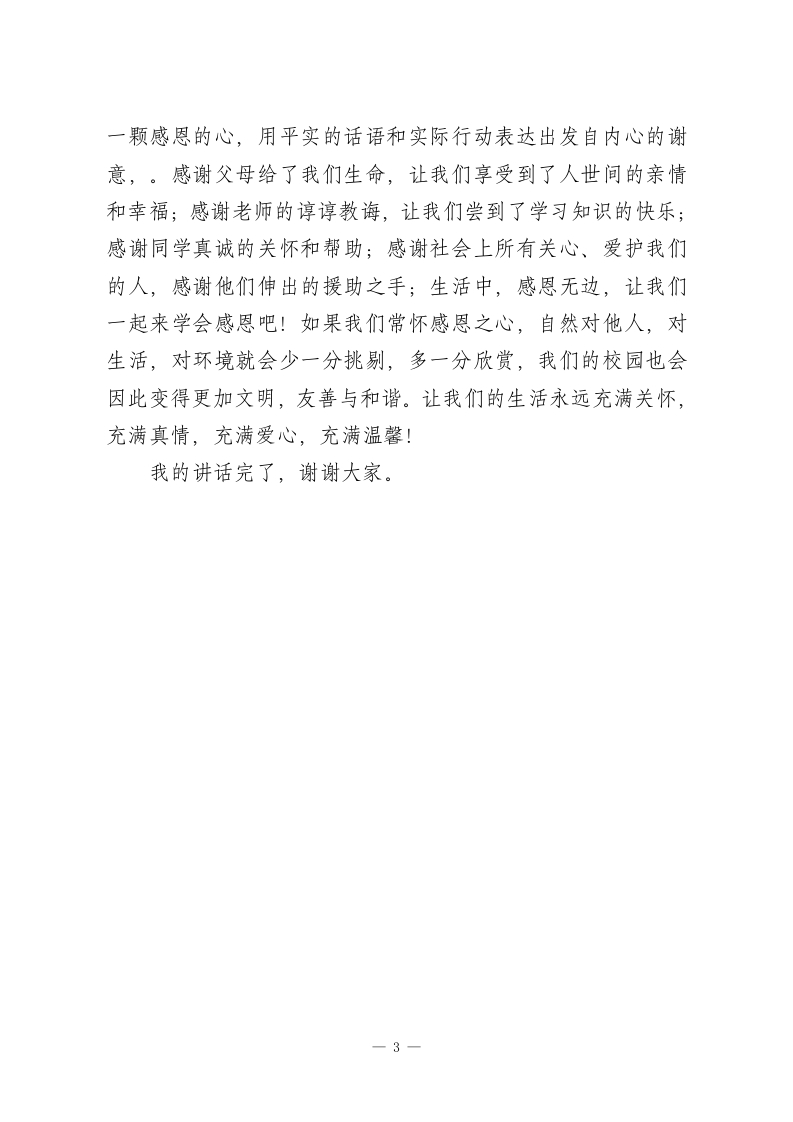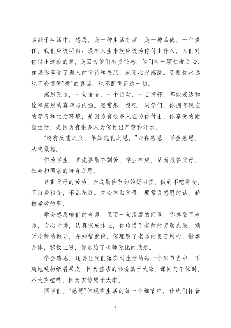 全国助残日上,校长在国旗下讲话:珍惜幸福,学会感恩老师、同学们:上午好!今天我讲话的主题是《珍惜幸福学会感恩》。昨天是全国助残日,我校连续九年用回收瓶罐的钱看望特殊学校的聋哑儿童,九年里先后1000余人次给特殊教育学校的聋哑儿童、智障学生送去文具、玩具、新年礼物和文艺演出,奉献了爱心,播撒了幸福。我们很多同学也因此懂得了珍惜,学会了感恩。在物质生活富裕的今天,我们仍然也有部分同学不懂得珍惜幸福生活,觉得这一切是应该的,也不懂什么是感恩,只知道一味地索取,从没想到过要回报。其实,自然界到处都是感恩的和谐与平衡:大地给了树木一片沃土,因为感恩,大树反赠给大地一丝凉意,草木为了感激春的到来而吐露新芽;鲜花为了感激夏的到来而竞相开放;硕果为了感激秋的到来而挂满枝头;雪花为了感激冬的到来而把大地银装素裹…多么富有诗情画意的感恩之心呀。在我们生命的每一天,我们不仅享受着空气、阳光和雨露,更重要的是我们享受着太多太多的他人给予我们的爱。大自然都懂得感恩,更何况我们人呢?在享受的同时,我们应该学会感恩!感恩是积极向上的思考和谦卑的态度,它是自发性的行为,当一个人懂得感恩时,便会将感恩化做一种充满爱意的行动。一1