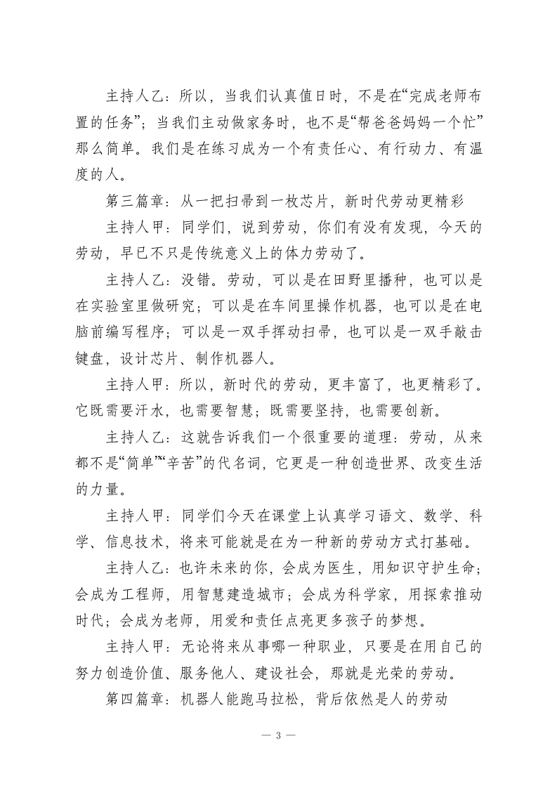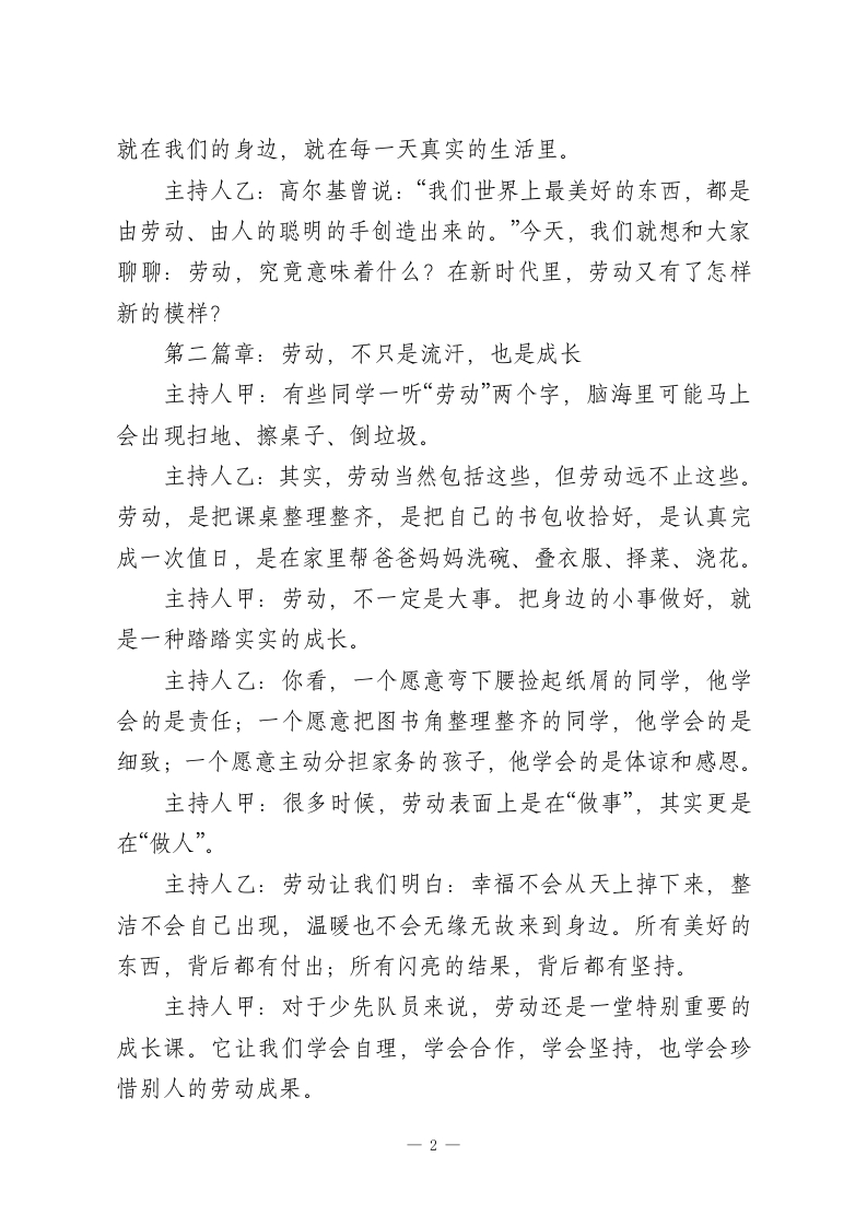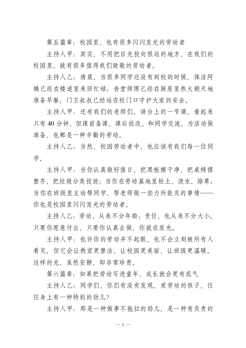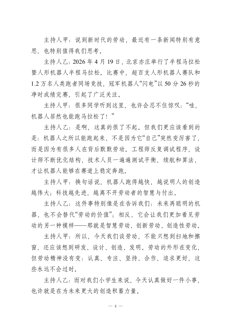 让双手发光,让未来奔跑2026年五一劳动节红领巾广播稿主持人甲:亲爱的老师们、同学们,大家好!这里是学校红领巾广播站。主持人乙:这里有温暖的声音,这里有成长的故事,这里有属于少先队员的思考与表达。主持人甲:我是今天的主持人。主持人乙:我是主持人。合:今天的红领巾广播,让我们一起走进劳动节特别节目《让双手发光,让未来奔跑》!第一篇章:五月的风,吹来一个特别的节日主持人甲:五月,是鲜花盛开的季节,也是充满力量的季节。因为五月里有一个特别的节日一“五一”国际劳动节。主持人乙:一说到劳动节,有的同学会想到工人叔叔、农民伯伯、医生阿姨、快递员叔叔,还有每天在校园里默默忙碌的保洁阿姨、食堂师傅、门卫伯伯。主持人甲:是啊,我们每天走进干净整洁的校园,坐在明亮舒适的教室里,吃着热气腾腾的饭菜,也许早已习惯了这一切。可这些“习惯”的背后,其实都站着一双双辛勤劳动的手。主持人乙:有人清晨天还没亮就开始打扫校园;有人在锅碗瓢盆间忙碌,只为同学们按时吃上一顿可口的饭菜;有人风里来、雨里去,守护着校园的平安与秩序。主持人甲:所以,劳动节不是一个离我们很远的节日,它1