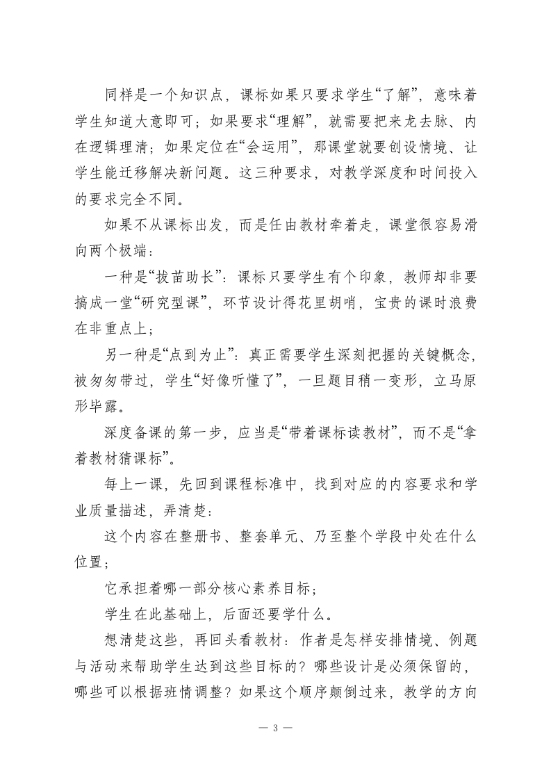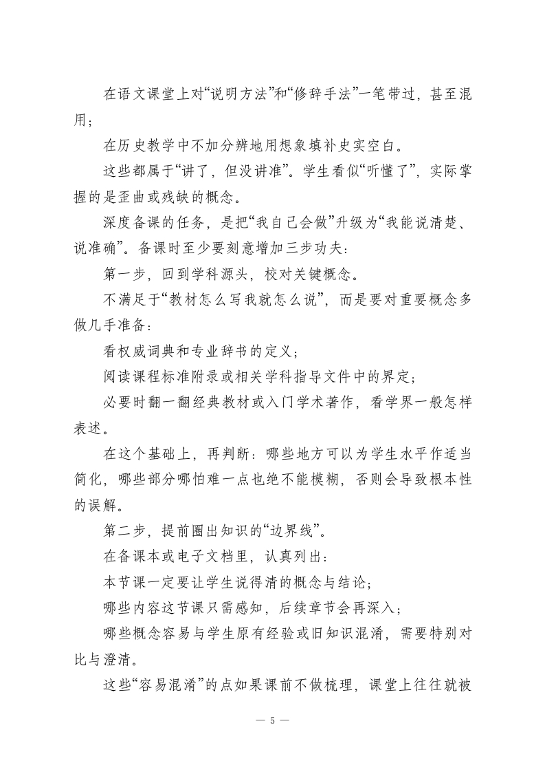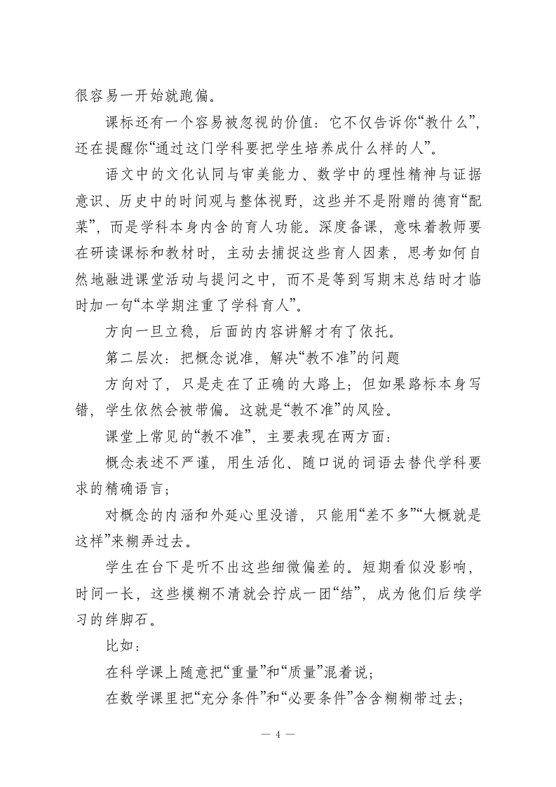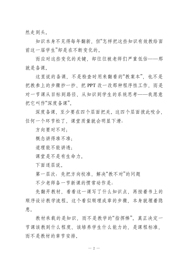 提升教学质量最该下功夫的地方:深度备课的4个关键抓手我的一位医生朋友,某次聚会时他爱人随口说了一句让我记到现在的话:“我们当医生的,离开专业期刊根本活不了,每年都有新病、新药、新技术,不跟进就会闯祸。你们当老师就不一样,十年前的东西照样能讲。”话不算好听,但也很难反驳。她没有明说“教书容易混日子”意思却已经摆在那儿:如果一个职业只靠多年以前的知识储备就能稳稳当当地干下去,那它看上去似乎并没有太强的专业压力。听着扎耳朵,却是每一个老师都值得沉思的一句话。的确,医学领域的知识更新非常快,一个外科医生如果五年不看文献、不进修,很可能就还在用已经过时的手术方式。反观学校教学,勾股定理不会过期,光合作用的基本原理也很难被推翻。于是就形成一种很危险的想法:既然学科内容本身这么稳定,那我是不是也可以原地不动?问题恰恰出在这里。学科的“结论”没怎么变,可教育生态却在不断变化。课程标准从“三维目标”走向“核心素养”,背后的理念已经完全不一样;教室里的孩子成长在移动互联网时代,获取信息的渠道、看世界的方式、注意力的切分都和十年前完全不同;中高考命题也从“记住多少”转向“能不能用得出来”,单靠刷题拿高分的路径已1