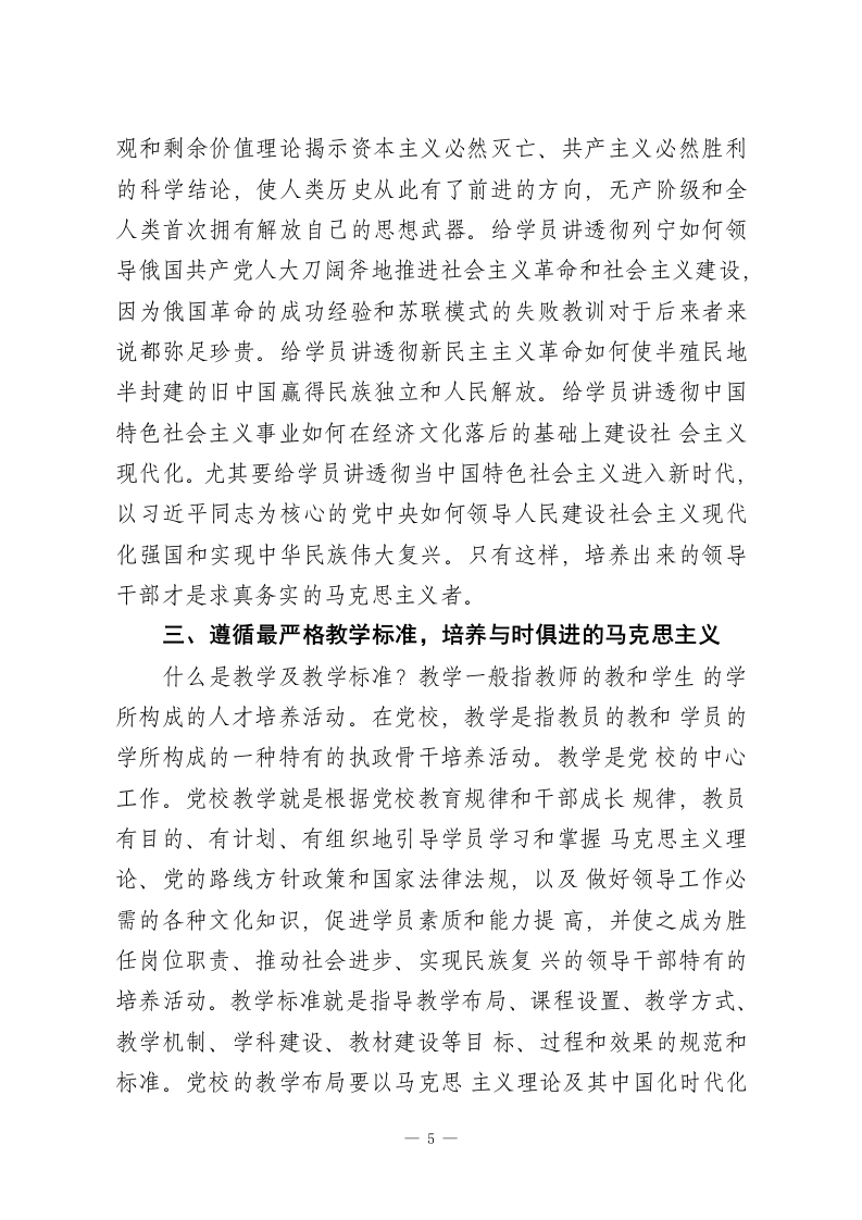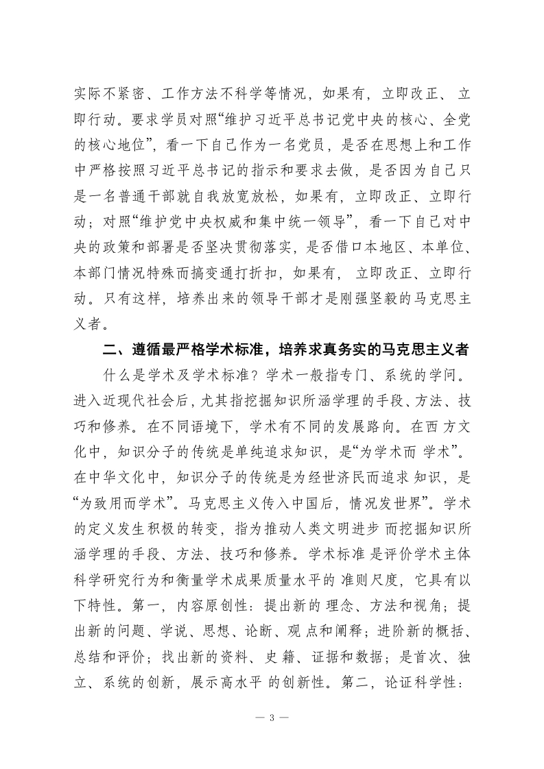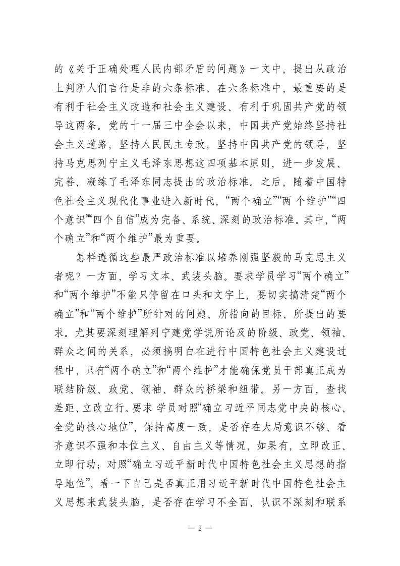 校长在市委党校理论学习中心组(扩大)专题研讨交流会上的发言各位老师,同志们:中国共产党的初心和使命是为中国人民谋幸福、为中华民族谋复兴。党校是我党教育培训干部,并将党员干部培养成马克思主义者的主阵地。在新时代,必须遵循最严格的政治标准、学术标准、教学标准、管理标准,只有真正做到从严治校、质量立校,才能切实坚守住党校为党育才、为党献策的初心,将参训学员培养成名副其实的马克思主义者,为中华民族伟大复兴和共产主义事业源源不断地输送一批又一批的优秀领导干部。下面,我讲几点体会,与同志们共同交流。一、遵循最严格政治标准,培养刚强坚毅的马克思主义者什么是政治及政治标准?政治就是以政为治。在古汉语中,“政”通“正”。以政为治就是以正为治,意指以执政者自己的心正、身正、行正引领民众也同样心正、身正、行正,天下由此而治。进入现代社会,政治指政党和政府通过对权力的摄取、分配和运行实现对社会的管治。政治行为按目的也相应分成两大类:维护少数人的利益和维护多数人的利益。当然也形成了各自的政治标准。政治标准就是国家、政党、社会集团在观察和处理问题时,根据自身的根本利益所规定人口绝大多数的无产阶级和劳动人民的利益。中国共产党作为马克思主义政党,经过上百年的革命、建设和改革历程,其政治标准已逐步完善。毛泽东同志在1957年发表一1