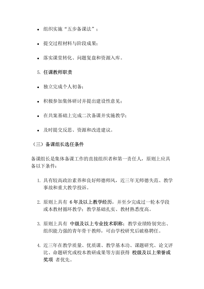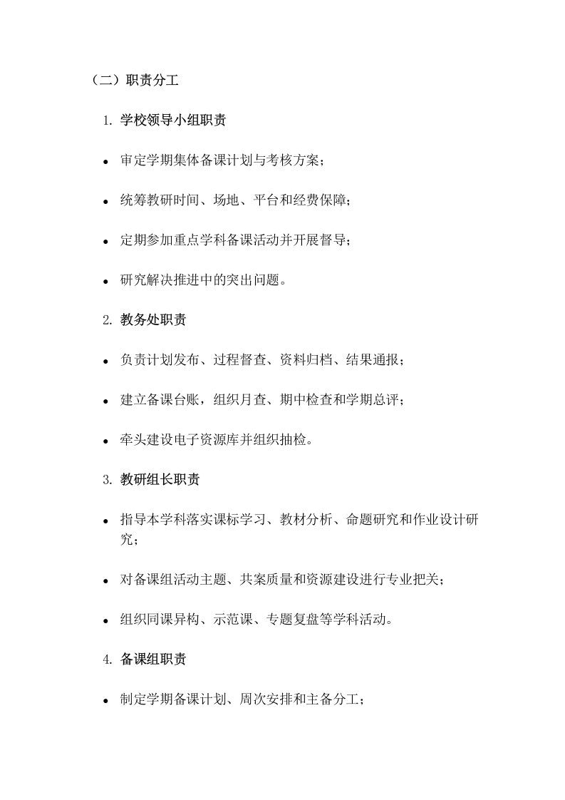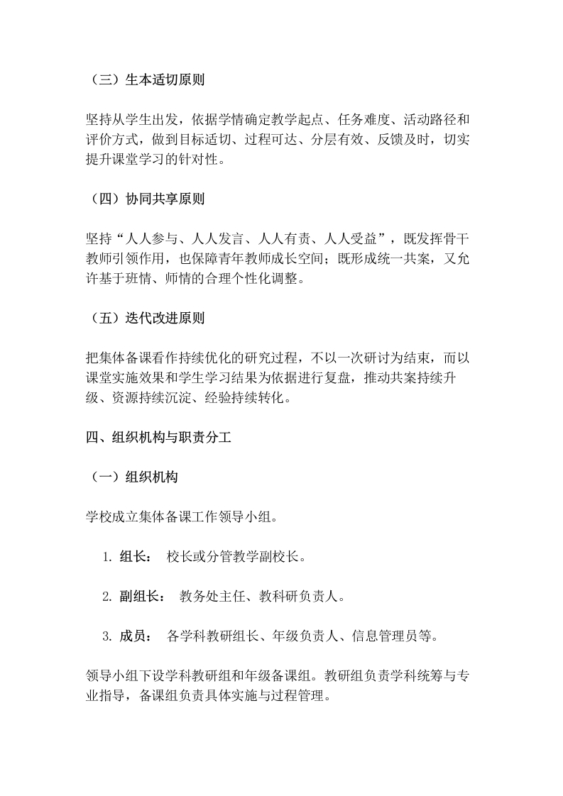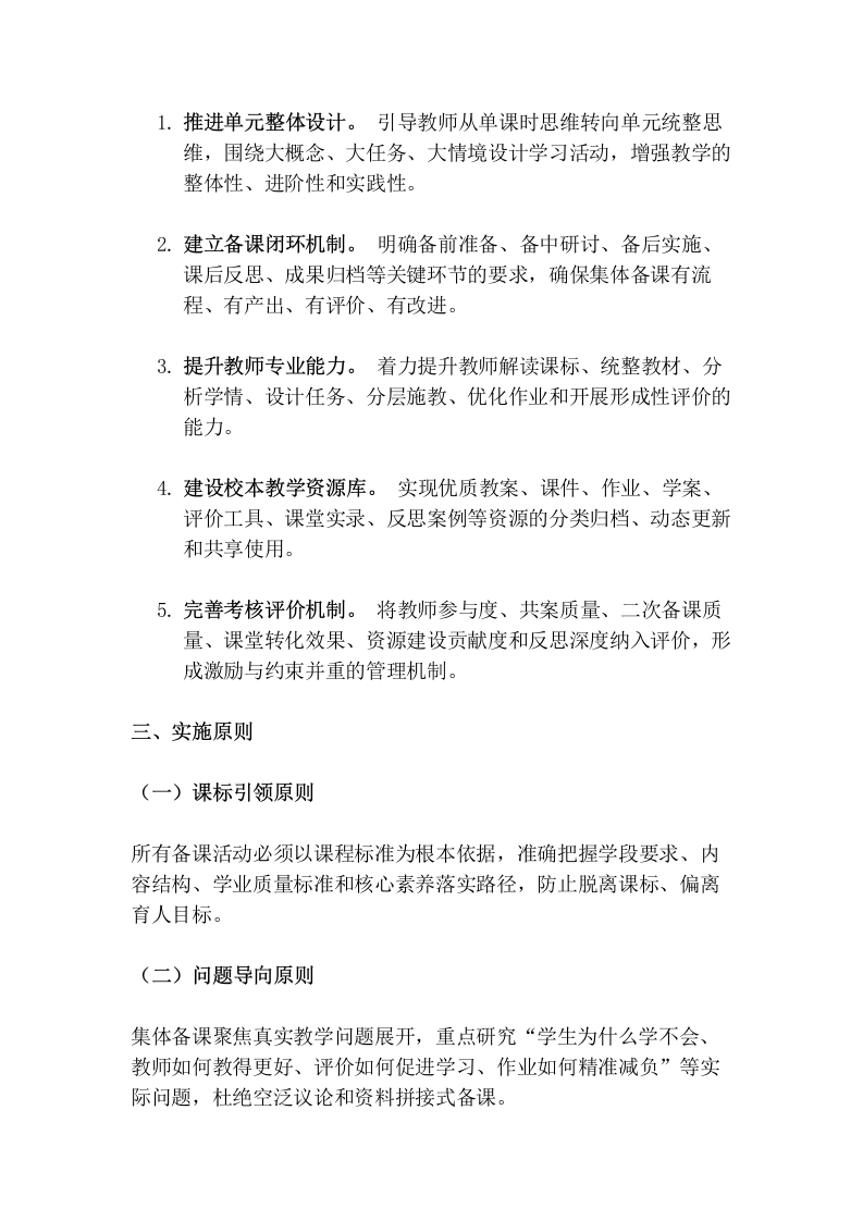 学校集体备课制度实施方案(2026修订)为深入贯彻落实《义务教育课程方案和课程标准(2022年版)》要求,全面推进课堂教学改革,切实发挥集体智慧在课程实施、课堂改进和教师成长中的引领作用,进一步规范学校集体备课工作流程,提升备课质量与课堂效能,结合学校教育教学实际,特制定本实施方案。一、指导思想以习近平新时代中国特色社会主义思想为指导,全面落实立德树人根本任务,坚持以课程标准为依据、以学科核心素养培养为导向、以学生真实学习需求为中心、以提升课堂教学质量为目标,突出单元整体设计、任务驱动学习、评价促进发展和团队协同研究。通过建立“统一要求、分层设计、个性实施、持续改进”的集体备课机制,推动教师由经验型备课向研究型备课转变,由碎片化课时设计向结构化单元设计转变,由个人单兵作战向教研共同体协同发展转变,形成“以备促教、以教促学、以研促改、以评促优”的教学改进生态。二、工作目标(一)总体目标构建常态化、专业化、数字化的集体备课运行体系,形成“个人初备一集体研讨一形成共案一个性化二次备课一课堂实施一反思迭代”的工作闭环,使集体备课真正成为学校提升教学质量、促进教师成长、建设课程资源库的重要抓手。(二)具体目标