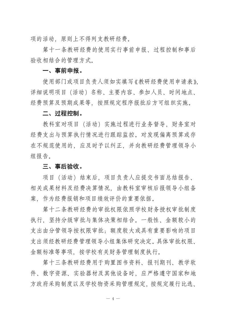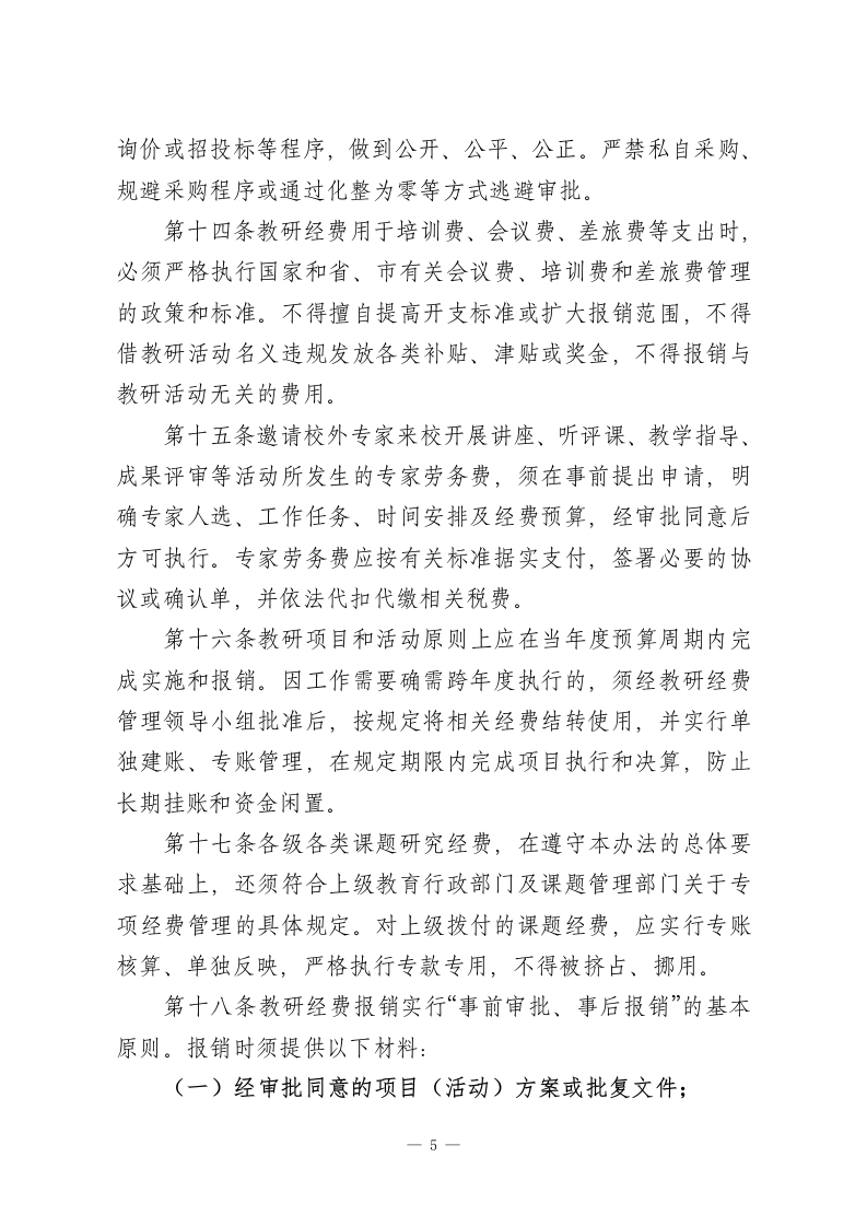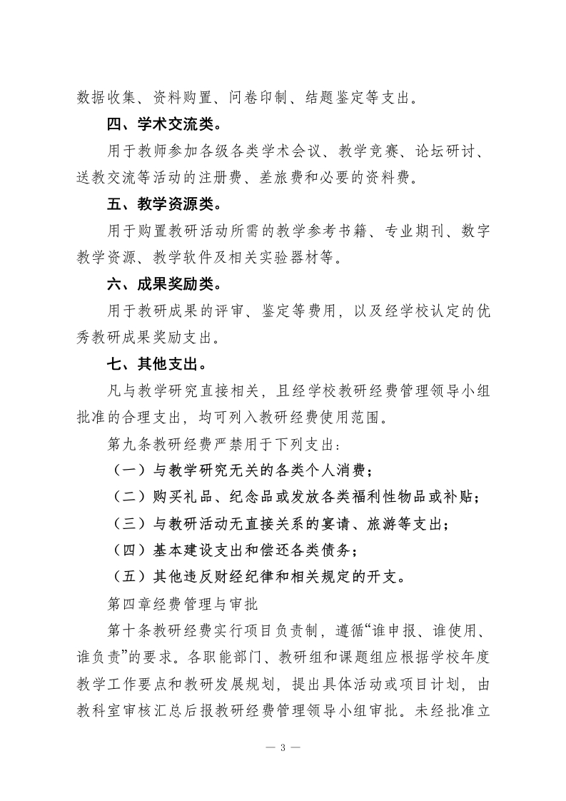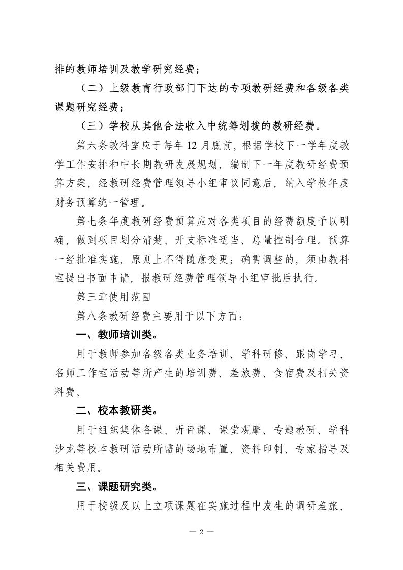 学校教学研究经费管理使用办法(2026年修订版)第一章总则第一条为加强学校教学研究经费的规范化管理与高效使用,充分发挥资金在促进教师专业发展和提升教学质量方面的作用,依据…以及省、市有关教育经费管理的相关规定,结合学校实际情况,制定本办法。第二条本办法所称教学研究经费,是指学校从公用经费及其他合法收入中统筹安排,用于支持教师开展教学研究、校本教研、课题攻关、学术交流和专业成长等活动的专项资金。第三条教研经费管理坚持以下基本原则:(一)统筹谋划、合理配置;(二)专款专用、注重实效;(三)程序规范、公开透明;(四)向一线教师倾斜、向课堂教学和实践环节倾斜。第四条学校设立教研经费管理领导小组。组长由校长担任,分管教学工作的副校长任副组长,教务处、教科室、总务处、财务室负责人及教师代表为成员。领导小组主要负责教研经费预算的审定、资金使用的监督以及绩效结果的评价。日常管理工作由教科室具体负责,财务室配合实施。第二章经费来源与预算第五条教研经费的主要来源包括:(一)学校年度公用经费预算总额中按不低于5%的比例安1