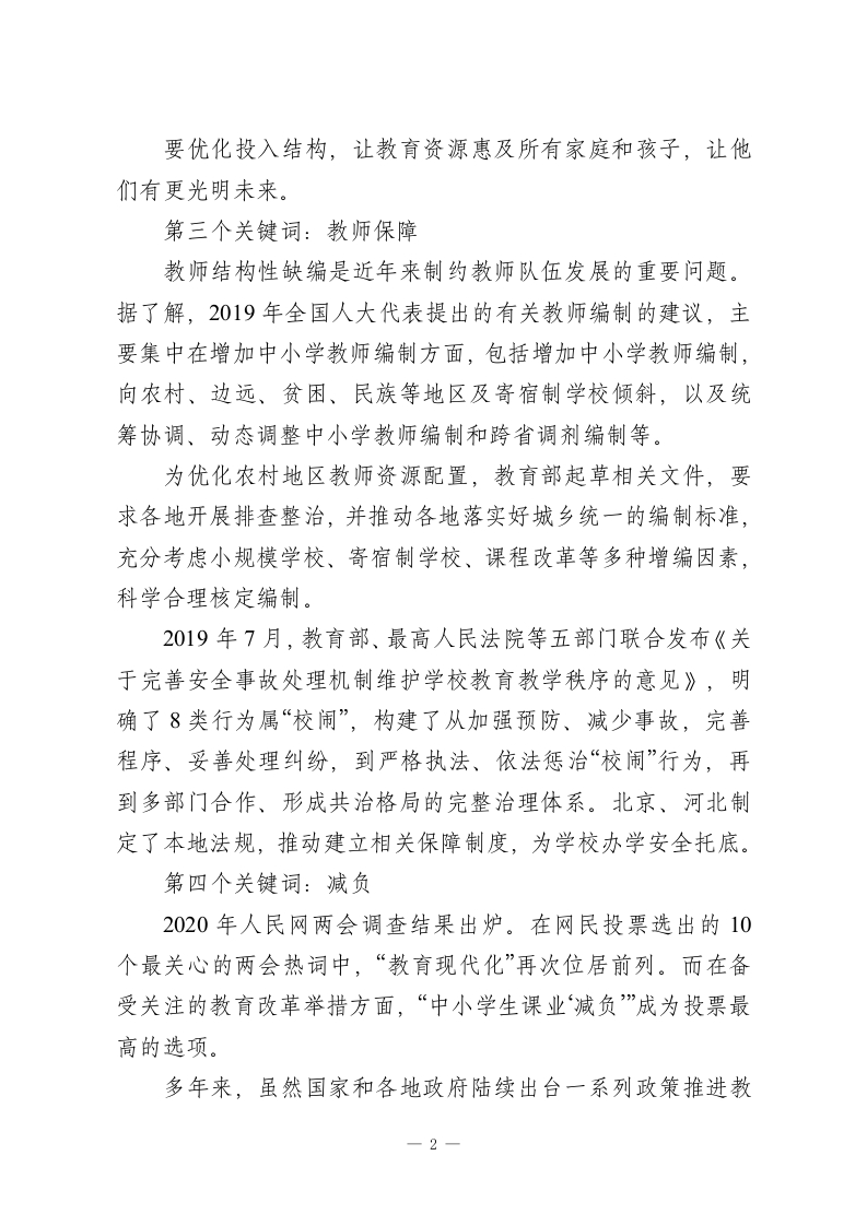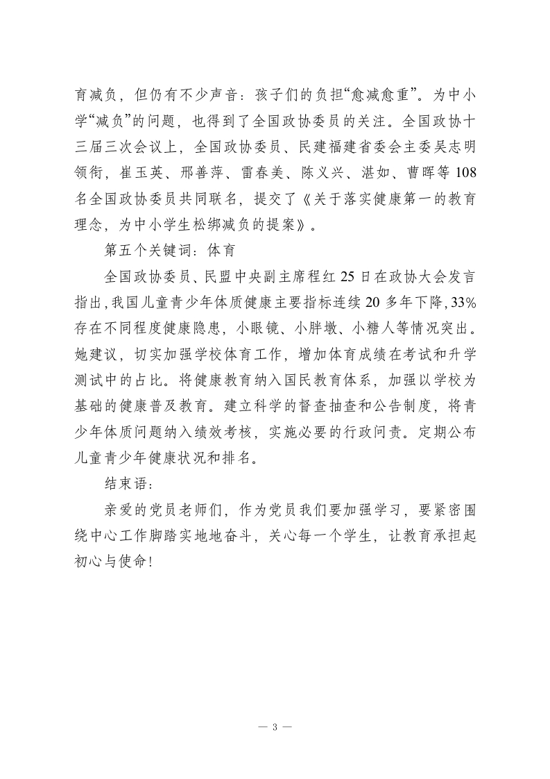 学校开展主题党日活动,校长带领全体党员教师学习领会两会精神各位党员老师:“聚焦全国两会,不忘教育初心”。全校党员干部不仅要埋头拉车更要抬头看路。这是一次胜利的大会,振奋人心,鼓舞干劲。作为教育工作者我们要认真学习领会,今天的主题党日活动上,我代表学校党支部和大家分享五个教育热词:第一个关键词:4%财政部部长刘XX明确表示,脱贫攻坚、义务教育等方面的重点支出只增不减。“推动教育公平发展和质量提升,必须在强化教育投入、确保落实4%目标上下功夫。今年的政府工作报告强调要大力优化财政支出结构,基本民生支出只增不减,重点领域支出要切实保障。显然,教育作为民生支出的第一大领域,是国家在安排今年财政支出时予以重点保障的基本民生事项。”全国人大代表、北京师范大学中国教育政策研究院执行院长张志勇说。第二个关键词:公平与质量要推动教育公平发展和质量提升。有序组织中小学教育教学和中高考工作。加强乡镇寄宿制学校和县城学校建设,办好特殊教育、继续教育,支持和规范民办教育,帮助民办幼儿园纾困。推进一流大学和一流学科建设。扩大高校面向农村和贫困地区招生规模。-1