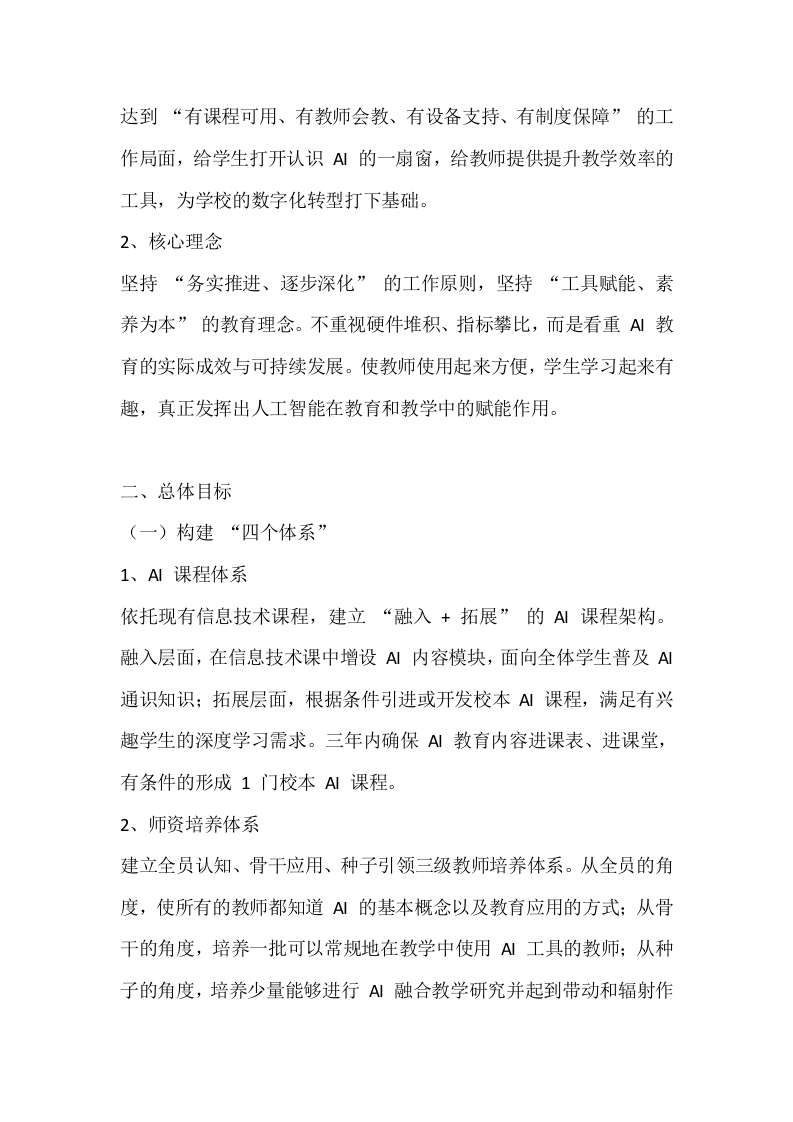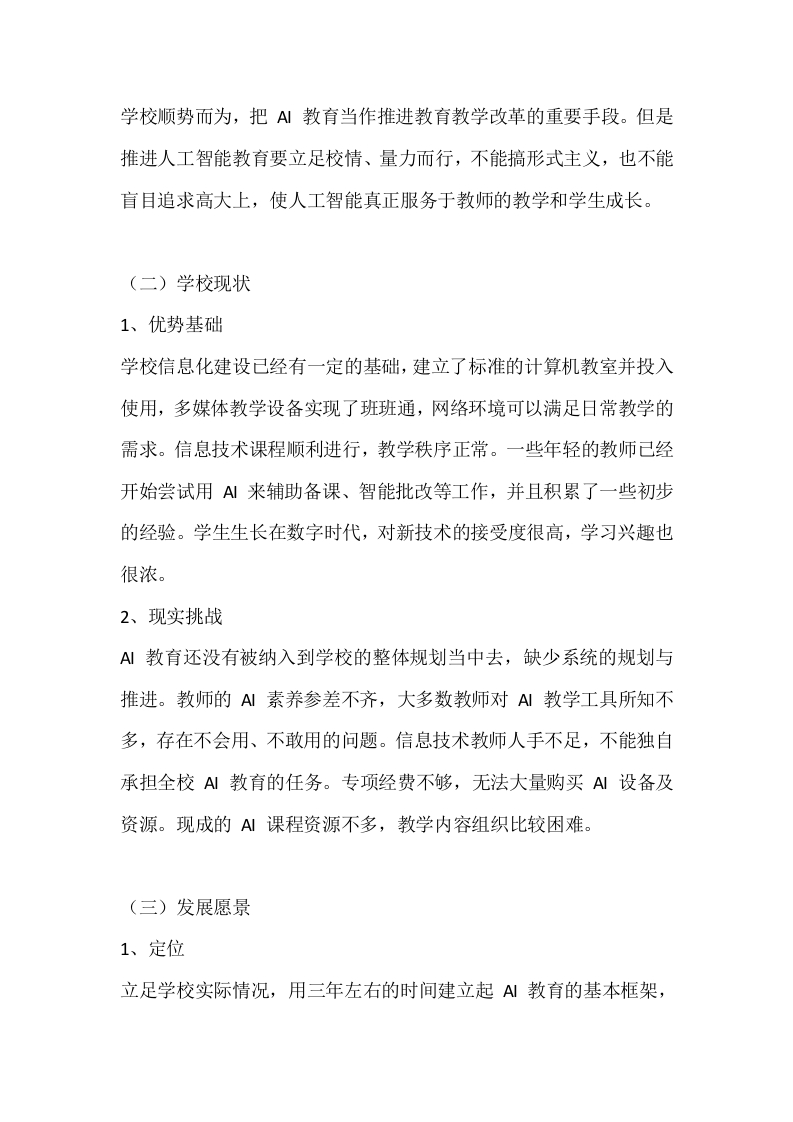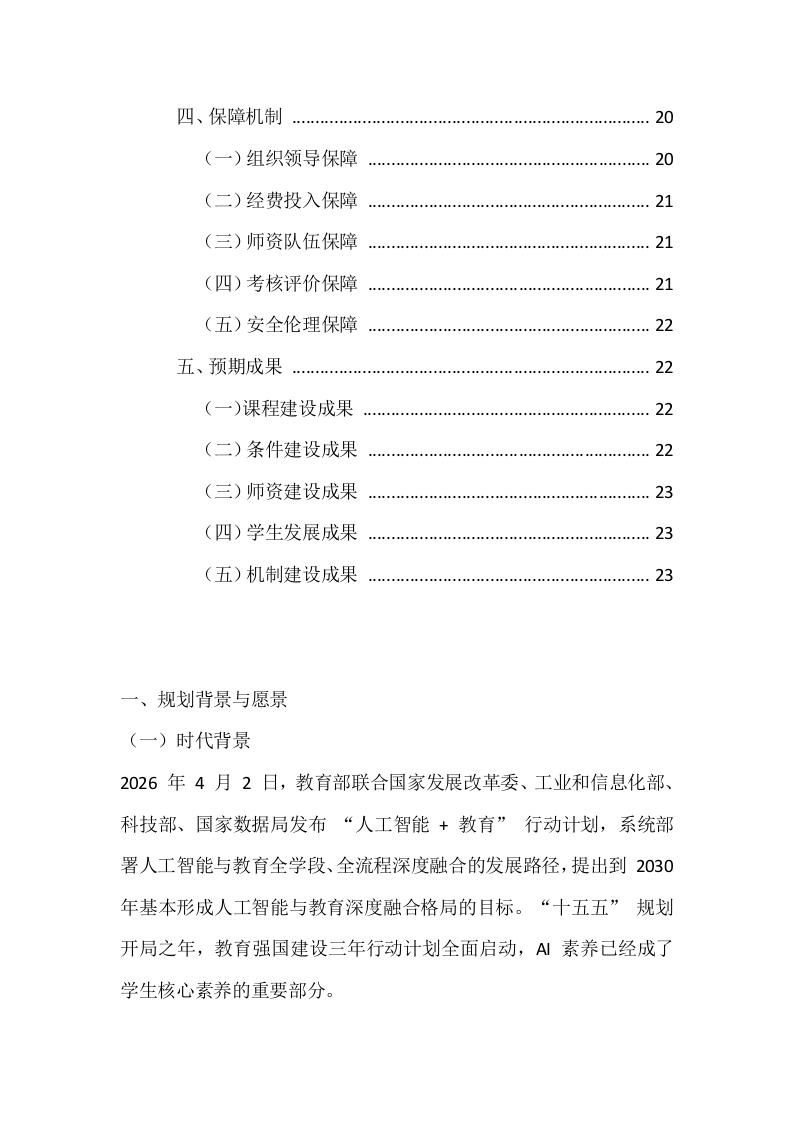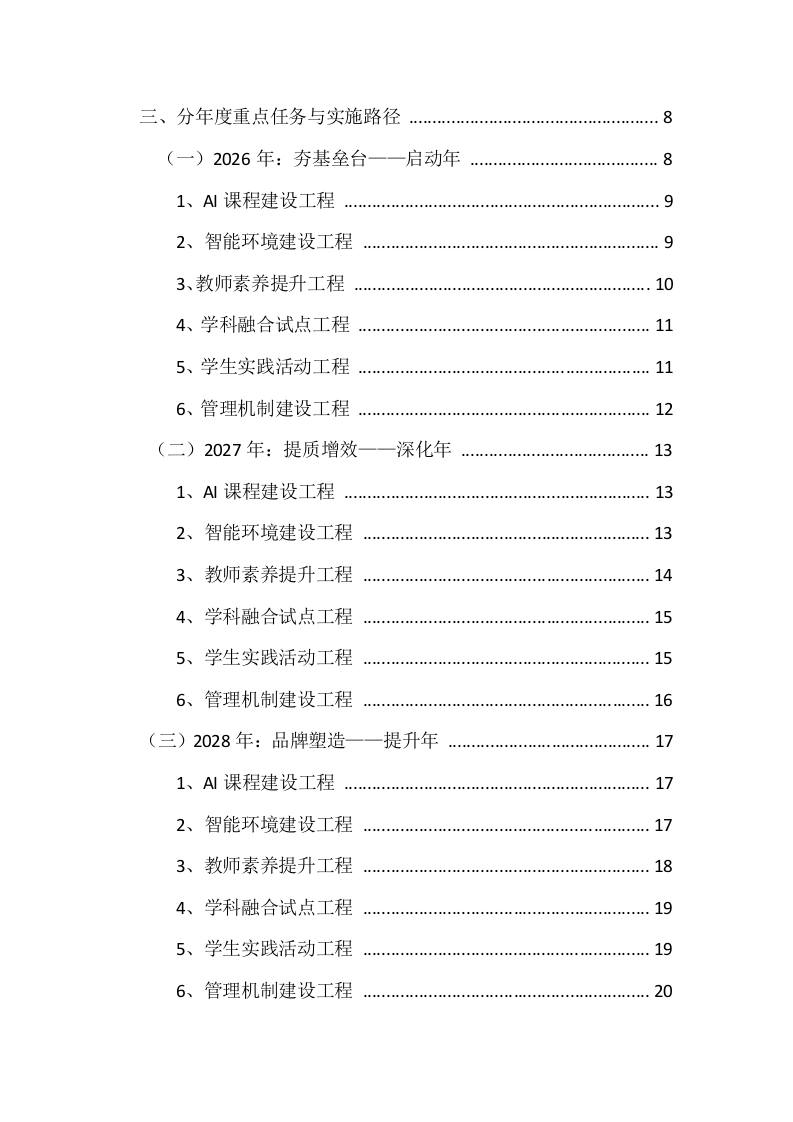 学校人工智能AI教育三年发展规划(2026-2028)tangqi8815小时前发布关注私信27.41KB24页03714 第1页 / 共24页 第2页 / 共24页 第3页 / 共24页 第4页 / 共24页 第5页 / 共24页 试读已结束,还剩19页,您可下载完整版后进行离线阅读 学校人工智能AI教育三年发展规划(2026-2028)此内容为付费资源,请付费后查看¥9.9¥19.9VIP会员免费立即购买您当前未登录!建议登陆后购买,可保存购买订单付费资源© 版权声明本站是一个信息分享及获取的平台,不确保部分用户上传资料的来源及知识产权归属,资料由老师投稿,公开渠道整理,网友上传,如果侵犯到您的权益,请联系客服删除THE END教师资料 文本预览 学校人工智能AI教育三年发展规划(2026-2028)目录一、规划背景与愿景,3(一)时代背景3(二)学校现状1、优势基础42、现实挑战…(三)发展愿景…1、定位52、核心理念…5二、总体目标...5(一)构建“四个体系”51、A课程体系.52、师资培养体系..63、条件保障体系,4.64、评价管理体系.7(二)实现“五个达成”.7(三)实施“六大工程”.8 查看更多 收起部分 喜欢就支持一下吧点赞14 分享QQ空间微博QQ好友海报分享复制链接收藏