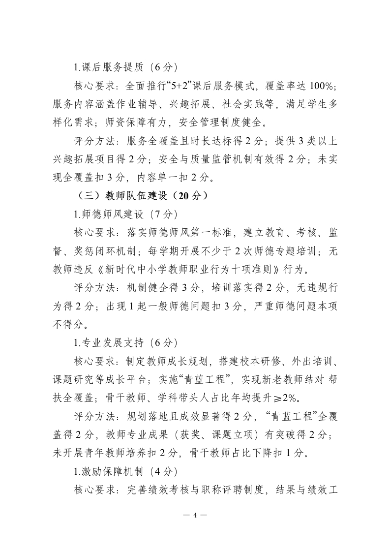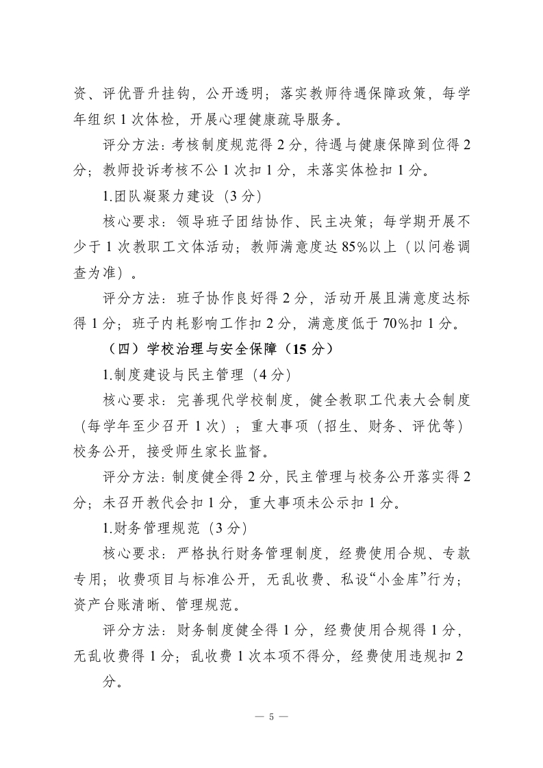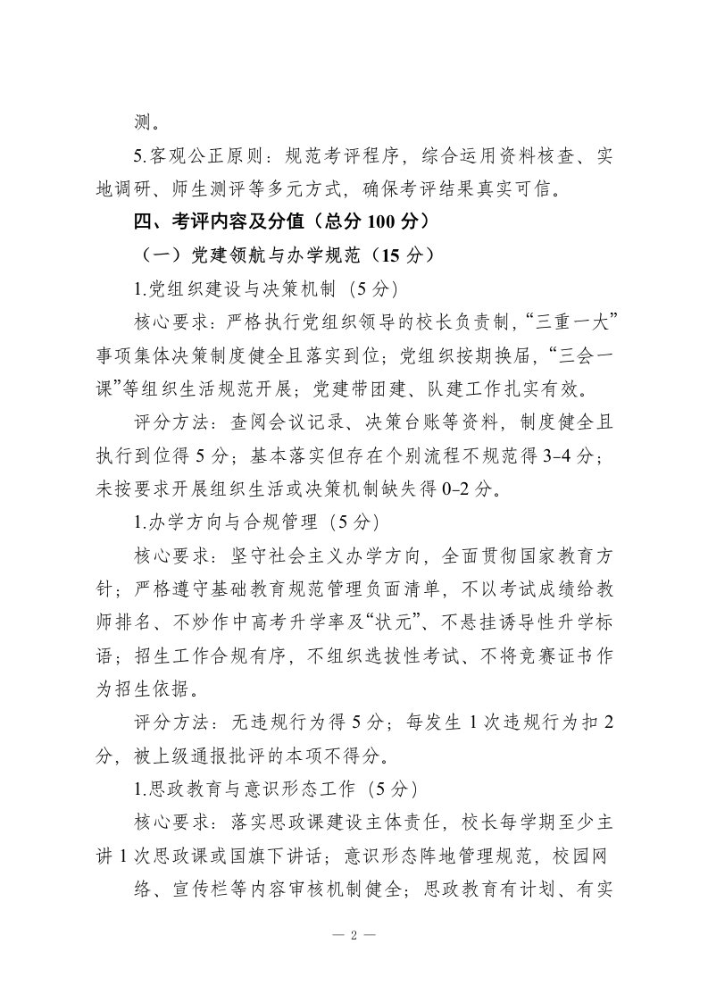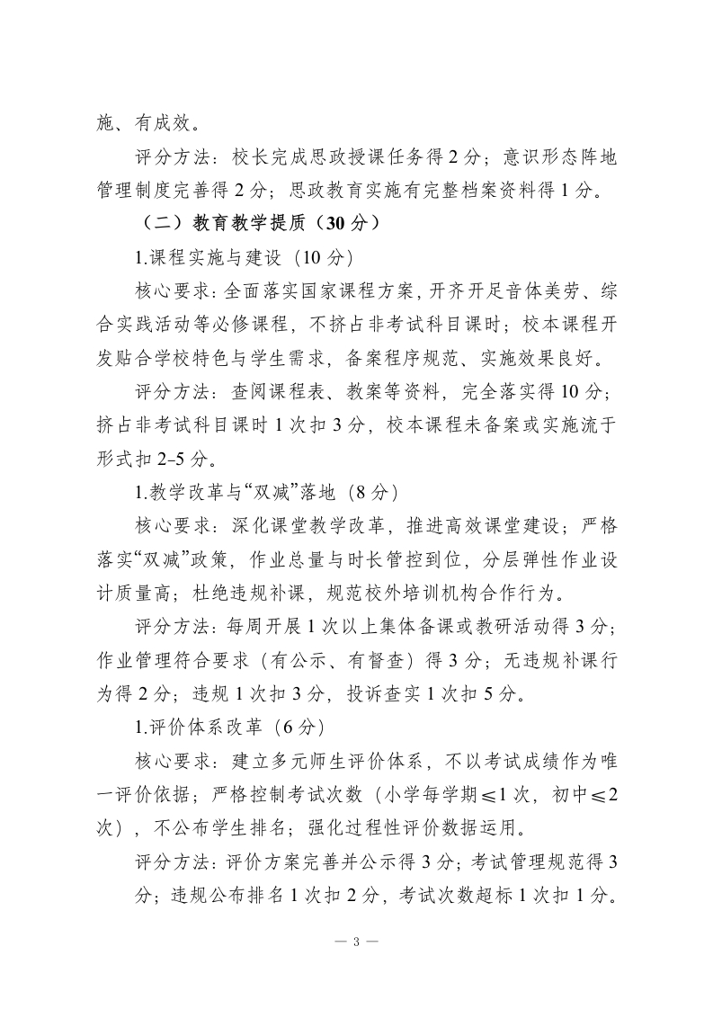 中小学校长履职质量综合考评实施办法(2026年修订版)一、制定依据为深入贯彻《教育强国建设规划纲要(2024-2035年)》《义务教育质量评价指南》及《深化新时代教育评价改革总体方案》要求,紧扣基础教育规范化建设三年行动计划部署,进一步健全校长履职考评体系,破除“唯分数、唯升学”导向,推动学校内涵式发展,特修订本办法。二、考评对象全区公办、民办中学、小学、九年一贯制学校、特殊教育学校、实验类学校(含实验小学、实验幼儿园)的校长(党组织书记)。各学校可参照本办法,结合办学规模与特色,制定副校级领导、分校区负责人及基层完小校长的差异化考评细则。三、考评原则1.党建统领原则:将党组织领导下的校长负责制落实情况作为考评核心,推动党建工作与教育教学深度融合,强化政治引领。2.育人为本原则:聚焦德智体美劳全面培养目标,突出素质教育导向,杜绝片面追求学业成绩的办学行为。3增值导向原则:以学校发展提升幅度、办学质量改善成效为核心评价依据,不简单以升学率、排名作为考评标准。4过程结果融合原则:兼顾日常管理实效与年度发展成果,强化对课程建设、教师成长、校园治理等关键环节的过程性监1