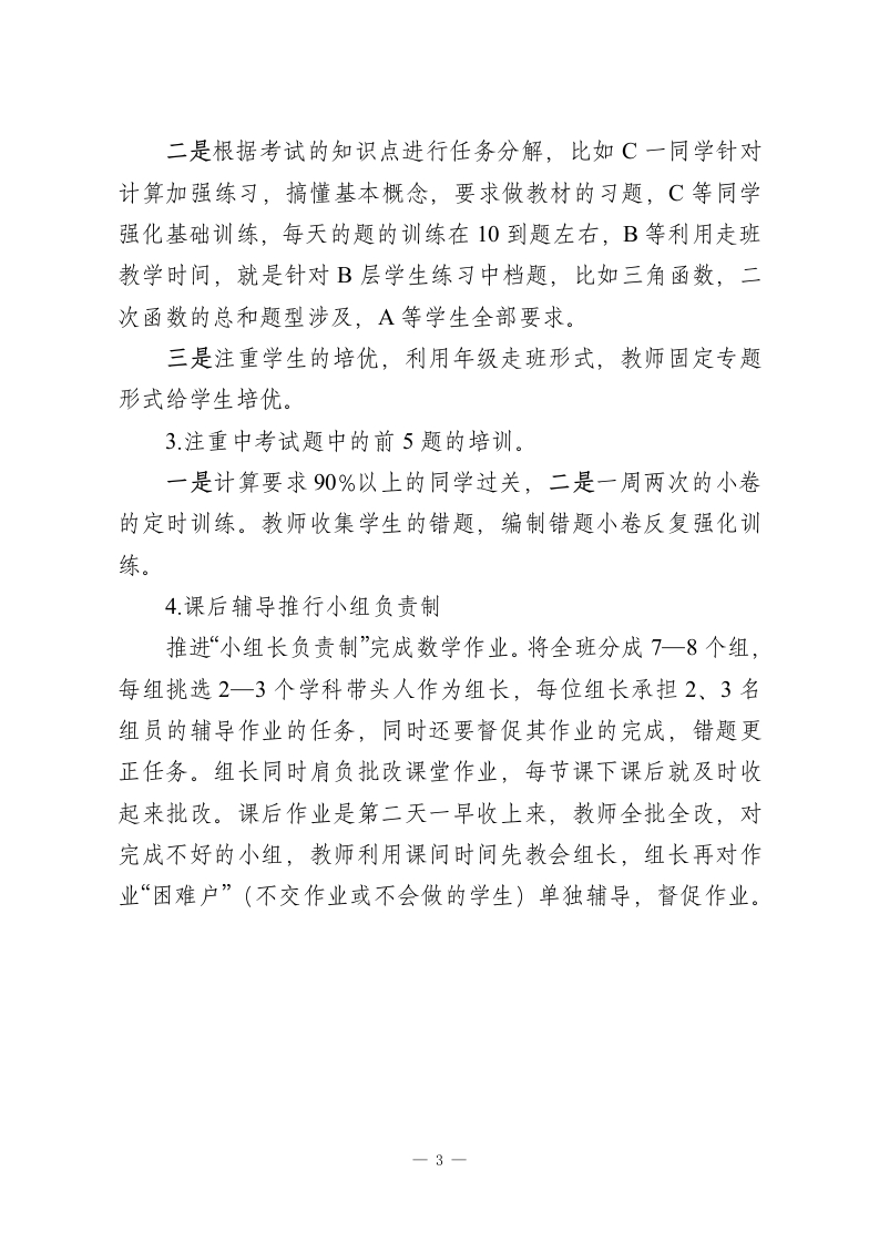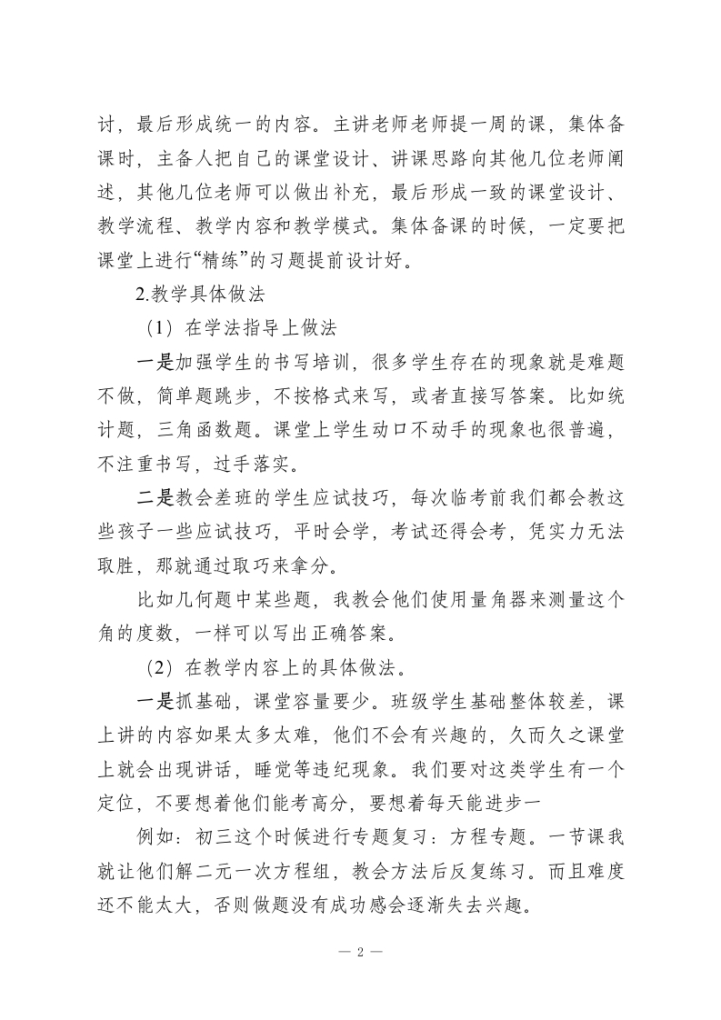 中学校长在九年级数学教研会上的发言各位老师,各位兄弟姐妹:大家下午好!作为X初中数学大家庭的一员,站在这里发言,我非常高兴,但同时也倍感压力。目前我们区初中数学教研定位准,教研氛围浓厚、青年教师蓬勃发展。我知道我们学校的教学成绩离区内中心城区还有很大的差距。今天我介绍一下我们初中数学组的一些做法。一、学校制度保障和要求在建设教育强区的背景下,学校对教育教学质量提出了更高的要求。我们学校实施了一项措施和一个机制,制定了两个制度。一项措施是学校给年级下教学目标,年级给班级下任务目标,班级给科任下目标,教师的个人考核就与目标相关。一个竞争,是班级数量较少,目前都是平行分班,考试完年级组开成绩分析会,亮成绩,达到红红脸,出出汗的目的。两个考核制度上直接与教师绩效有关联,一个是学期的教学综合考核,以学期为单位,要打出每个教师的教学成绩,在全校教师中晒,另一个是教研考核,以整个学科的成绩为主体,主要是促进学科教研组建设。二、教研组具体做法1资料共享,集体教研,资料准备,分工合作、任务明确。常规教研分为组内教研和集体备课活动,组内教研主要的是集体备课,集体备课前,由备课组长提前分工,先由老师个人“主备”一周或一章节内容的课,集体备课时再进行研-1
