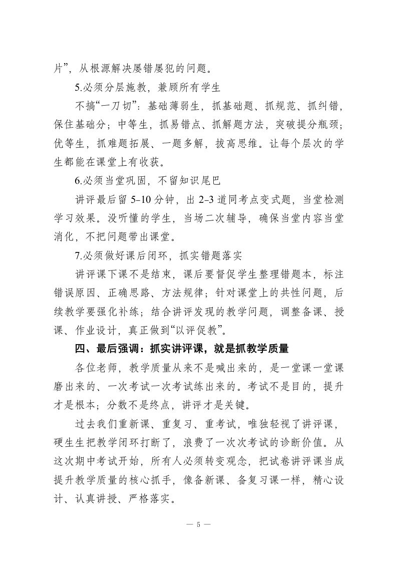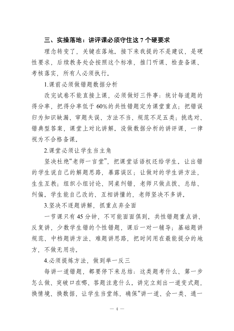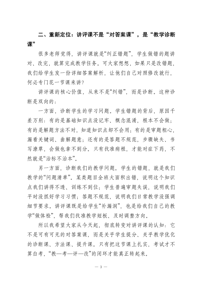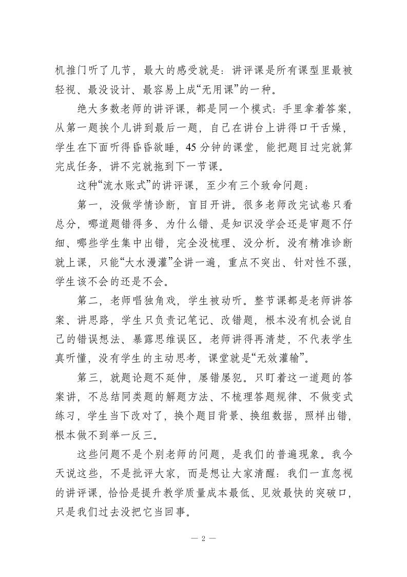 抓实试卷讲评课激活教学提质效一一期中考后教学专题会校长发言各位老师:大家好!刚才教务处已经把本次期中考试的整体成绩、各年级学科的学情数据、失分关键点都做了全面通报,相信大家对现阶段的教学效果、学生的学习情况都心里有数了。今天我不想再重复罗列分数、对比排名,想和大家聊一个关乎教学质量核心的实在问题:我们一学期要组织月考、段考、期中、期末等大大小小好几次考试,可这些考试的真正价值,我们真的挖透了吗?说实话,我观察下来,答案是没有。很多时候我们的考试都走了“流程化”的老路:考前带着学生拼命复习,考中严格组织监考,考后抓紧批改出分,分数一公布、排名一公示,就匆匆忙忙开启下一阶段的新课教学。考试在我们手里,仅仅成了一个“阶段性结束的句号”,完全没发挥出诊断问题、查漏补缺、倒逼教学的关键作用。而把考试价值从“纸面分数”变成“实际提分”的核心环节,就是试卷讲评课。讲评课上得好不好、实不实,直接决定了考试有没有白考、学生有没有真提升,更直接决定了我们的教学能不能形成“教一考一评一改”的良性闭环。今天我就围绕这个核心,和大家把讲评课的问题、定位、实操方法讲透、讲实。一、直面现状:我们的讲评课,藏着太多低效问题这段时间,教务处跟着听了不少考试后的讲评课,我也随1