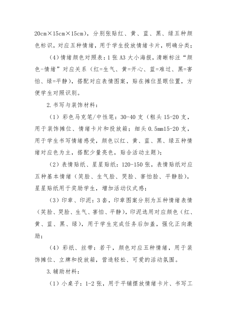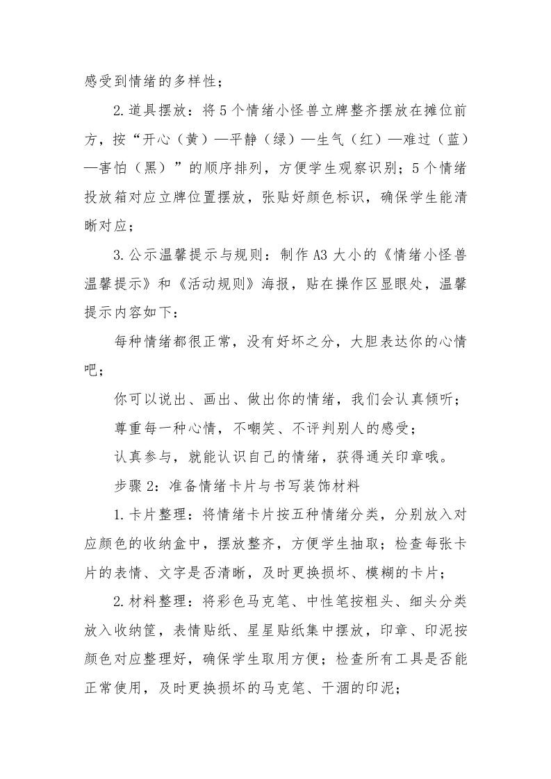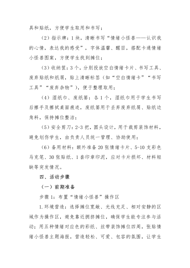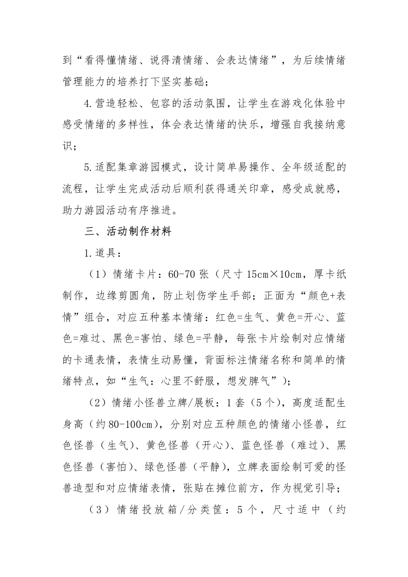 2026年学生心理游园活动情绪小怪兽活动名称活动目的备注通过颜色、表情、动作与情情绪小怪兽绪的练习,让学生做到“看心理游园活动得懂情绪、说得清情绪、会情绪小怪兽表达情绪”,为后续情绪管理能力的培养打下坚实基础。心理游园活动一一情绪小怪兽一、活动名称情绪小怪兽一一认识我的心情二、活动目标1.帮助学生认识开心、生气、难过、害怕、平静五种基本情绪,明确每种情绪的特点,知道情绪没有好坏之分,学会接纳自己的各种心情,不排斥、不压抑负面情绪:2.引导学生学会用简单的语言、表情、动作表达自己的情绪,提升情绪觉察能力和表达能力,减少因情绪认知不清带来的哭闹、发脾气、沉默寡言等不良行为:3.通过颜色、表情、动作与情绪的对应练习,让学生做