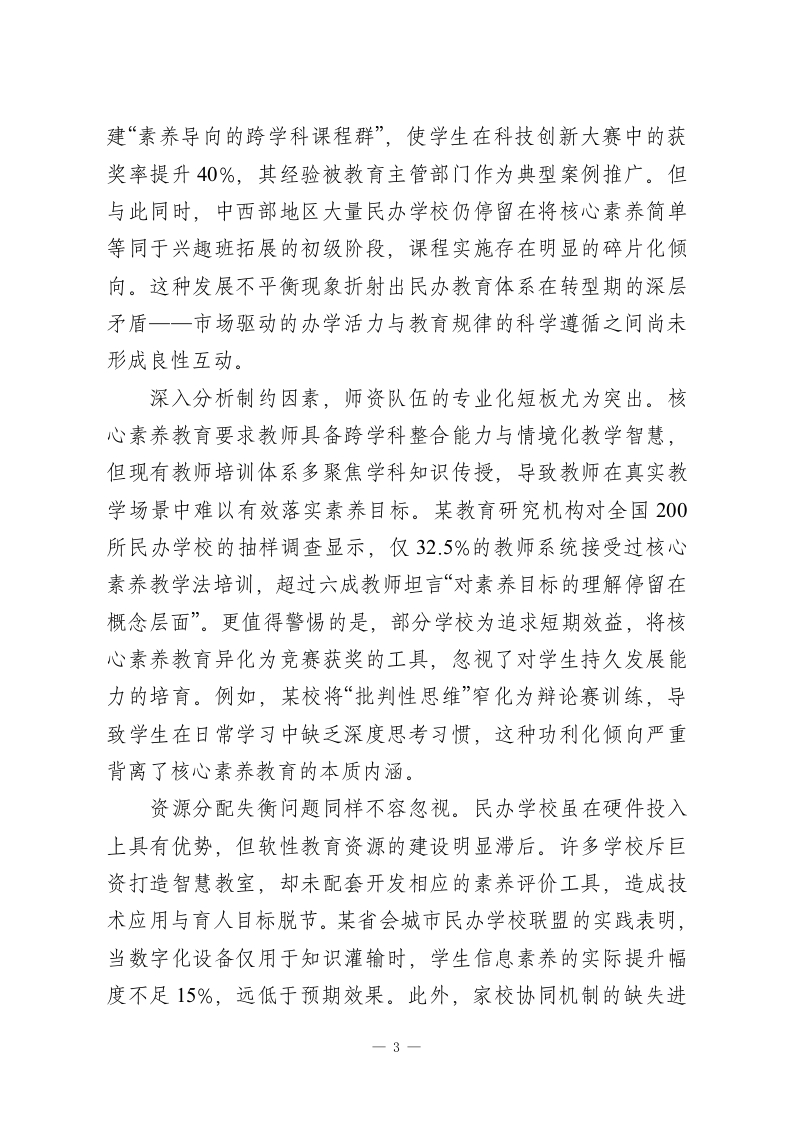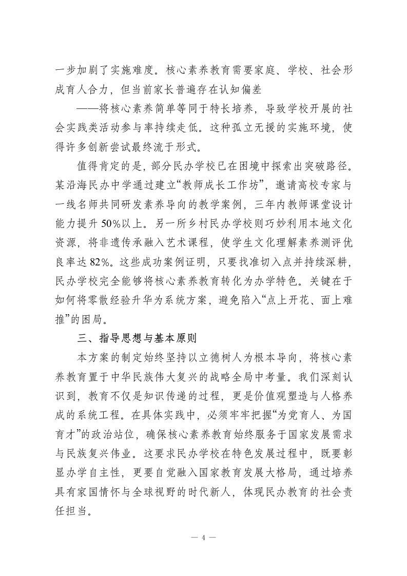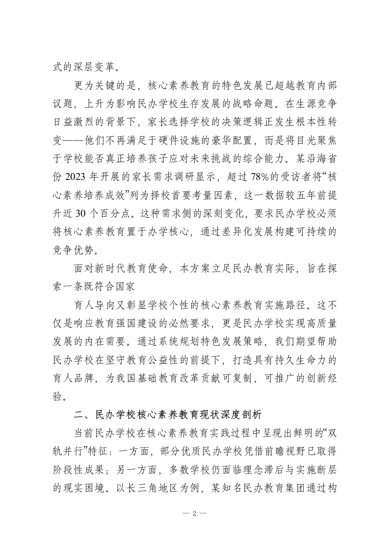 《民办学校核心素养教育特色发展方案设计》一、前言:时代背景与战略意义在当今全球教育变革浪潮中,核心素养教育已从理论探讨逐步走向实践深化,成为重塑教育生态的关键支点。随着我国《中国教育现代化2035》战略的深入推进,教育评价体系正经历从知识本位向能力本位的历史性转型,核心素养作为学生适应未来社会发展的必备品格与关键能力,其培养成效直接关系到国家人才战略的实施质量。民办教育作为国民教育体系的重要组成部分,凭借其机制灵活、创新活跃的天然优势,在核心素养教育领域展现出独特的探索潜力。然而,当前教育市场供需结构发生深刻变化,家长群体对教育品质的期待已从单纯追求升学率转向关注学生综合素养的全面发展,这种需求升级倒逼民办学校必须重新审视自身定位,将核心素养教育融入办学基因。值得注意的是,近年来基础教育领域出现的“内卷化”现象与“双减”政策的落地实施,为民办学校提供了难得的转型契机。当公办学校在标准化管理框架下推进改革时,民办学校恰恰可以发挥自主决策权大的特点,通过特色化路径破解同质化竞争困局。例如,部分先行地区民办学校尝试将项目式学习与社区服务相结合,不仅显著提升了学生的批判性思维与社会责任感,更在区域教育质量评估中获得高度认可。这种实践启示我们,核心素养教育绝非简单的课程叠加,而是需要系统重构育人模1