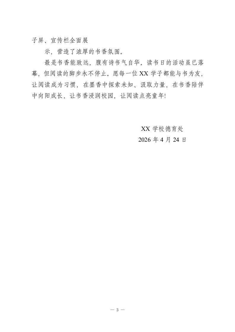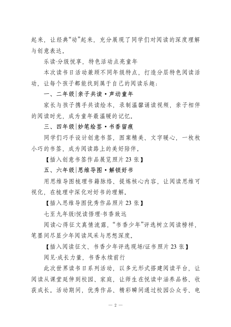 2026年学校世界读书日系列活动圆满落幕春风拂校园,书香润童心。为迎接第29个世界读书日,深化书香校园建设,XX学校于4月20日一4月24日精心开展“书海拾光,阅读‘悦'成长”主题系列阅读活动。全校师生全员参与,在多样的阅读实践中品书香、悟真知、展风采。为期五天的读书盛宴圆满落幕,无数温暖有趣的阅读瞬间,定格成校园里最动人的风景。启读·书香满园,仪式点亮阅读初心4月20日升旗仪式上,学校读书节启动仪式正式拉开帷幕。校长发表读书动员讲话,传递阅读育人的理念;教师代表倾情推荐经典书目,学生代表发出全员阅读倡议。庄重又温馨的仪式,点燃了全校师生的阅读热情,让“爱读书、读好书、善读书”的种子扎根校园。趣读·书香漂流,跳蚤市场焕新书香4月23日世界读书日当天,校园图书跳蚤市场热闹开市。各班创意布置摊位,学生化身“小摊主推销员”,将家中闲置的绘本、名著、课外书进行交换与义卖。创意海报、趣味吆喝、友好交易,让闲置图书焕发新生,书香在校园里自由流动,孩子们在分享中收获快乐与成长。演读·书香传韵,经典演绎绽放光彩4月24日下午,经典课本剧/校园剧展演精彩上演。各班围绕经典名著、课文故事、红色经典、传统文化编排节目,融入朗诵、歌舞、情景再现等形式,5一8分钟的精彩演绎,让文字“活”1