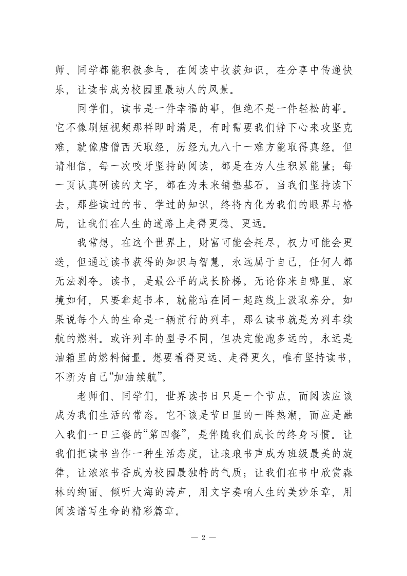 2026世界读书日,校长国旗下讲话:在阅读中遇见更好的自己,在书香中成就精彩人生亲爱的老师们、同学们:大家早上好!今天,我们站在国旗下,共同迎来一个充满书香与智慧的日子一2026年4月23日,第31个世界读书日。当五星红旗迎着朝阳冉冉升起,当校园的清风拂过耳畔,我们再次聚焦“读书”这个永恒的话题。在这个快节奏的时代里,读书是我们与世界对话的桥梁,是沉淀心灵的港湾,更是我们成长路上最珍贵的养分。读书,是一场跨越时空的精神之旅。翻开史书,我们能与孔孟论礼、与老庄谈道,知晓中华文明的源远流长,明白我们从何处走来;品读世界名著,我们能漫步巴黎街头、驰骋非洲草原,了解不同文明的精彩绽放,认清我们在世界中的位置;研读前沿著作,我们能触摸科技的脉搏、洞察未来的趋势,明确我们要向何处前行;而与经典对话、与自我审视的过程,更能让我们在文字中照见本心,成为更清醒、更坚定的自己。正如古人所言“问渠那得清如许,为有源头活水来”,读书就是为我们的人生注入源源不断的活水。在数字化浪潮席卷的今天,读书的形式早已突破传统界限。除了墨香四溢的纸质书籍,电子阅读器、数字图书馆、有声读物等多元形式,让阅读变得更加便捷、更加个性。希望每位老1