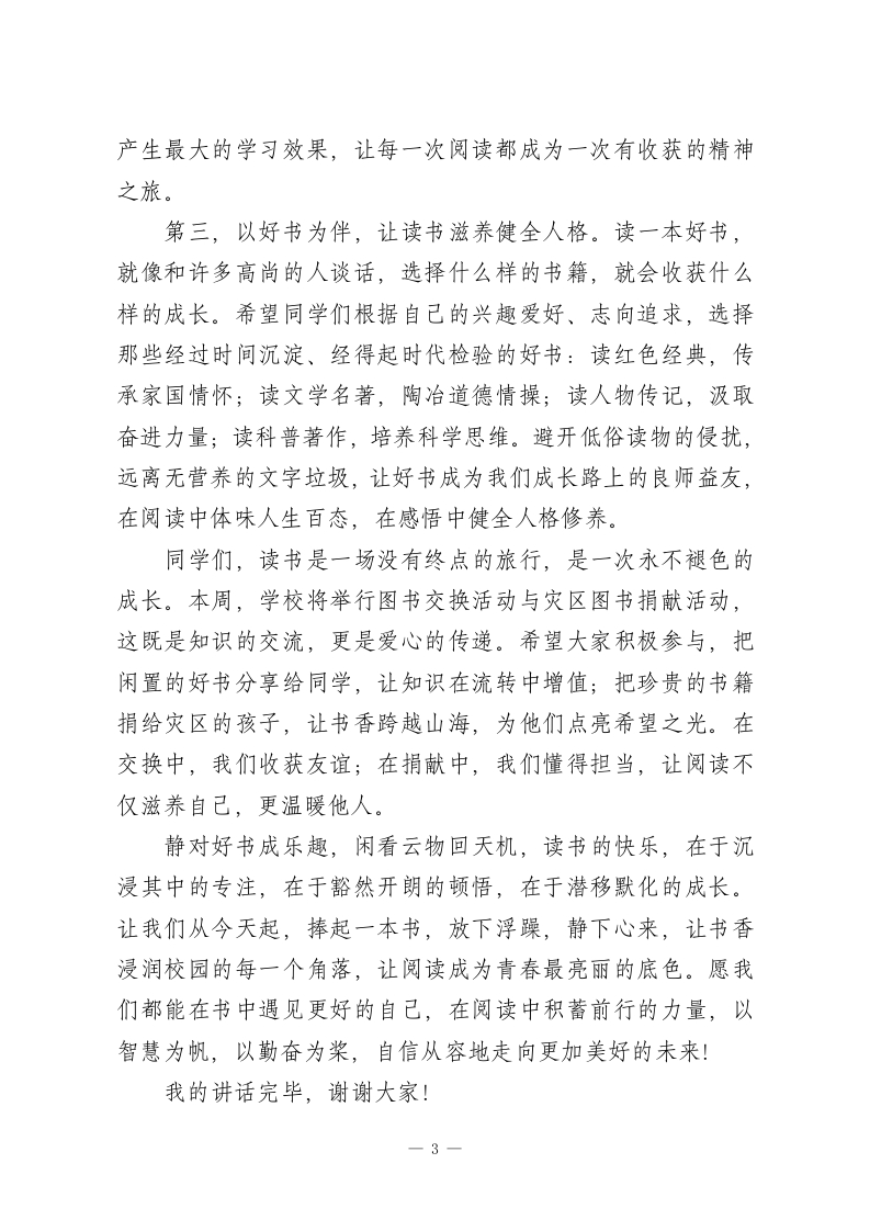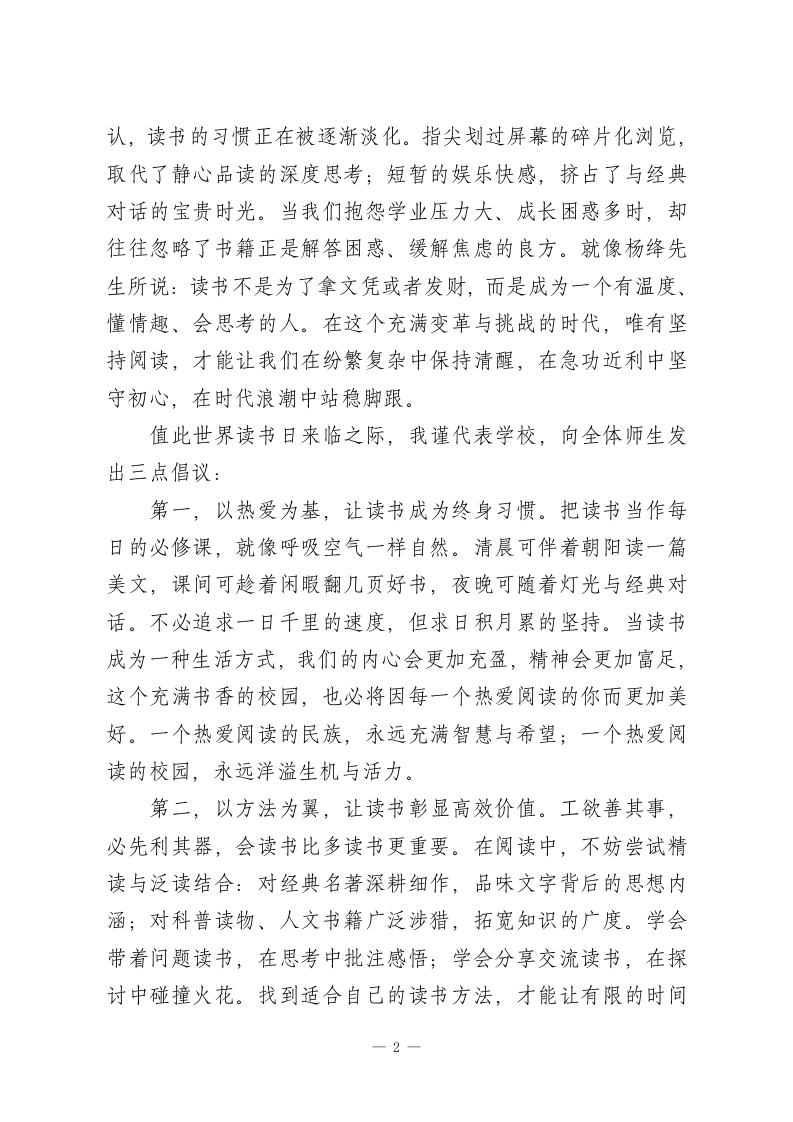 2026世界读书日,校长国旗下讲话:让书香浸润青春,让阅读照亮征程亲爱的老师们、同学们:大家早上好!春和景明,万物勃发,在这充满生机与希望的季节里,我们又一次迎来了珍贵的精神盛宴一第31届世界读书日。1995年,联合国教科文组织将4月23日定为世界读书日,这个特殊的日子,既是西班牙文豪塞万提斯、英国戏剧大师莎士比亚的辞世纪念日,更成为了全世界读书人共同的精神坐标,承载着人类对知识的敬畏、对智慧的追求。回溯中华文脉,读万卷书,行万里路的古训早已融入民族的血脉。从孔子韦编三绝研读《易经》,到宋濂冒雪求书终成大家;从凿壁偷光的勤学佳话,到囊萤映雪的励志传奇,中华民族从来就是热爱学习、勤奋读书的民族。书籍,是传承文明的载体,是滋养心灵的沃土,更是人类进步的阶梯。对我们而言,读书是成长路上最温暖的陪伴:读史,可鉴古今、知兴替,让我们在岁月长河中汲取前行的力量;读文,可明事理、修心性,让我们在文字世界里涵养高尚的情操;读科普,可探未知、启智慧,让我们在科学殿堂里拓展认知的边界。读书,能拓宽我们的眼界,让渺小的个体拥有广阔的世界;读书,能引导我们明理,教会我们如何做一个有温度、有修养的人;读书,更能提升我们的能力,帮助我们养成受益终身的学习习惯。然而,在这个信息爆炸、节奏飞快的时代,我们不得不承1