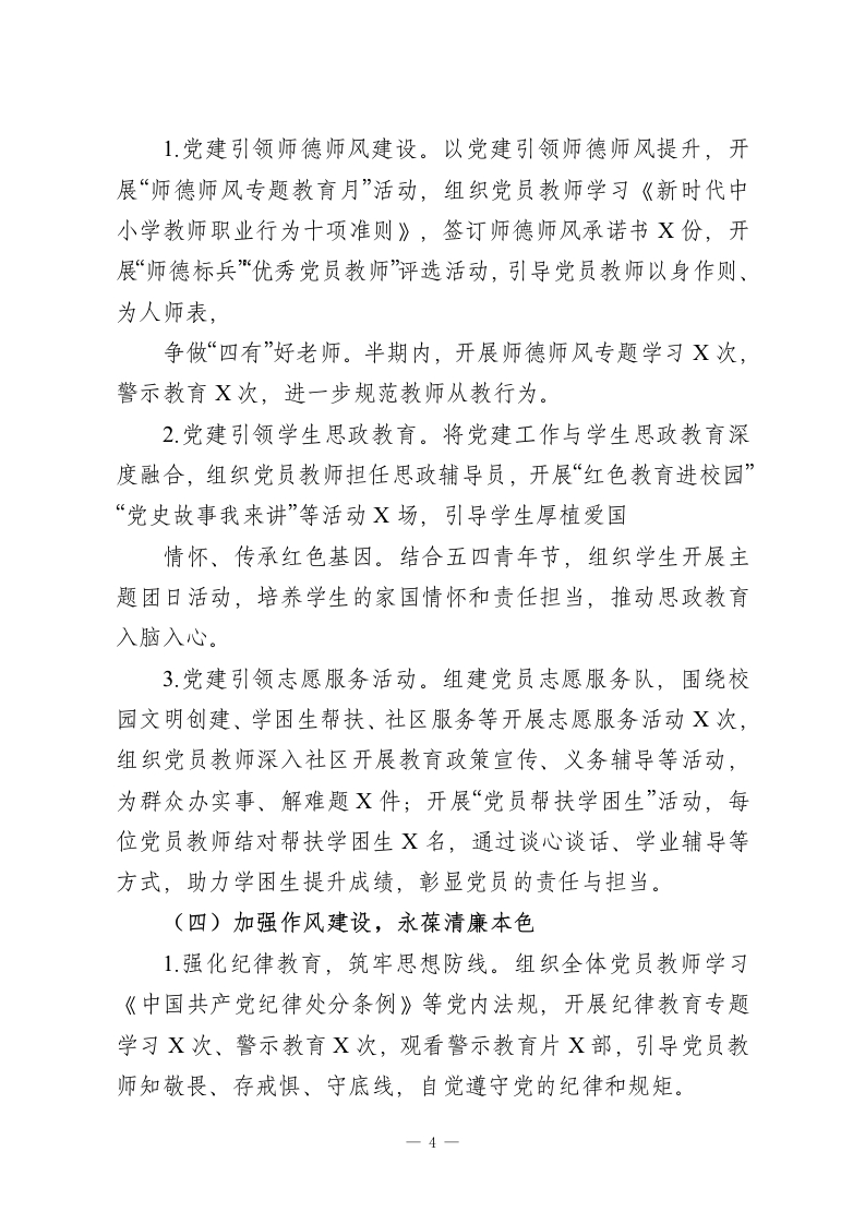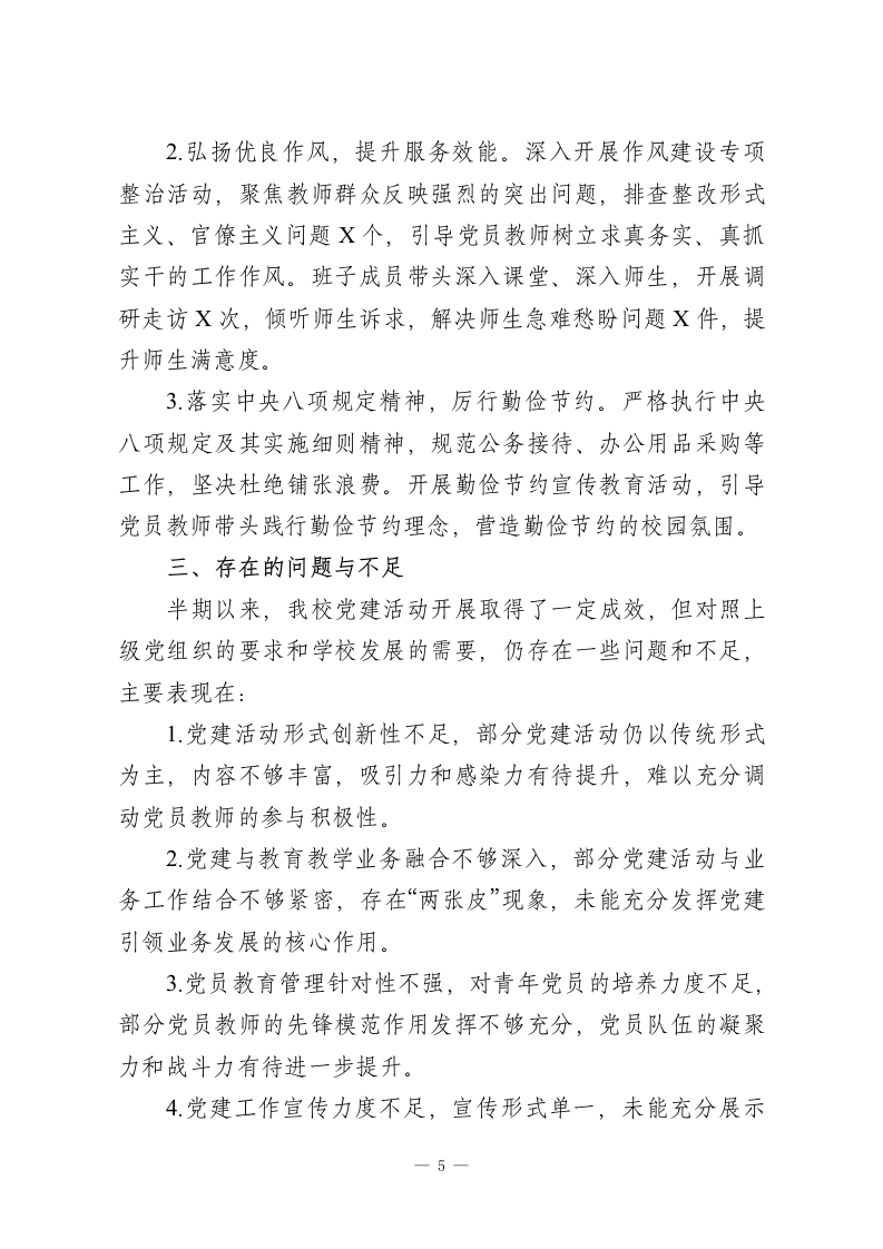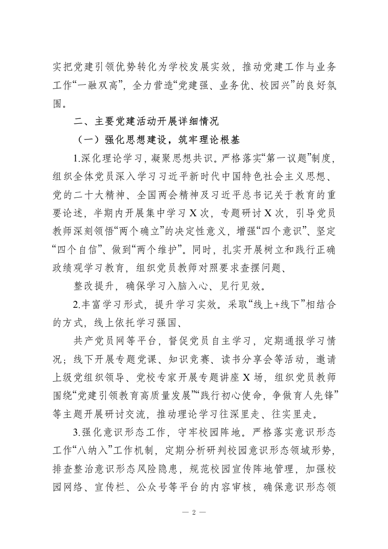 XX学校2026年春季学期半期学校党建活动开展情况汇报2026年是“十五五”规划开局之年,也是中国共产党成立105周年,为深入学习贯彻党的二十大和二十届历次全会精神,扎实开展树立和践行正确政绩观学习教育,紧扣立德树人根本任务,推动党建工作与学校教育教学中心工作深度融合、同频共振,我校党委(党支部)以“党建领航、强基固本、融合创优”为工作主线,扎实推进各项党建活动开展,切实增强基层党组织的政治功能和组织功能,现将本学期半期(1-4月)党建活动开展情况汇报如下:一、半期党建工作总体概况本学期半期以来,我校党建工作严格按照上级党组织部署要求,坚持以习近平新时代中国特色社会主义思想为指导,聚焦政治建设、思想建设、组织建设、作风建设、纪律建设,把制度建设贯穿其中,深入开展各类党建活动,着力夯实党建工作基础,提升党建工作质效。半期内,共召开党委(党支部)会议X次、支委会X次、党员大会X次,开展主题党日活动X次、专题学习研讨X次、志愿服务活动X次,组织党员培训X期,发展入党积极分子X名,各项党建活动有序推进、成效显著,为学校教育教学高质量发展提供了坚强的政治保障和组织保障。我校始终坚持党建引领教育教学工作,将党建活动与师德师风建设、学生思政教育、校园文化建设等工作紧密结合,切-1