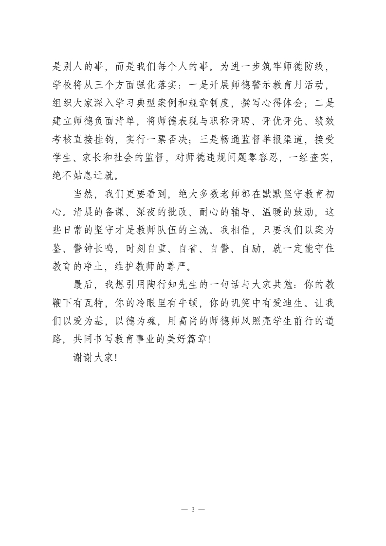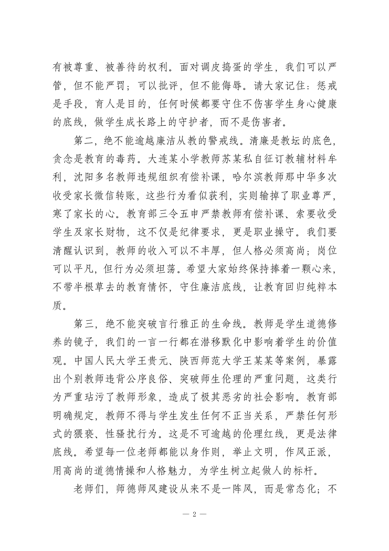 校长在师德师风会议上讲话:以案为鉴守底线,以德施教育新人各位老师:大家上午好!今天我们召开这场专题会议,没有冗长的客套,只有沉重的警醒和殷切的期盼。近期,从大连通报的违规征订教辅材料牟利案,到济南、陕西发生的体罚学生事件,再到令人愤慨的性骚扰、学术不端等典型案例,每一起都像一记警钟,在我们耳边轰然作响。这些案例中的当事人,曾经也是站在三尺讲台的教育者,却因一时糊涂、一念之差触碰了师德红线,最终不仅断送了自己的职业生涯,更给学生成长带来了难以磨灭的伤害,给教育事业抹了黑。教育部早已明确指出,师德师风是评价教师队伍素质的第一标准。作为教育工作者,我们手中握着的是无数家庭的希望,肩上扛着的是立德树人的使命。学高为师,身正为范从来不是一句口号,而是融入血脉的职业准则。结合近期案例和《新时代中小学教师职业行为十项准则》要求,我想和大家重申三个绝不能:第一,绝不能触碰伤害学生的高压线。教育的本质是爱与守护,而不是惩罚与伤害。济南育英中学田某某因学生违反纪律就实施体罚,陕西旬邑县职教中心贺某、刘某用不当方式教育学生,这些行为不仅违反了关心爱护学生的准则,更突破了为人师表的基本底线。每个学生都是独一无二的生命个体,都1