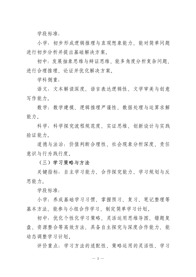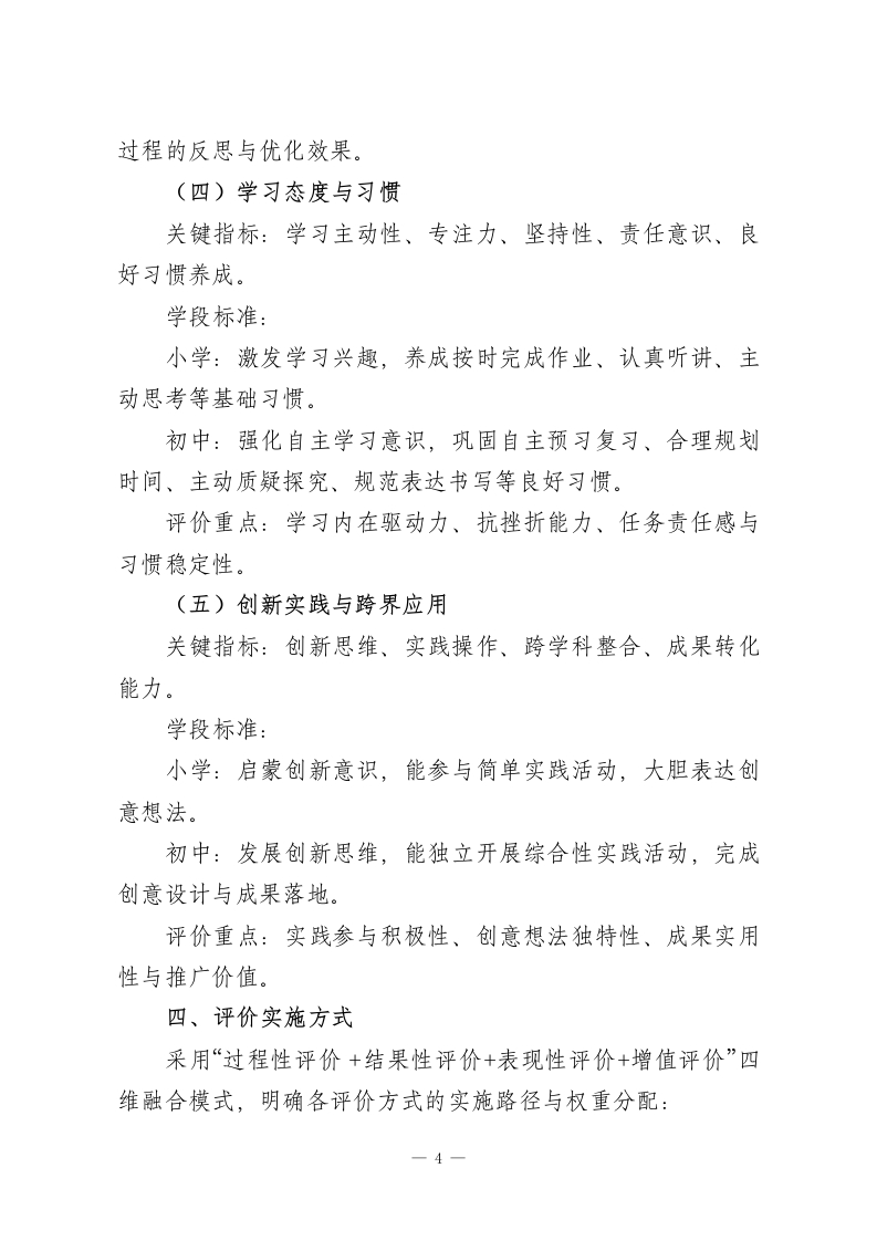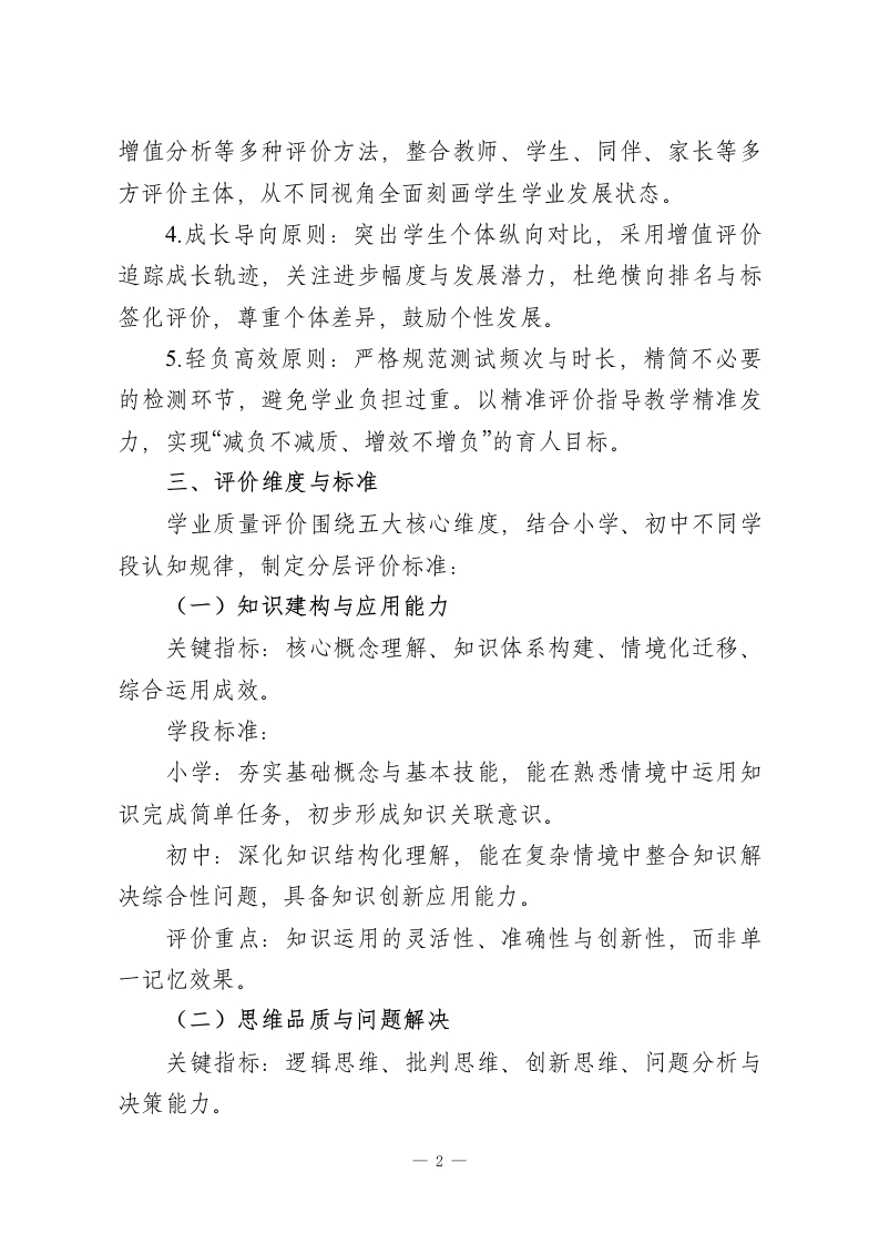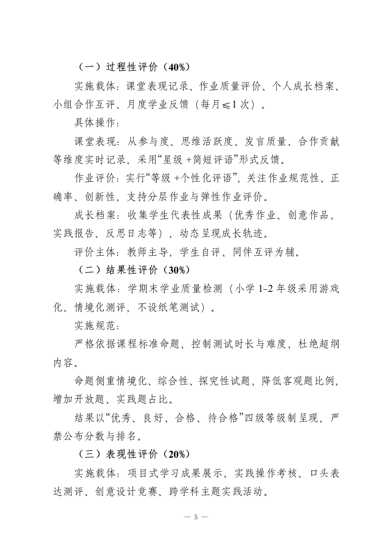 义务教育阶段学业质量评价实施办法(2026年修订版)为深入落实立德树人根本任务,全面推进教育评价改革,依据《深化新时代教育评价改革总体方案》《义务教育质量评价指南》《义务教育课程方案和课程标准(2022年版及2025年日常修订版)》等国家相关政策文件,结合本校办学特色与教育教学实际,特制定本办法。一、核心理念以学生全面发展为核心,锚定学科核心素养培育目标,立足课程标准学业质量要求,构建“评价一教学一成长”联动机制,打破“唯分数”评价壁垒,通过科学、多元、发展性的评价体系,引导教学提质增效,促进学生自主成长,助力学校教育质量持续升级。二、评价原则1.素养引领原则:聚焦学生在真实生活场景中运用知识解决实际问题的能力,弱化机械记忆类评价内容。评价标准严格对标课程标准学业质量描述,推动评价重心从“知识掌握”向“素养发展”转移。2.教评协同原则:确保评价目标与课程目标、教学目标同频共振,评价方式与教学组织形式适配,评价结果直接服务于教学优化。形成“教学目标一评价设计一教学实施一结果反馈一教学改进”的闭环生态。3.多元立体原则:融合纸笔测试、实践展示、过程记录、-1