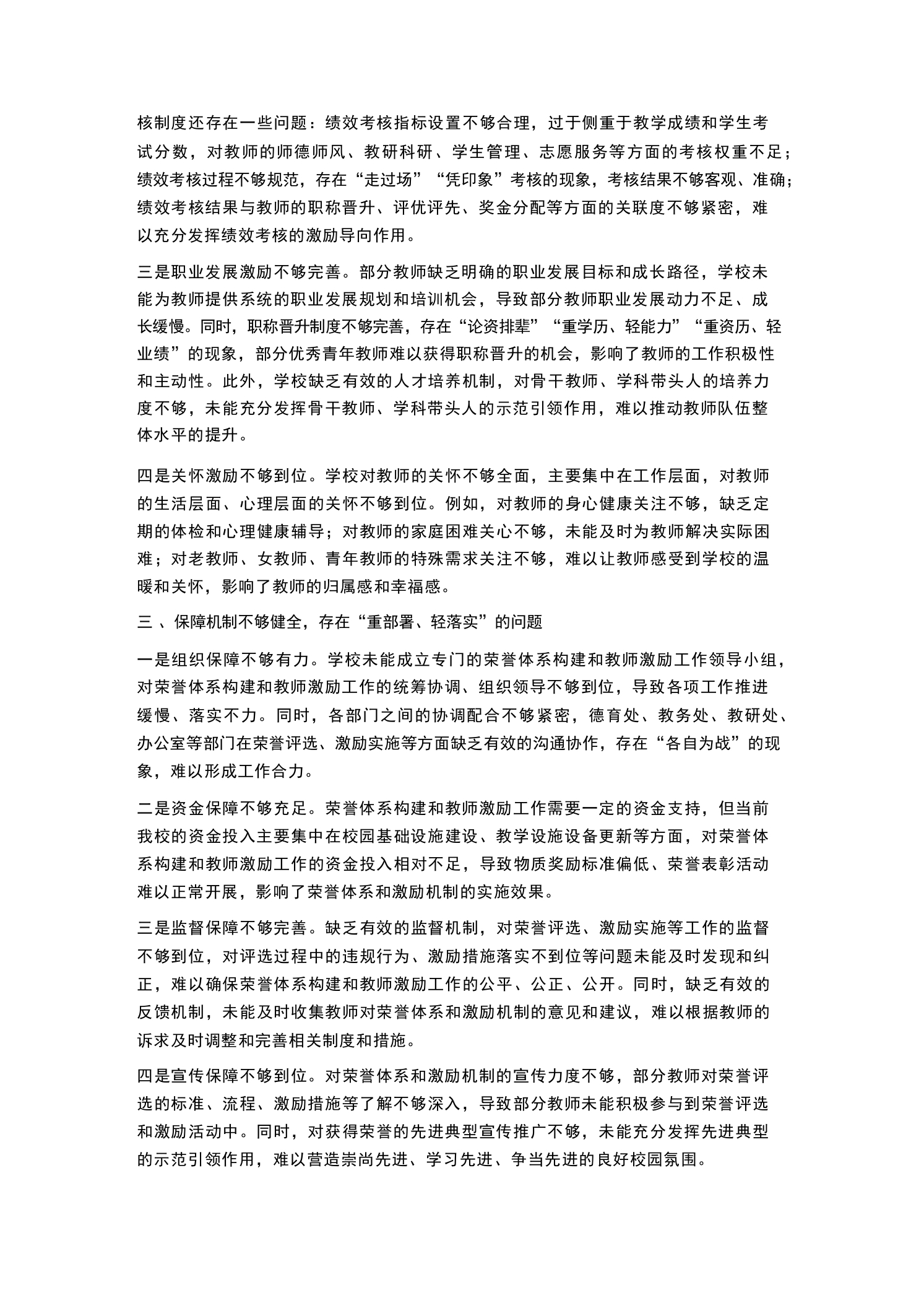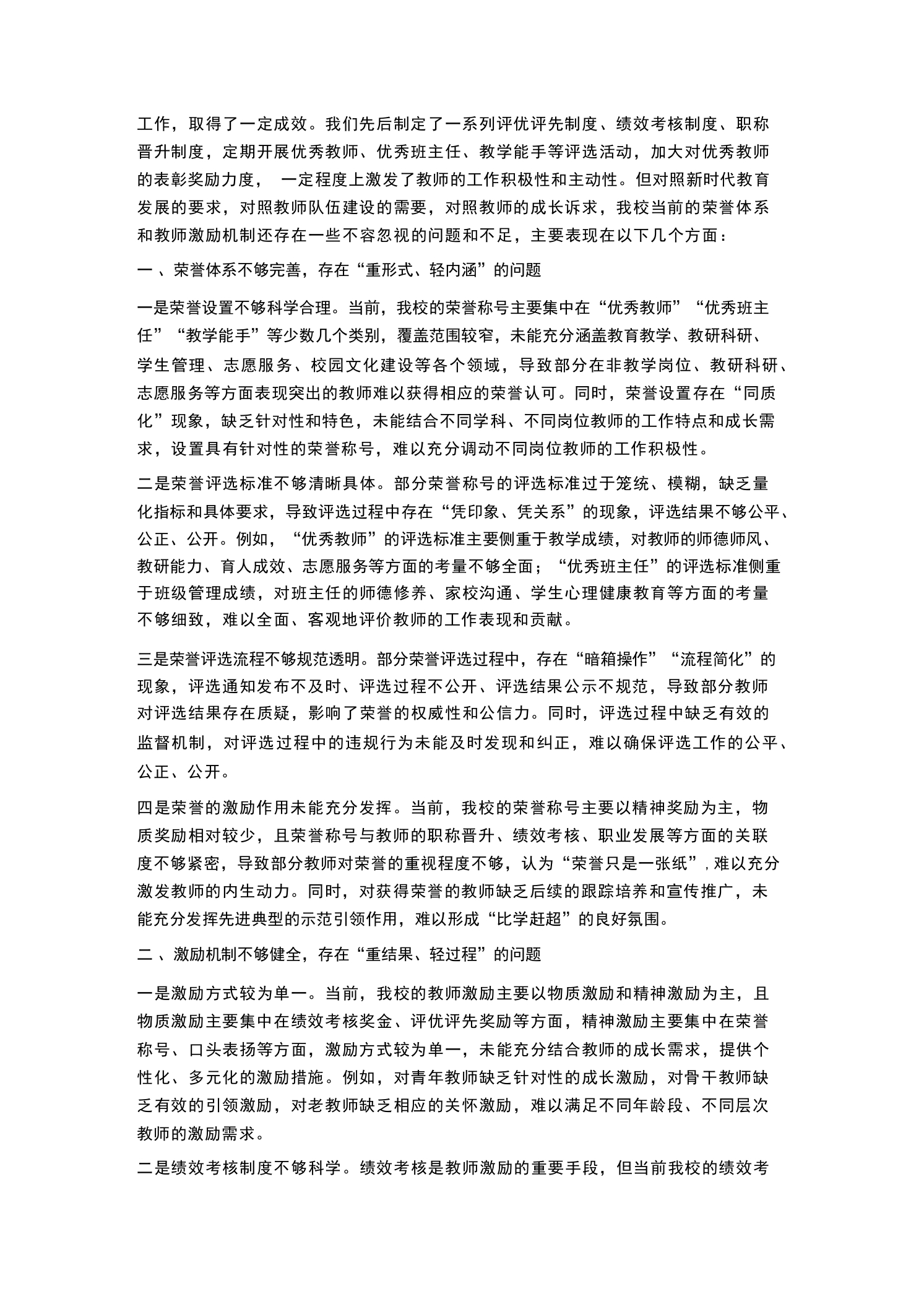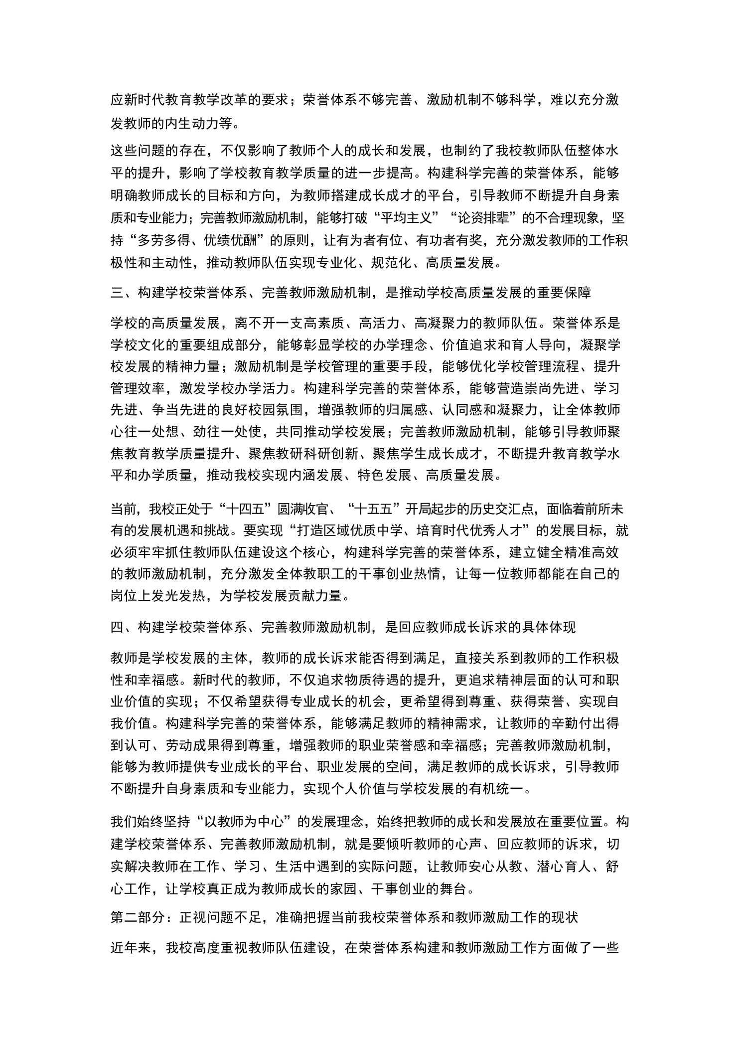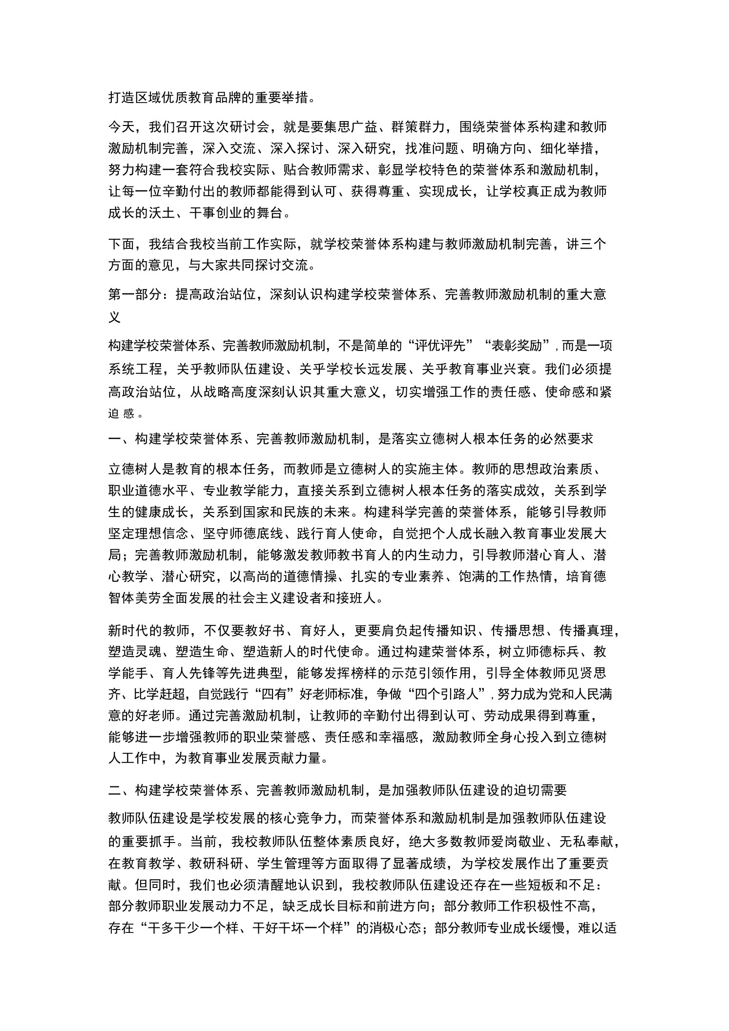XX学校2026年春季学期学校荣誉体系构建与教师激励机制研讨会校长发言尊敬的各位领导、各位老师,同志们:大家上午好!春潮涌动启新程,奋楫扬帆正当时。在2026年春季学期教育教学工作稳步推进、各项事业蓄力突破的关键节点,我们隆重召开XX学校荣誉体系构建与教师激励机制研讨会。本次会议的核心任务是:深入学习贯彻习近平新时代中国特色社会主义思想、党的二十大精神和习近平总书记关于教育的重要论述,全面落实新时代教师队伍建设改革的各项要求,聚焦“立德树人”根本任务,结合我校办学实际,系统梳理当前学校荣誉体系和教师激励工作中存在的问题与不足,深入探讨荣誉体系构建的思路、方法和路径,科学谋划更加科学、合理、高效的教师激励机制,进一步统一思想、凝聚共识、明确方向,充分激发全体教职工的工作积极性、主动性和创造性,为我校教育事业高质量发展注入强劲动力,奋力推动我校办学水平再上新台阶、实现新跨越。首先,我代表学校党支部、校委会,向百忙之中莅临本次会议指导工作的上级教育主管部门领导,表示最热烈的欢迎和最衷心的感谢!向长期以来坚守在教育教学一线、默默耕耘、无私奉献的全体教职工,向关心支持学校发展的离退休老同志、学生家长和社会各界人士,致以最崇高的敬意和最诚挚的问候!向为本次研讨会精心筹备、积极建言献策的各部门负责人和全体参会人员,表示衷心的感谢!教师是教育的第一资源,是立教之本、兴教之源,是落实立德树人根本任务、推动学校高质量发展的核心力量。荣誉体系是彰显教师价值、激发教师活力的重要载体,激励机制是凝聚教师人心、推动教师成长的关键支撑。构建科学完善的学校荣誉体系,建立健全精准高效的教师激励机制,不仅是加强教师队伍建设、提升教师专业素养的必然要求,更是我校实现内涵发展、特色发展、高质量发展的重要保障。2026年是“十五五”规划的开局之年,也是我校深化教育改革、提升办学质量的关键一年。当前,我国教育事业进入高质量发展的新阶段,教育改革不断深化,教育需求不断升级,对教师队伍建设提出了更高、更严的要求。面对新时代教育发展的新形势、新任务、新挑战,我们必须清醒地认识到,构建科学完善的荣誉体系、建立健全精准高效的激励机制,既是回应教师成长诉求、保障教师合法权益的具体体现,也是破解我校教师队伍建设瓶颈、激发学校办学活力的迫切需要,更是我校培育时代优秀人才、
