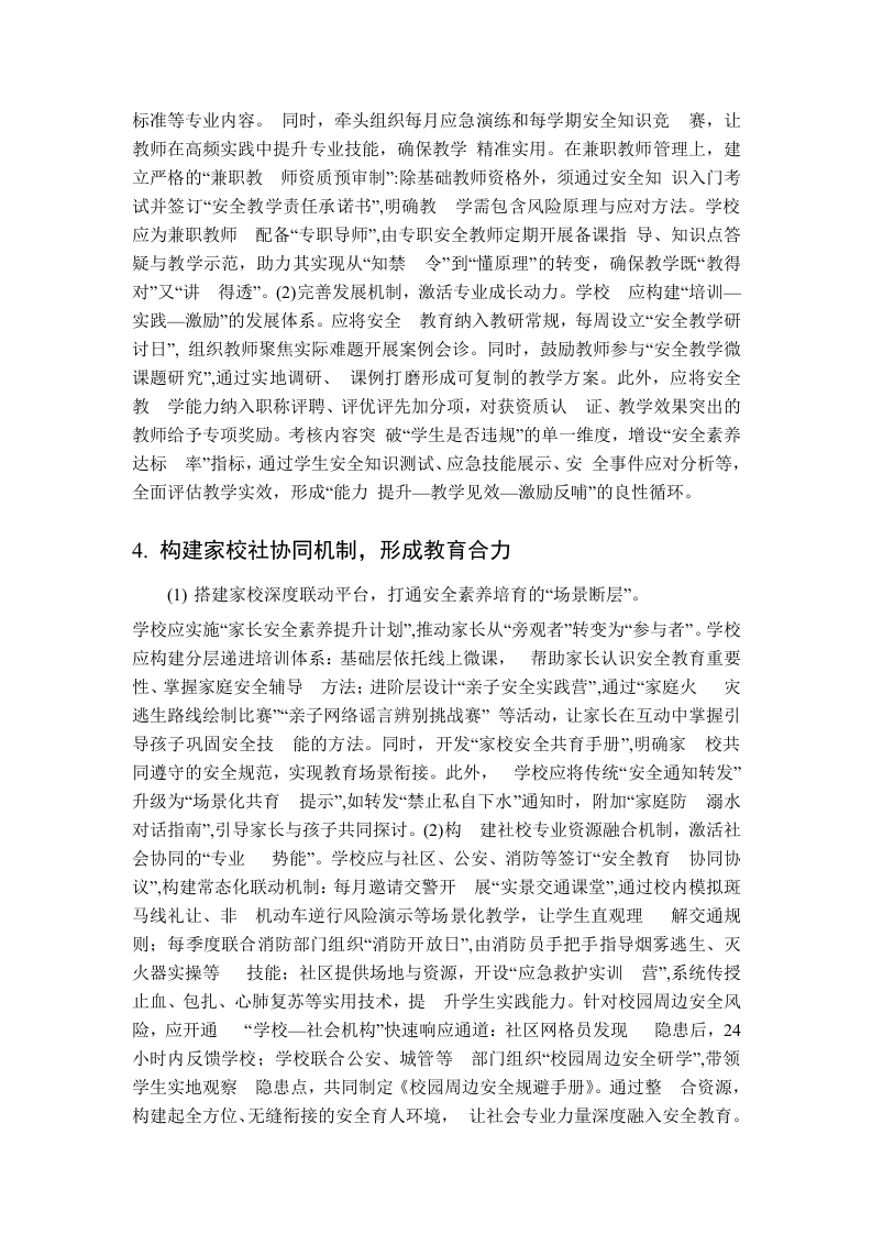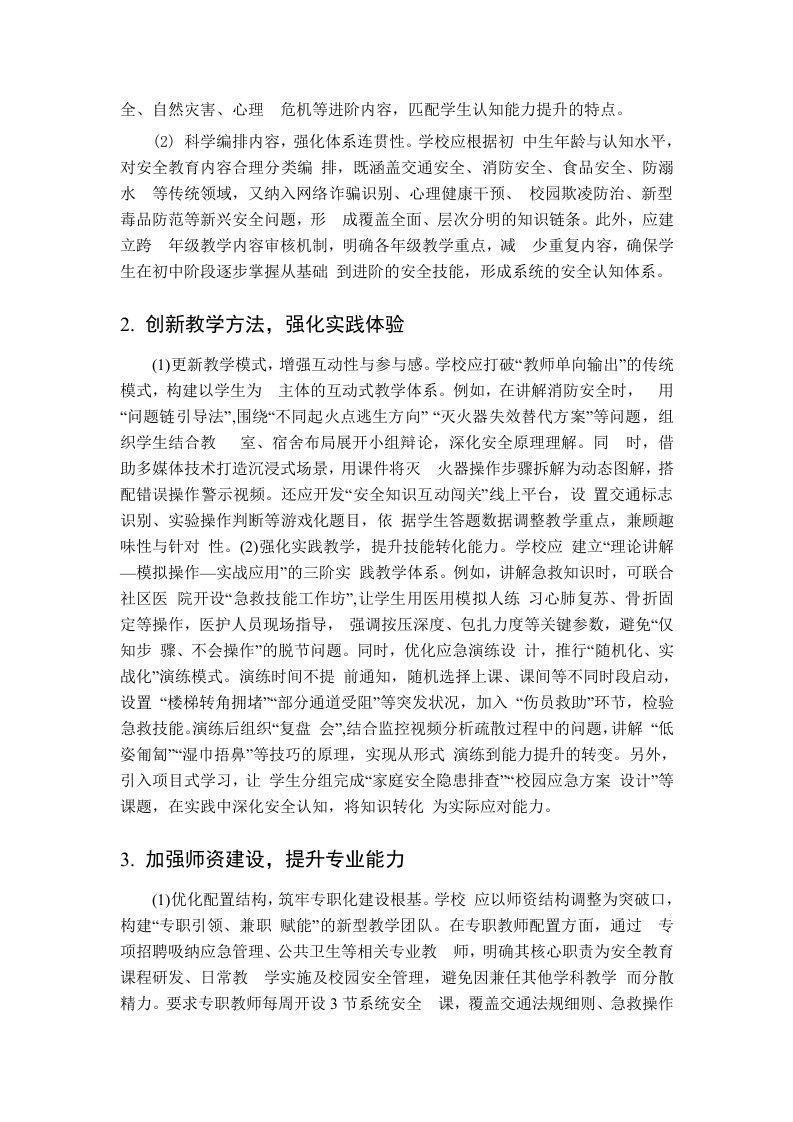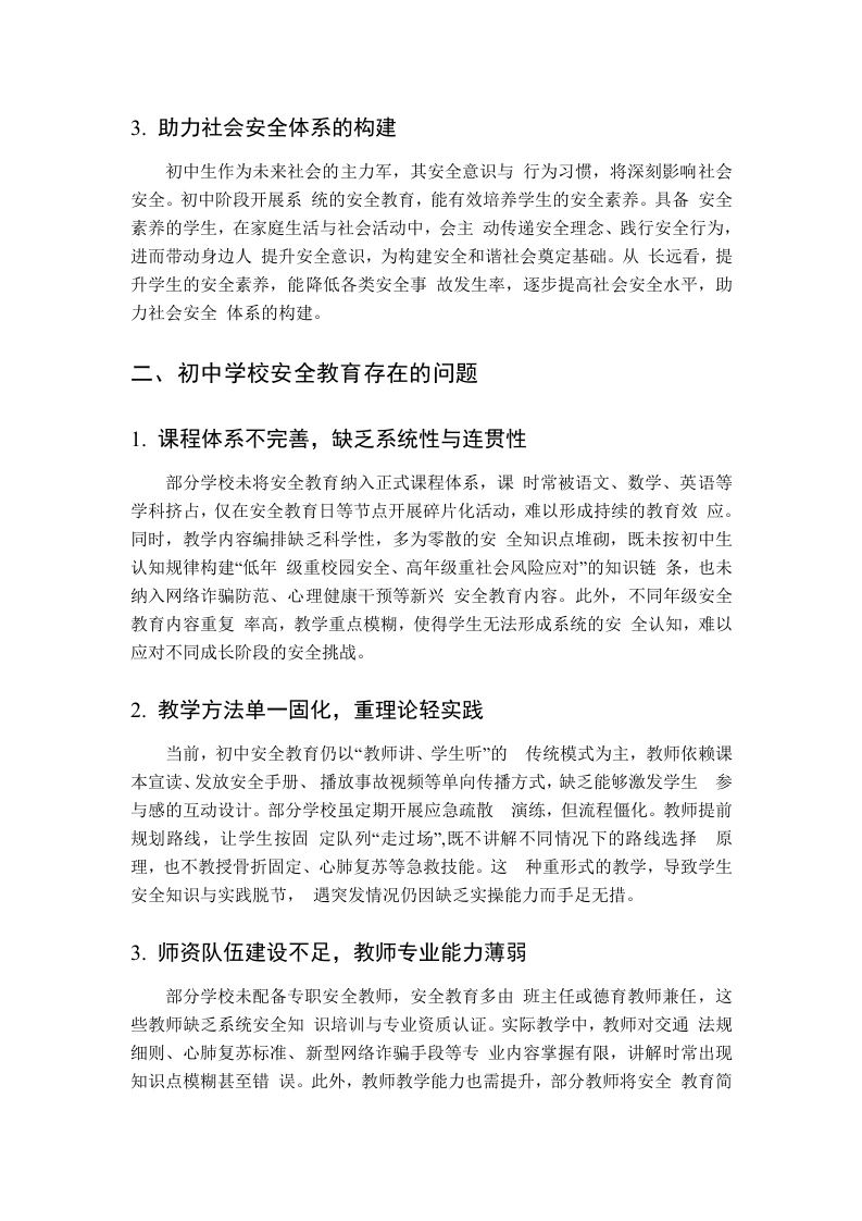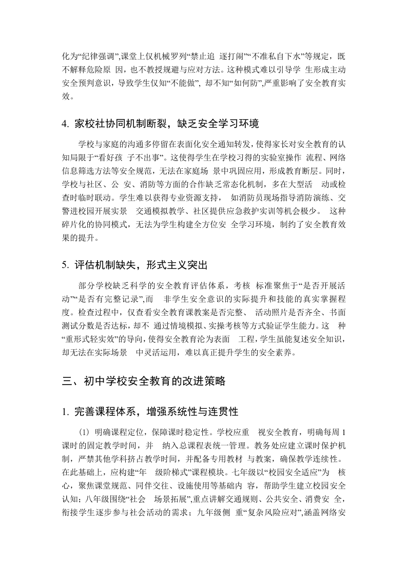 初中学校安全教育存在的问题及改进策略研究初中生对世界充满探索欲,乐于尝试新事物,但因社会阅历浅、风险预判不足,自我保护能力较低。学校作为学生学习生活的重要场域,开展安全教育至关重要。安全教育不仅直接关联学生在校人身安全与健康成长,更对其未来进入社会后安全意识的形成与巩固起重要作用。然而,当前初中学校安全教育实施中仍存在不少问题,有的停留在贴标语、发手册的形式化层面,有的内容陈旧,滞后于现实风险,有的方法枯燥,难以引发学生共鸣。这些问题使安全教育实效性大打折扣,难以应对复杂多变的安全挑战。因此,深入剖析现状,破解实施难题,探索优化路径,已成为提升初中安全教育质量的当务之急,更是为青少年筑牢成长安全屏障的必然要求。一、初中学校安全教育的重要意义1.保障学生的生命安全和身体健康初中生活泼好动、对世界充满探索欲,但认知水平有限、生活经验不足,难以精准预判危险,易在奔跑打闹中受伤、实验时误触危险品,或在集体出行时忽视交通规则。系统的安全教育,能让学生掌握丰富的安全知识,如识别食品保质期、使用灭火器、牢记交通规则,以及面对溺水、触电等突发状况的自救。这不仅可以帮助学生主动规避危险行为,更能使学生在意外发生时迅速采取正确应对措施,最大限度减少伤害,守护学生的生命安全,为学生的身心健康成长筑牢根基。2.促进学校和谐稳定发展安全是学校开展教育教学活动的基础,若安全教育落实不到位、安全事故频发,不仅会损害学生身心健康,还会引发家长担忧,扰乱正常教学秩序,制约办学质量提升。反之,扎实的安全教育能筑牢校园安全防线,推动学校办学质量的提高。学生具备良好的安全意识与习惯,课堂打闹、实验违规等风险行为会减少,学习效率会相应提升。教师不用在处理安全隐患上耗费过多精力,可专注教学设计与学生辅导:家长因孩子安全有保障,会更配合学校,形成家校协同良性互动。