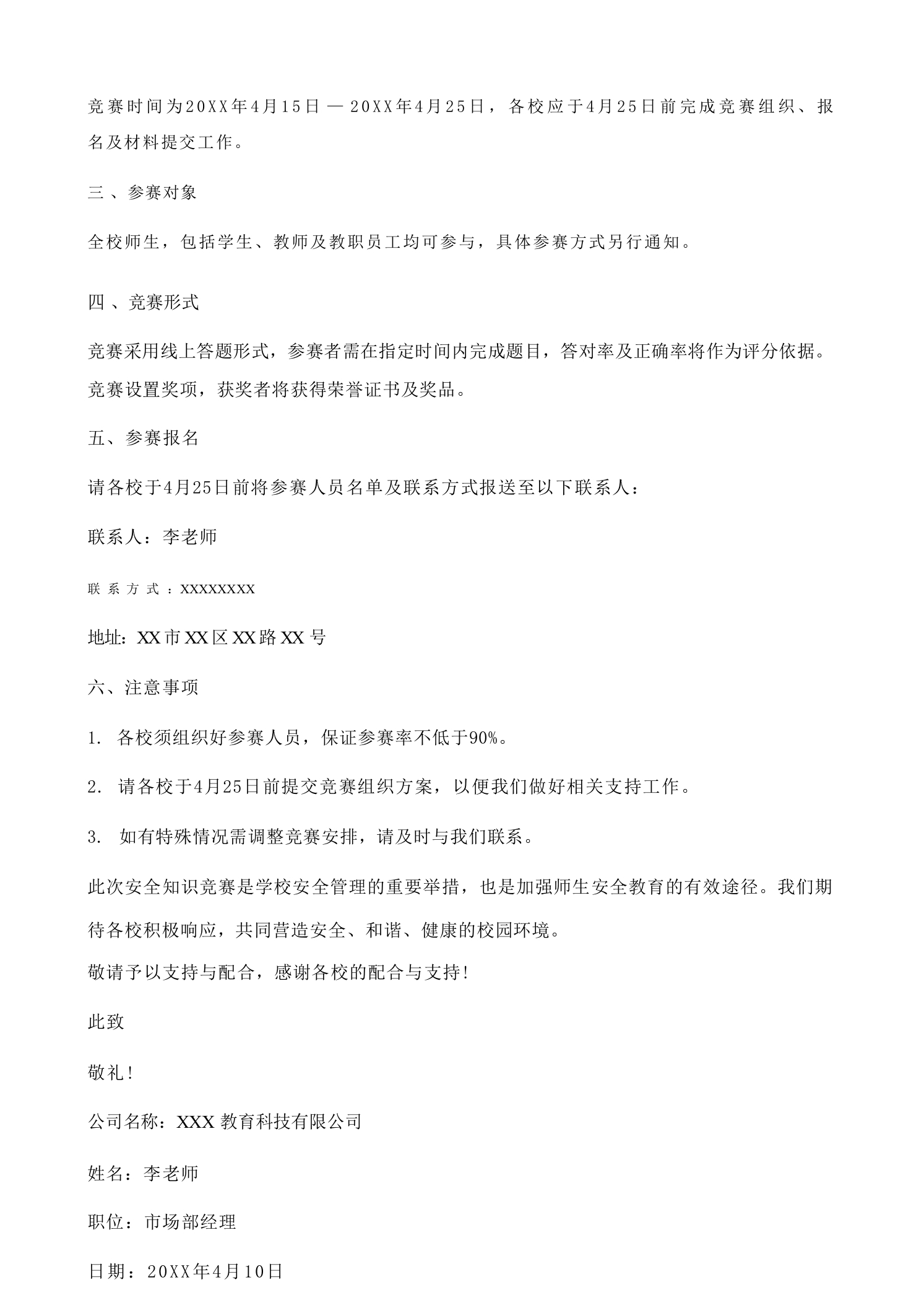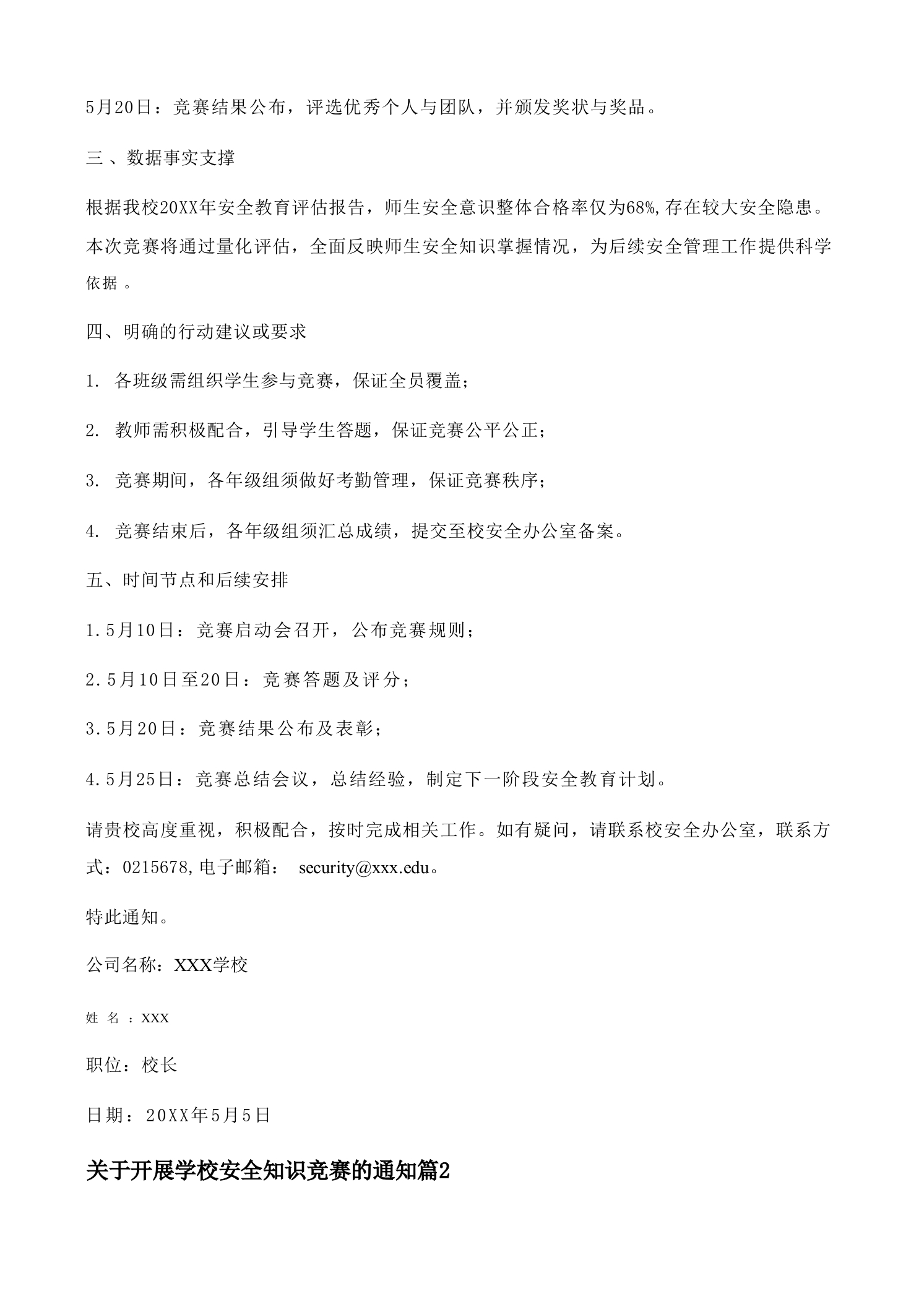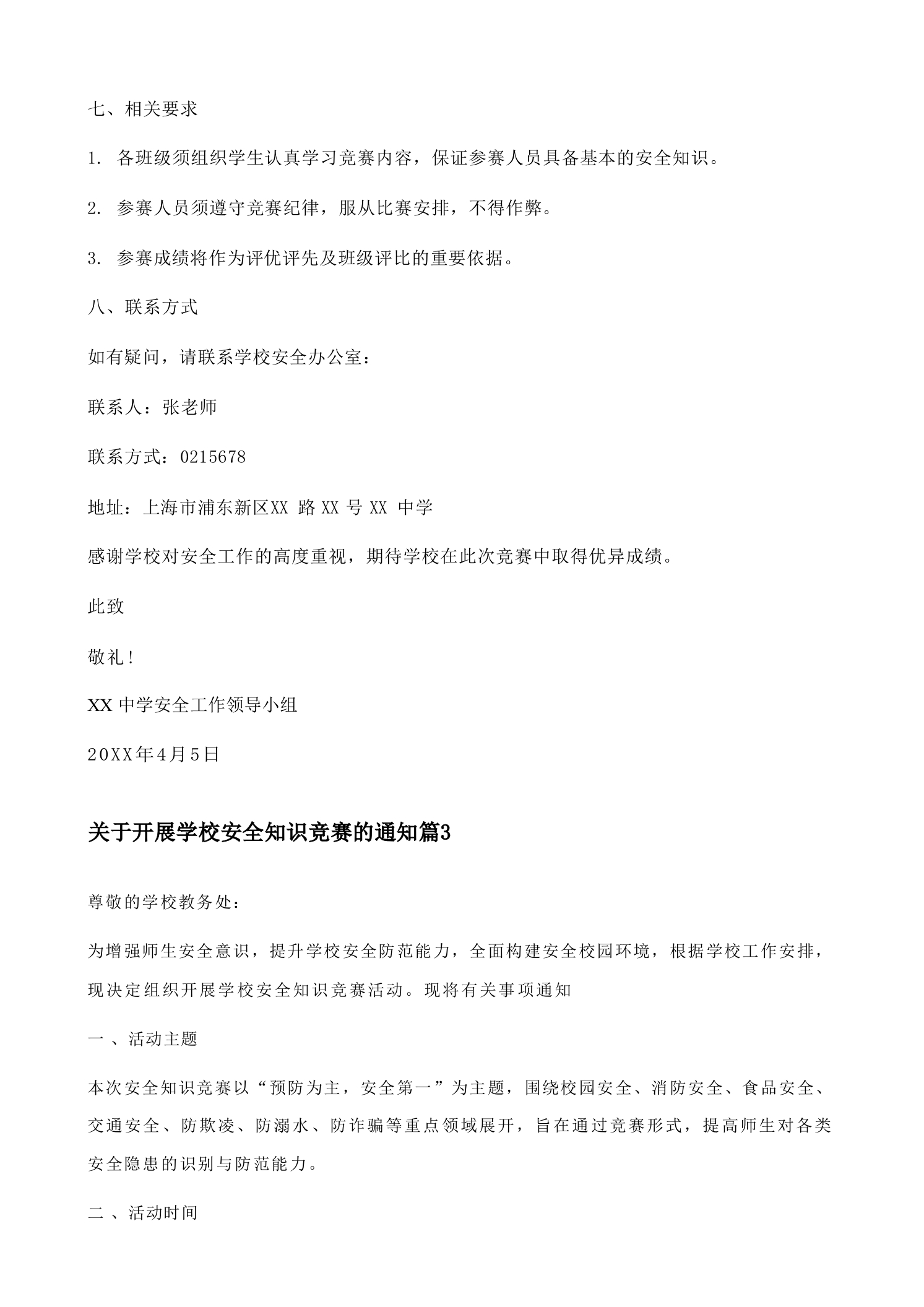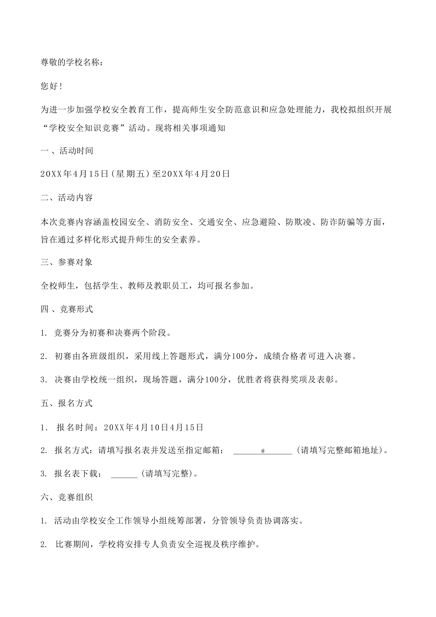关于开展学校安全知识竞赛的通知5篇范文关于开展学校安全知识竞赛的通知第(1)篇尊敬的学校领导:为全面提升师生安全意识,强化校园安全防范能力,保障广大师生生命财产安全,根据教育部《中小学安全教育工作指南》和《全国教育系统安全专项治理实施方案》等文件精神,我校拟组织开展安全知识竞赛活动,现将有关事项通知一、背景与目的说明为实施国家关于加强校园安全工作的部署要求,提升师生安全防范意识和应急处置能力,结合我校实际,组织开展安全知识竞赛活动,旨在通过竞赛形式,普及安全知识,强化安全教育,营造良好的校园安全环境。二、具体事项详细描述本次竞赛活动将采用线上与线下相结合的方式开展,具体安排1.竞赛时间:20XX年5月10日至20XX年5月20日2.竞赛内容:涵盖消防、交通安全、食品安全、防震避险、网络安全、心理健康等六大模块,内容以法律法规、安全常识、应急处理流程等为主。3.竞赛形式:采用限时答题形式,每轮答题时间为15分钟,满分100分,得分排名将作为评优评先和安全教育成效评估的重要依据。4.参赛对象:全校师生,包括学生、教师、行政人员等,均需参与。5.竞赛组织:由校安全办公室牵头组织,各年级组配合,设立竞赛组委会,负责赛事统筹、人员安排、成绩统计及结果公示等工作。6.竞赛流程:5月10日:竞赛启动会,公布竞赛规则与评分标准;5月10日至20日:学生组、教师组分别进行线上答题: