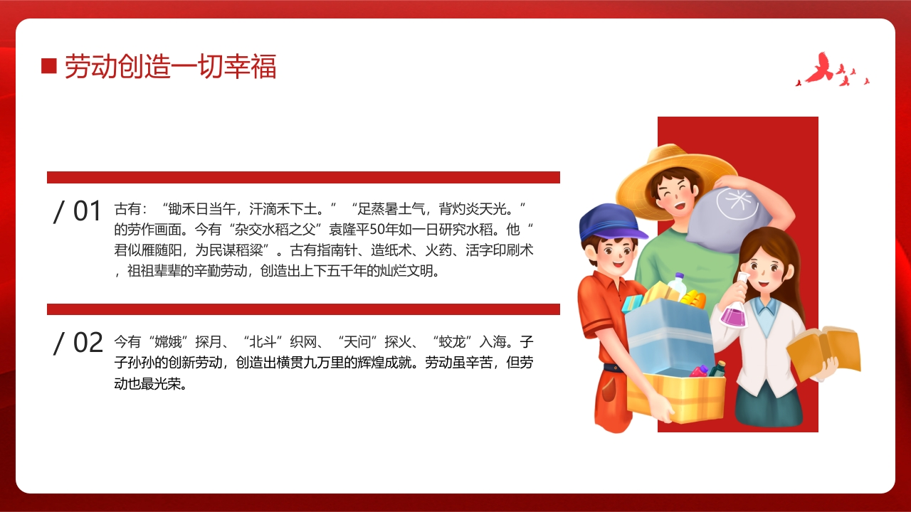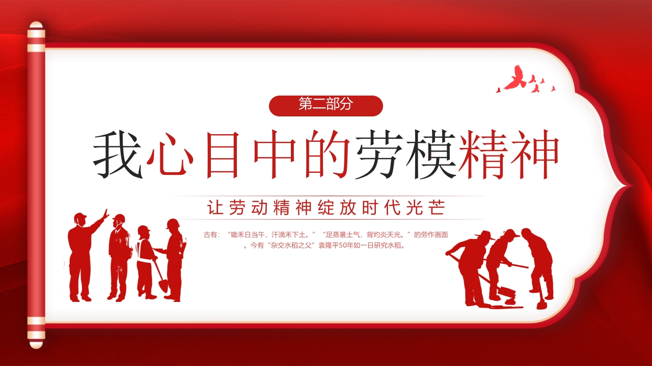 【通用】【五一劳动节】主题班会:弘扬劳模精神,点亮青春底色tangqi8810小时前发布关注私信14.28MB29页02913 第1页 / 共29页 第2页 / 共29页 第3页 / 共29页 第4页 / 共29页 第5页 / 共29页 试读已结束,还剩24页,您可下载完整版后进行离线阅读 【通用】【五一劳动节】主题班会:弘扬劳模精神,点亮青春底色此内容为付费资源,请付费后查看¥9.9¥19.9VIP会员免费立即购买您当前未登录!建议登陆后购买,可保存购买订单付费资源© 版权声明本站是一个信息分享及获取的平台,不确保部分用户上传资料的来源及知识产权归属,资料由老师投稿,公开渠道整理,网友上传,如果侵犯到您的权益,请联系客服删除THE ENDPPT课件 文本预览 平凡中的伟大力量弘扬劳模精神点清春底色让劳动精神绽放时代光芒古有:“锄禾日当午,汗滴禾下土。”“足蒸暑土气,背灼炎天光。”的劳作画面。今有“杂交水稻之父“”袁隆平50年如一日研究水稻。汇报人:汇报时间: 查看更多 收起部分 喜欢就支持一下吧点赞13 分享QQ空间微博QQ好友海报分享复制链接收藏