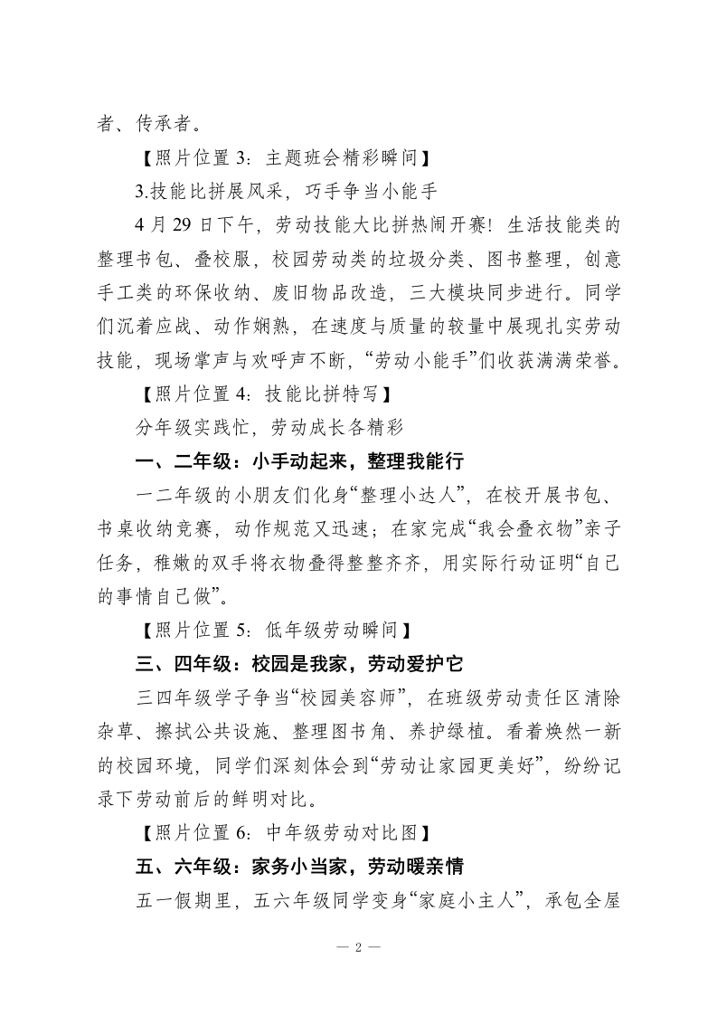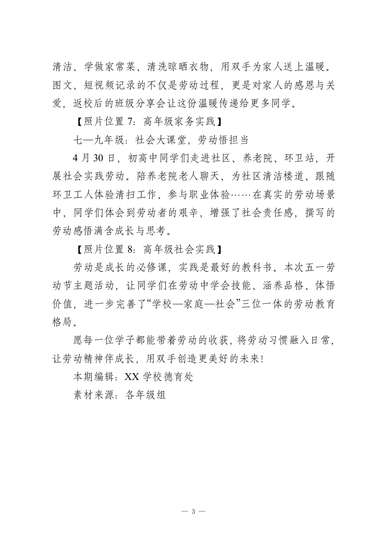 “劳动砺心志,实践促成长”2026年五一劳动节系列活动圆满完成春和景明,劳动如歌!为深入落实劳动教育要求,厚植“劳动最光荣、劳动最崇高、劳动最伟大、劳动最美丽”的价值理念,我校于4月27日一5月8日开展了“劳动润心启新程,实践笃行向未来”五一劳动节主题教育系列活动。全校学子以劳砺志、以行践知,在多样化劳动实践中收获成长,让劳动精神在校园落地生根!【照片位置1:活动全景合集图】校园劳动热潮起,多维活动育新人1.升旗仪式传精神,劳动种子植心间4月27日清晨,庄严的国旗下,五一劳动节主题升旗仪式拉开序幕。特邀行业劳模分享奋斗故事,朴实的话语、坚守的初心打动了在场每一个人;学生代表国旗下讲话抒发对劳动的热爱;全体学子高举右拳,共同宣读《新时代劳动倡议书》,铿锵誓言彰显新时代少年的劳动担当;最后,劳动主题歌曲齐唱,让劳动精神在旋律中传递。【照片位置2:升旗仪式特写】2.主题班会悟价值,劳动共识共凝聚4月27日下午,各班开展“劳动点亮美好生活”主题班会。通过观看大国工匠纪录片、演绎劳动情景短剧、分享个人劳动故事、制定班级劳动公约等丰富形式,同学们深入探讨劳动的意义,懂得了“幸福是奋斗出来的”,纷纷表示要做劳动的参与1