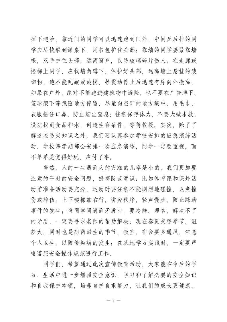 5.12防灾减灾日校长在国旗下讲话防灾减灾,从我做起各位老师,同学们:大家早上好!新的一周又开始了,今天与大家说的话题《防灾减灾,从我做起》。同学们,当我们在尽情享受每一天的快乐时光时,我们是否想到安全的隐患无时不在袭击着我们。2008年5月12日,汶川发生里氏8.0级特大地震,这场新中国成立以来破坏性最强的大地震,给全国人民带来了巨大的心理压力和难以愈合的心灵创伤,堪称国家和民族史上的重大灾难。经国务院批准,自2009年起,将每年5月12日定为全国“防灾减灾日”。今天,我们开展“防灾减灾日”宣传教育活动,既是纪念汶川大地震故去的人们,也是提醒我们前事不忘、后事之师,增强大家防灾减灾的意识,普及推广防灾减灾知识和避灾自救技能,最大限度地减轻自然灾害的损失。自然界中不可避免的存在着各种各样的灾害的侵犯和隐患,如台风、暴雨、火灾、地震、雷电、交通事故等等。因此,对我们全体师生而言,提高“防灾减灾”意识显得至关重要。我们相信,只要认真学习“防灾减灾”的基本常识,提高逃生的自救互救常识,我们完全可以把灾害的损害降低到最低,甚至完全可以避免灾害的发生。首先最重要的就是要镇静,在任何突发应急事件面前不要慌乱。如果正在上课时发生了地震,同学们要在老师的统一指1