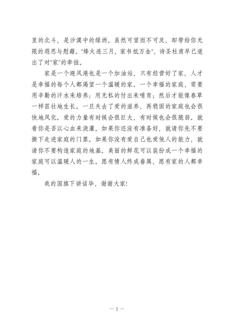 5.15国际家庭日,校长在国旗下讲话:家是黄昏湖边的搀扶,家是灯下互相剪去丝丝白发大家好!家是什么年轻人说:家是甜蜜的吻、热烈的拥抱、柔情似水的情话和思念时的拥抱。家是什么中年人说:家是港湾,能停泊万吨巨轮也能栖息独木小舟。家是什么老年人说:家是黄昏湖边的搀扶,家是灯下互相剪去丝丝白发。是白头偕老的浪漫旅程。家是什么千万个人有千万个说法。家是什么家是一付重担,家是一份责任;家是彼此的真诚相待,家更是能够白头偕老的慢慢旅程。家是人生的驿站,是避风的港湾。家又是一个充满亲情的地方,无论你是在天涯海角,只要一想到家,就会有一种亲情感回荡在心头,在生活中,人们总是在身心疲惫的时候走进家门,在家里经过休息、充电。然后再精神焕发地迈出家门,奔向那丰富多彩的人生。所以,家不但能让你享受到人生的快乐,更可以给你前行的勇气和力量。当阳光普照的时候,人们可以无忧无虑地走南闯北,为事业奔波,与朋友举杯畅饮。然而,当夜晚来临的时候,人们最需要的也许就是家,因为那里有亲情,那里有温暖,那里更有那属于我们自己的港湾。所以我想,家是大千世界的缩影,也是最能考验一个人责任感的圣坛。是一种文化;家是一种情怀。孤独时,家是黑夜