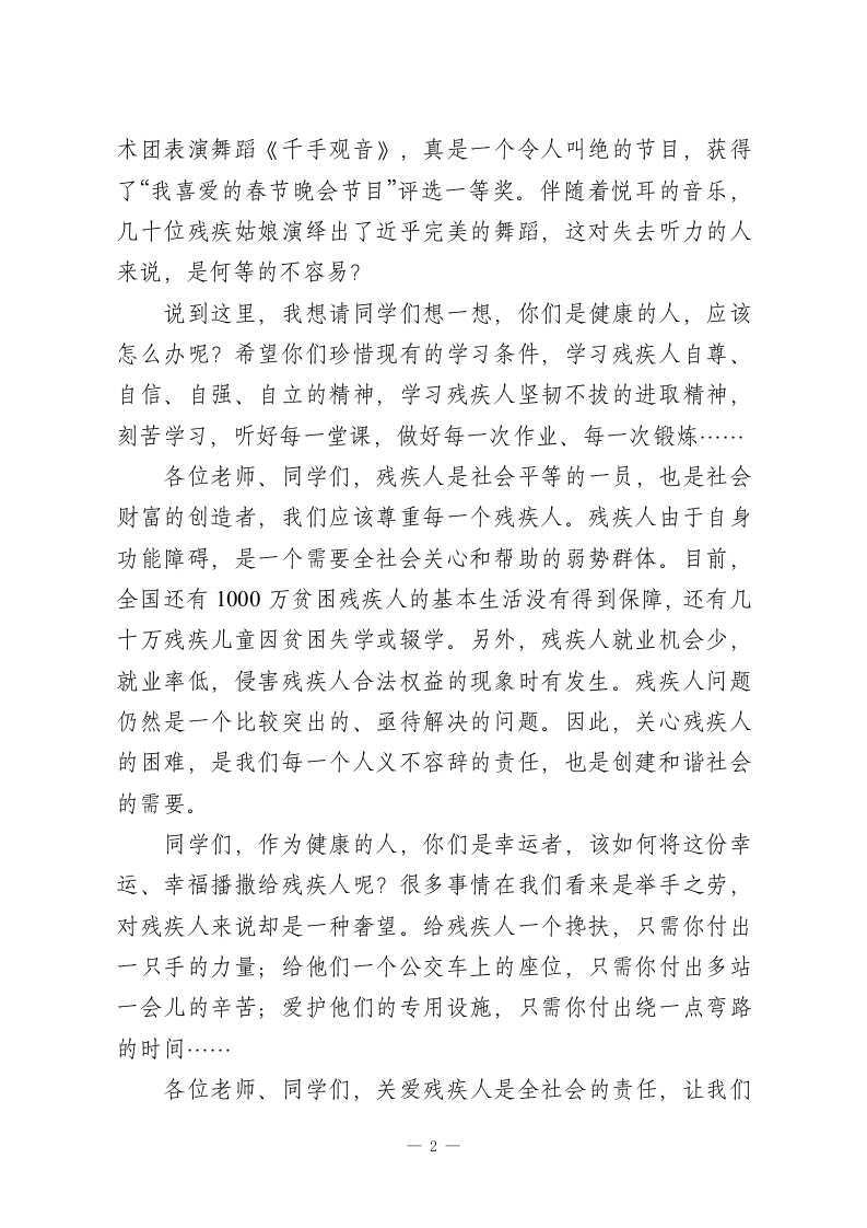 5.15校长在全国助残日上国旗下讲话:让我们每一个人都献出爱心,弘扬中华民族传统美德,给残疾人更多关爱和帮助老师们、同学们:大家上午好!告诉大家,《中华人民共和国残疾人保障法》规定:“每年5月的第三个星期日,为全国助残日”。残疾一般可以分为视力残疾、听力残疾、肢体残疾、智力残疾和精神残疾五种类型。据统计,目前我国的各类残疾人总数达6000多万人,占全国人口总数的5%,也就是说25个人中就有一个残疾人。其中,我国的残疾儿童、少年约有625万人,智力残疾所占比例最高。我曾经在一本书上,看到两张对比的照片:一张是一位拄着拐杖的残疾人在为人理发,一张是一个四肢健全的人蜷缩于街头一角伸手乞讨。同样是为了生活,两个人的目的相同,但方法却完全不一样。同学们,你们应该向谁学习呢?我们应该学习热爱劳动、自食其力的理发者。自古以来,有许许多多残疾人自学成才、自强不息,他们身残志不残。如,我国战国时期的孙膑,他虽然下肢残疾,却写出了著名的《孙子兵法》。酷爱音乐的阿炳,虽然是一个双目失明的盲人,但谱写出许多名曲,《二泉映月》就是他的代表作品。20xx年中央电视台春节联欢晚会上,由中国残疾人艺