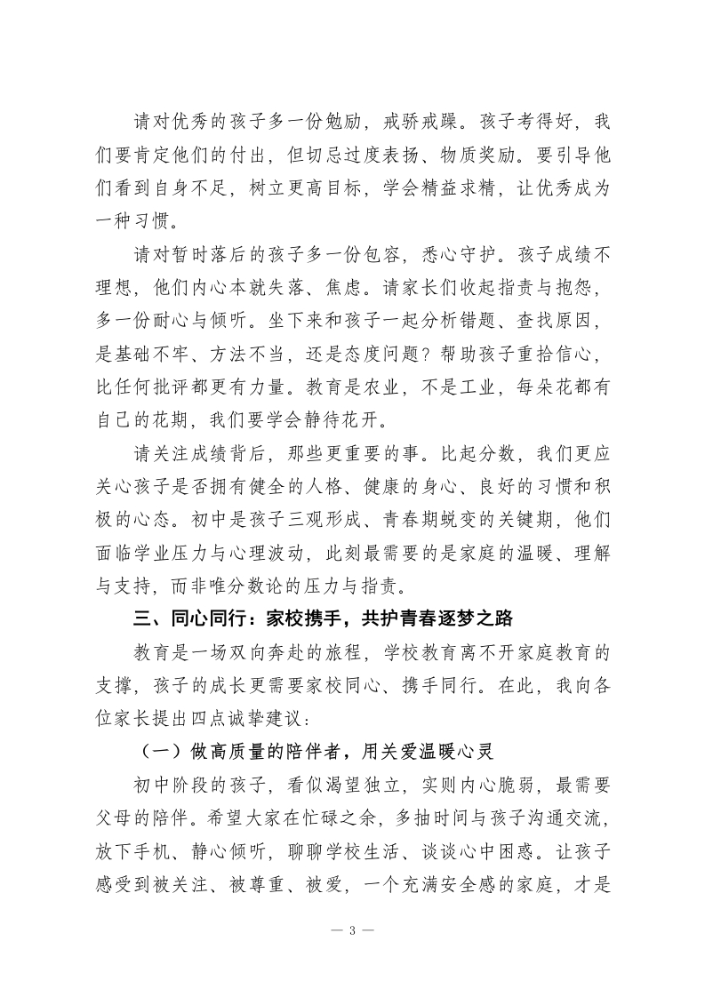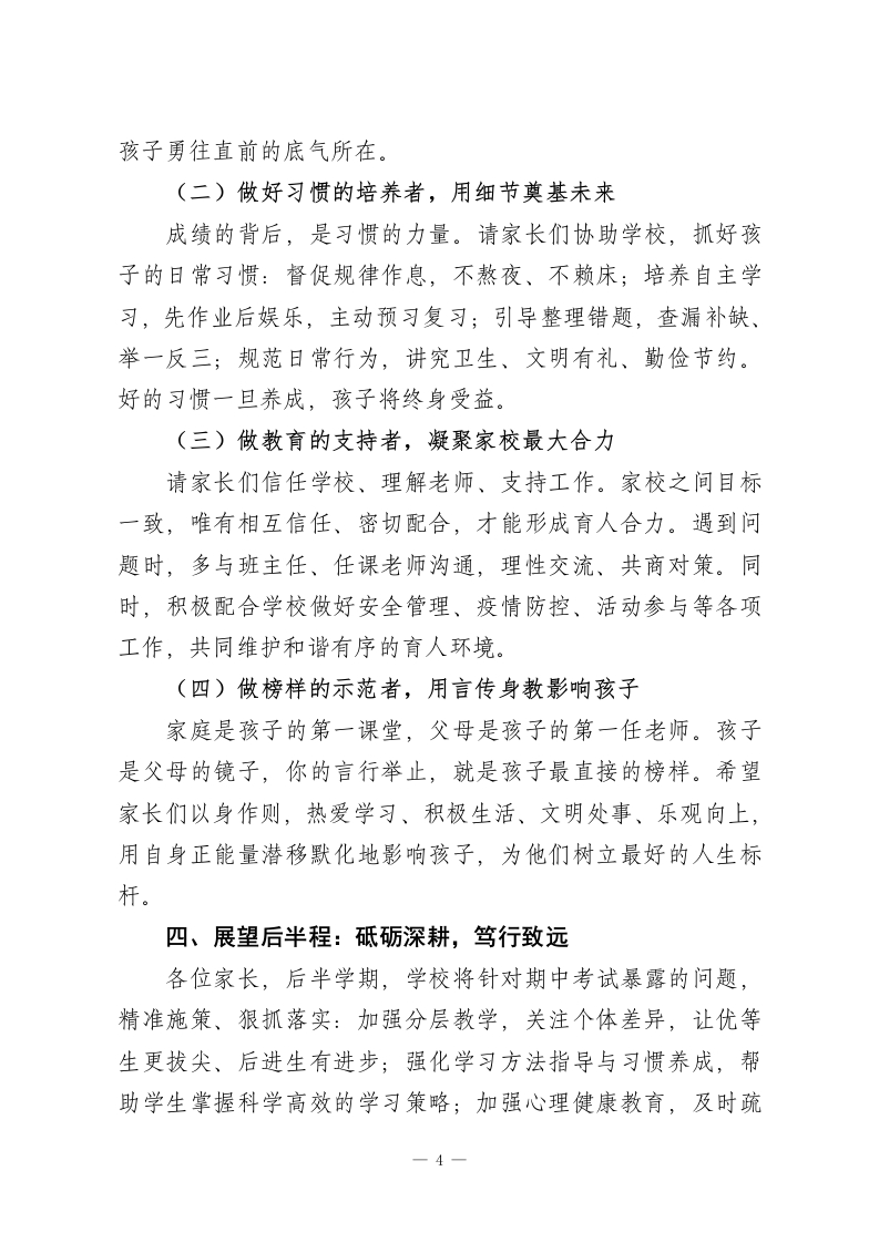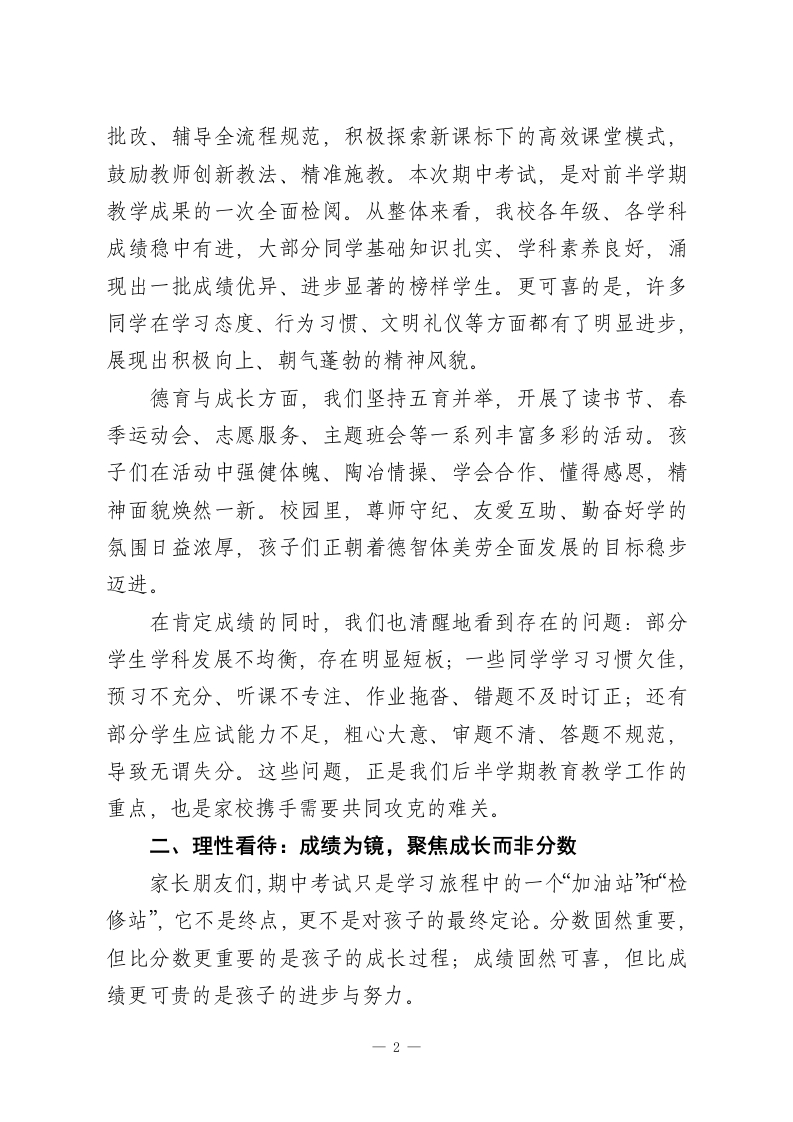 2026春季学期期中考试后,初中校长在全校家长会上发言:教育之路漫漫,育人之心灼灼尊敬的各位家长朋友们:大家晚上好!暮春渐远,初夏将至。在这生机盎然、充满希望的美好时节,我们因孩子相聚于此,隆重召开2026年春季学期期中考试后的全校家长会。首先,我谨代表学校全体教职工,向在百忙之中拨冗莅临的各位家长,表示最热烈的欢迎和最衷心的感谢!感谢大家一直以来对学校工作的理解、信任与鼎力支持,更感谢各位为孩子的成长倾注的心血与付出的辛劳。今天我们齐聚一堂,核心目的有三:一是向大家全面汇报半学期以来学校的教育教学工作与办学成效;二是客观分析本次期中考试的整体情况,直面问题、总结经验;三是与各位家长深入交流、凝聚共识,共商家校协同育人之策,携手为孩子们的青春成长保驾护航。一、回望半程:深耕细作,育人路上步履坚实各位家长,过去两个多月,学校始终坚守“立德树人”的根本任务,秉持“以人为本、全面发展”的办学理念,聚焦教学质量提升,狠抓常规管理,丰富校园生活,各项工作稳步推进、成效显著。教学方面,我们深耕课堂主阵地,严格落实备课、授课、