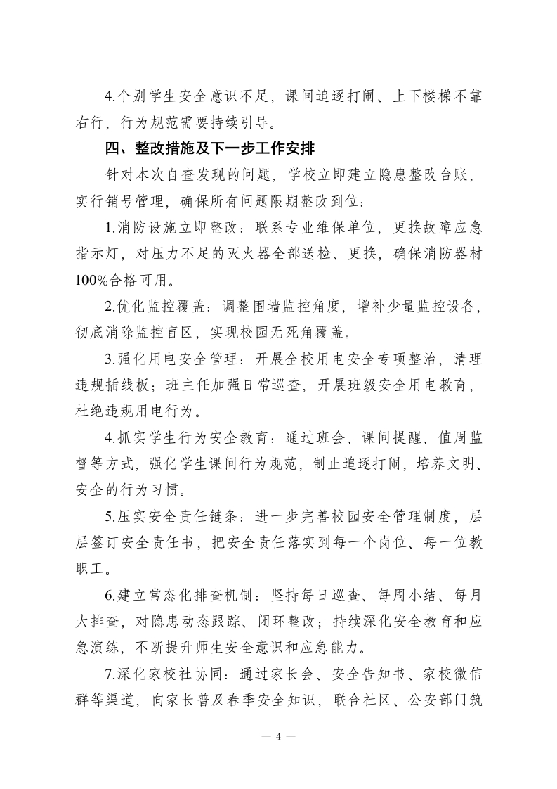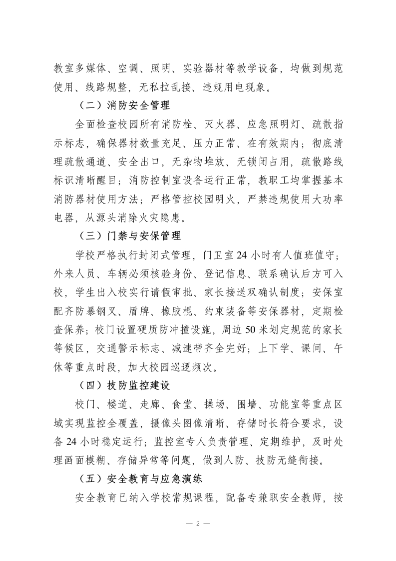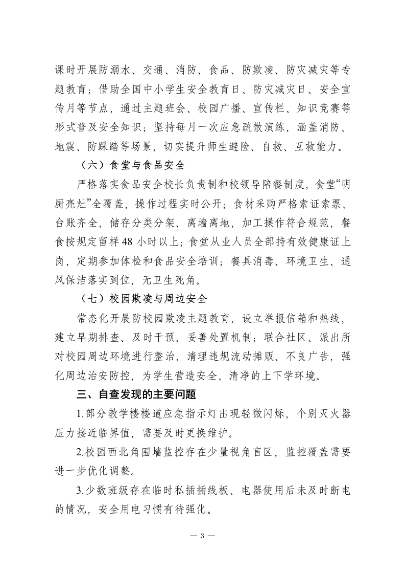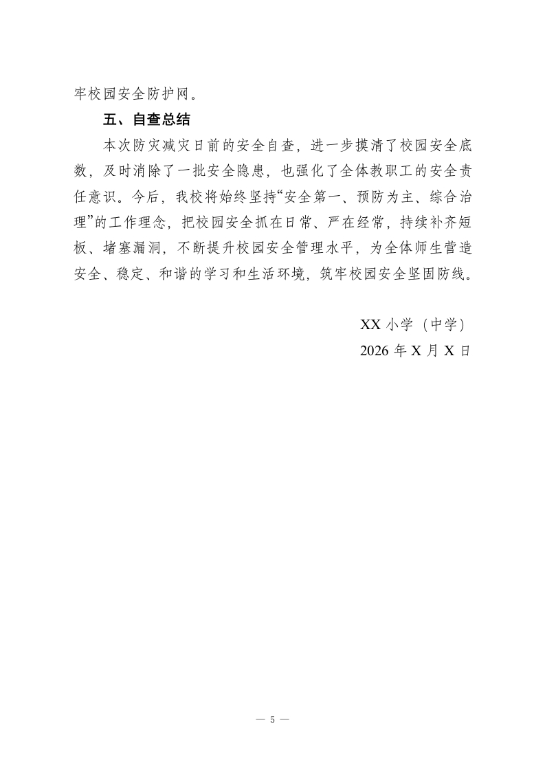 2026年春季学期防灾减灾日校园安全自查报告2026年春季学期,全国第17个防灾减灾日即将到来。为牢牢守住校园安全底线,全面排查整治各类安全隐患,把风险化解在萌芽状态,保障全校师生的生命和财产安全,我校近期组织开展了全覆盖、无死角的校园安全自查工作。本次自查坚持“谁主管、谁负责,谁排查、谁跟踪”的原则,聚焦校舍、消防、安防、食品、教育、周边环境等关键环节,逐项核查、建立台账即查即改。现将自查情况汇报如下:一、自查工作总体开展情况学校第一时间成立了以校长为组长,分管安全副校长为副组长,各处室负责人、班主任、后勤及安保人员为成员的安全自查工作组。结合春季学期校园安全特点,围绕校舍设施、水电燃气、消防安全、门禁安保、监控技防、食堂食品、安全教育、应急演练、校园欺凌、周边环境十大重点,开展拉网式排查。对发现的问题现场记录、分类梳理,明确整改责任人、完成时限,确保隐患不漏项、整改不拖延、闭环不落空。二、重点自查内容及落实情况(一)校舍及设施设备安全对教学楼、综合楼、各功能室、办公室、卫生间、走廊楼梯等校舍建筑进行全面检查,重点查看墙体、地面、门窗、护栏、楼梯扶手是否牢固完好;对校园水电、燃气线路管道逐区域排查,及时整改线路杂乱、水管滴漏、开关松动等小问题;1