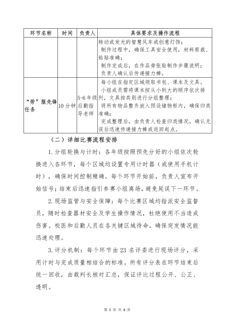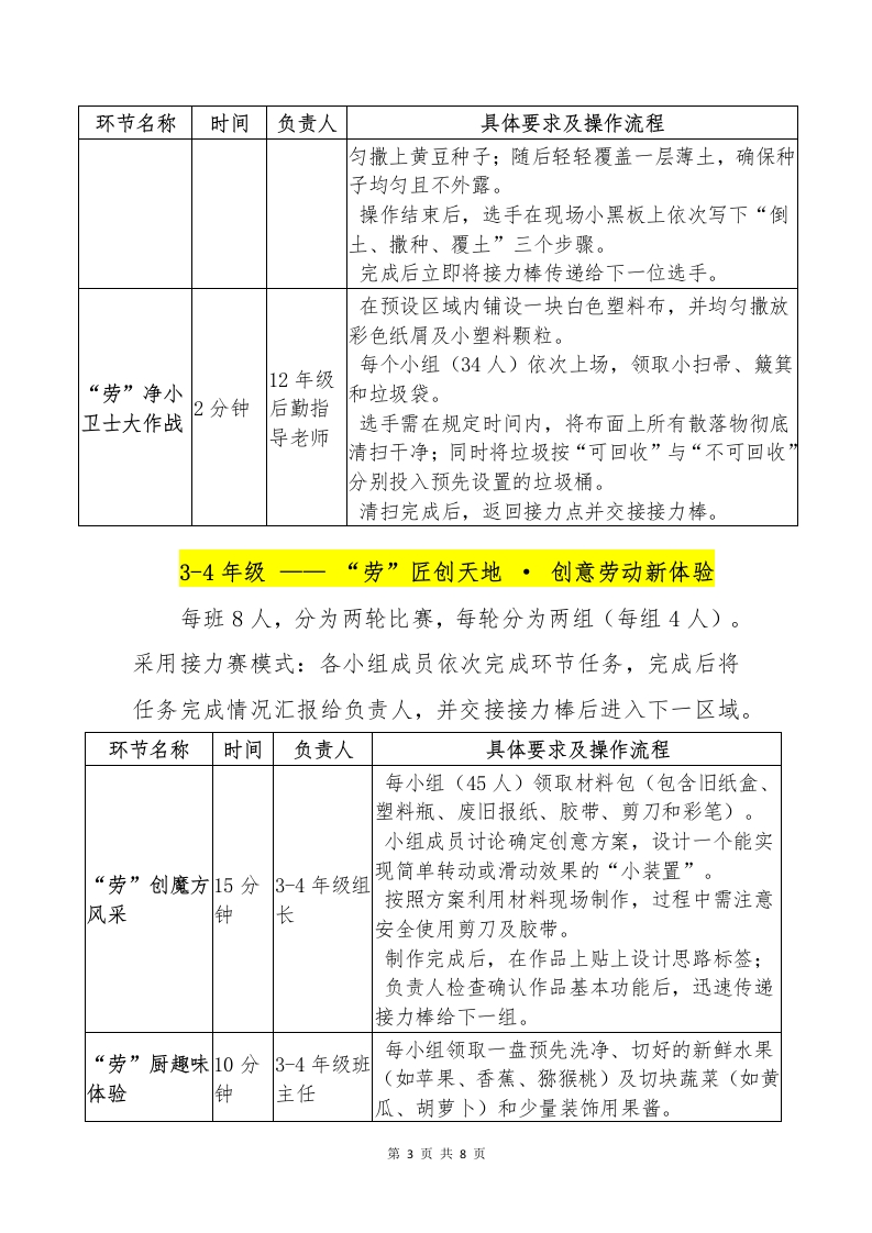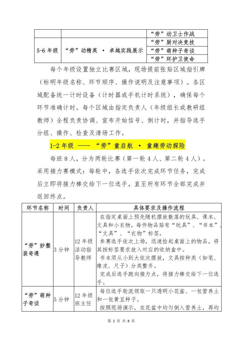 ‘劳’以展风采,‘动’手创未来2026年小学劳动技能大赛实施方案一、活动目的本次劳动技能大赛旨在全面贯彻落实国家中小学劳动教育政策,深化劳动教育在学生日常学习中的实际作用,推动“劳动最光荣”的理念深入人心。同时,活动注重跨学科知识的融合,在劳动中渗透数学、科学、美术等多方面知识,使学生在完成任务的过程中不仅锻炼了动手能力,还培养了观察、思考和团队协作能力。二、活动主题“劳”以展风采“动”手创未来三、活动时间2026年4月28日(星期二)上午9:00至11:00四、活动地点学校操场五、活动过程与比赛流程安排年级大主题环节主题“劳”妙整装奇遇1-2年级“劳”童启航·童趣劳动探险“劳”萌种子奇谈“劳”动卫士作战“劳”创魔方风采3-4年级“劳”匠天地·创意劳动体验“劳”萌种子奇谈第1页共8页