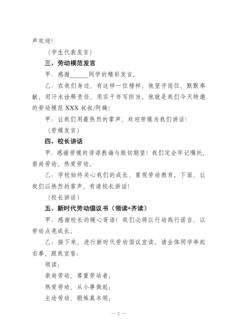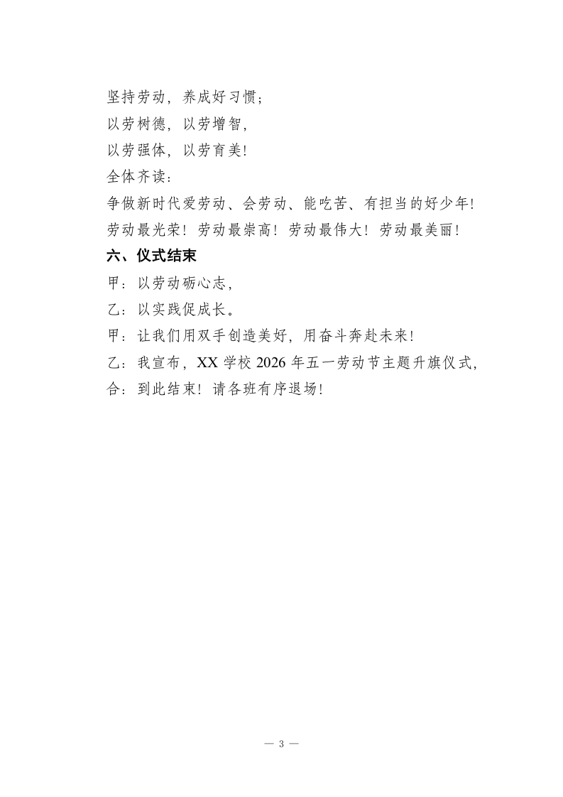 2026年五一劳动节主题升旗仪式主持稿主持人:学生甲、学生乙甲:尊敬的各位领导、老师们,乙:亲爱的同学们,合:大家早上好!甲:春风送暖,万物勃发,乙:劳动如歌,实践成长。甲:今天,我们相聚在庄严的国旗下,举行“劳动润心启新程,实践笃行向未来”五一劳动节主题升旗仪式。乙:出席本次仪式的有学校各位领导、辛勤的老师们,以及我们特别邀请到的劳动模范XXX同志。让我们以热烈的掌声,欢迎各位的到来!甲:我宣布,XX学校2026年五一劳动节主题升旗仪式,合:现在开始!乙:第一项,出旗!旗手就位,全体肃立!(出旗曲)甲:第二项,升国旗,奏唱中华人民共和国国歌!少先队员敬队礼,老师和非少先队员行注目礼!(国歌、升旗)乙:礼毕!二、学生代表国旗下讲话甲:劳动是成长的底色,实践是青春的勋章。乙:下面,有请学生代表同学进行国旗下讲话,掌一1