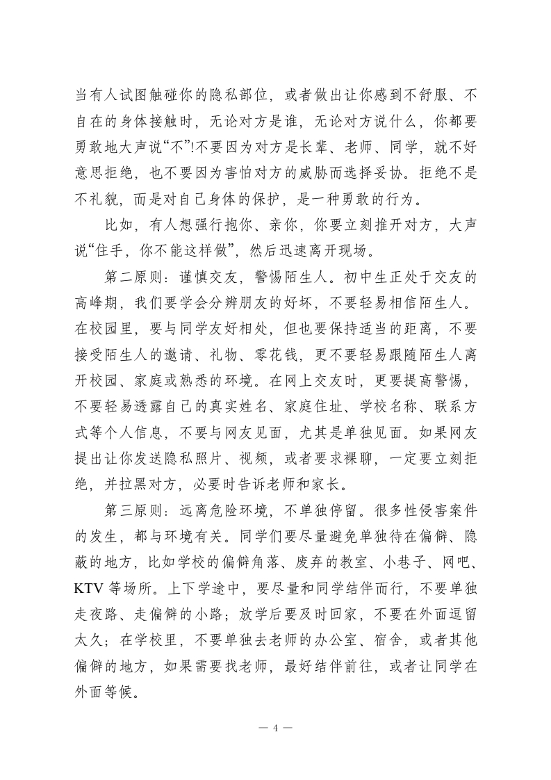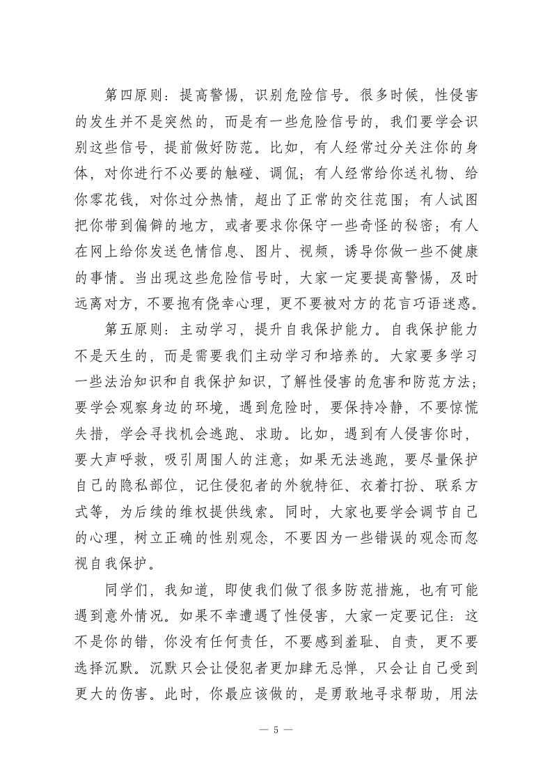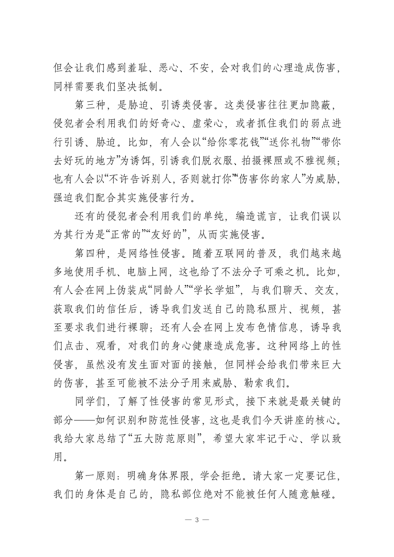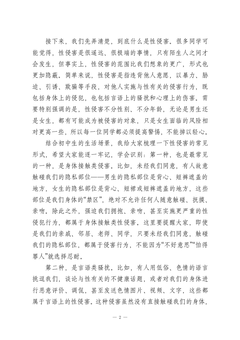 XX初中2026年春季学期“法治副校长”预防性侵教育讲座稿尊敬的各位老师、亲爱的同学们:大家上午好!我是本校的法治副校长XXX,同时也是XX人民法院/检察院/公安局的工作人员。今天,我怀着一份责任与关爱,和大家共同探讨一个严肃但至关重要的话题一一预防性侵害,守护青春成长。作为初中生,你们正处在青春期的关键阶段,身体和心理都在快速发育,开始对世界有了更多的好奇与探索,同时也面临着一些潜在的安全风险,性侵害就是其中最需要我们警惕和防范的一种。今天,我将从“什么是性侵害”“性侵害的常见形式”“如何识别和防范性侵害”“遭遇性侵害后该怎么办”这几个方面,用通俗的语言、真实的案例,给大家上一堂生动的法治安全教育课,希望能帮助每一位同学树立自我保护意识,掌握自我保护技能,让青春远离伤害,让成长充满阳光。首先,我们要明确一个核心观点:身体是自己的,任何人都没有权利随意触碰、侵犯我们的身体。就像我们拥有自己的书包、文具一样,我们的身体也属于自己,我们有权决定谁可以触碰、触碰哪里、如何触碰。无论对方是陌生人,还是我们熟悉的人,只要其行为让我们感到不舒服、不自在,甚至侵犯了我们的身体界限,我们都有权利拒绝、反抗,并寻求帮助。这不是我们的错,而是侵犯者的错误,我们不必感到羞耻、害怕,更不能选择沉默。一1