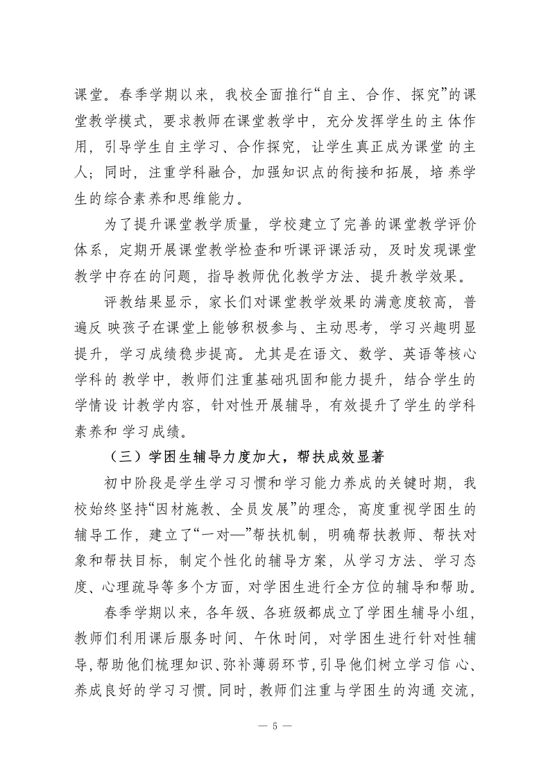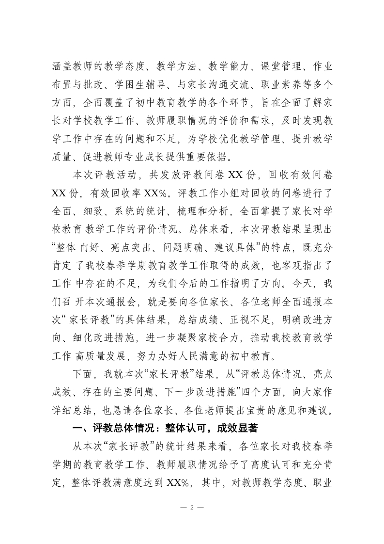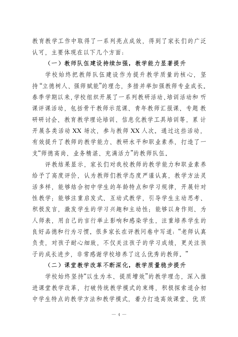 XX初中2026年春季学期“家长评教”结果通报会校长总结尊敬的各位家长、各位老师:大家下午好!春山可望,聚力前行;家校同心,共育花开。今天,我们齐聚XX初中,隆重召开2026年春季学期“家长评教”结果通报会。首先,我谨代表学校全体师生,向在百忙之中抽出时间莅临本次会议的各位家长,表示最热烈的欢迎和最衷心的感谢!向辛勤耕耘在教学一线、默默奉献的全体教职工,致以最诚挚的敬意和最亲切的问候!教育是一场双向奔赴的旅程,家庭是孩子成长的第一课堂,学校是孩子成长的重要阵地,而家长评教,正是搭建家校沟通桥梁、凝聚教育合力、优化教学质量、促进学校发展的重要举措。本次春季学期“家长评教”活动,自启动以来,得到了各位家长的高度重视和积极参与,大家本着客观公正、实事求是的原则,认真填写评教问卷,积极反馈意见建议,为学校的教育教学工作建言献策,充分体现了各位家长对学校工作的关心、支持与信任。在此,我再次向每一位参与评教的家长,致以最衷心的感谢!本次“家长评教”活动,学校精心策划、周密部署,成立了以校领导班子为核心的评教工作小组,制定了科学合理、贴合初中教育实际的评教方案,明确了评教内容、评教流程和工作要求,确保评教工作公平、公正、公开、有序开展。评教内容1