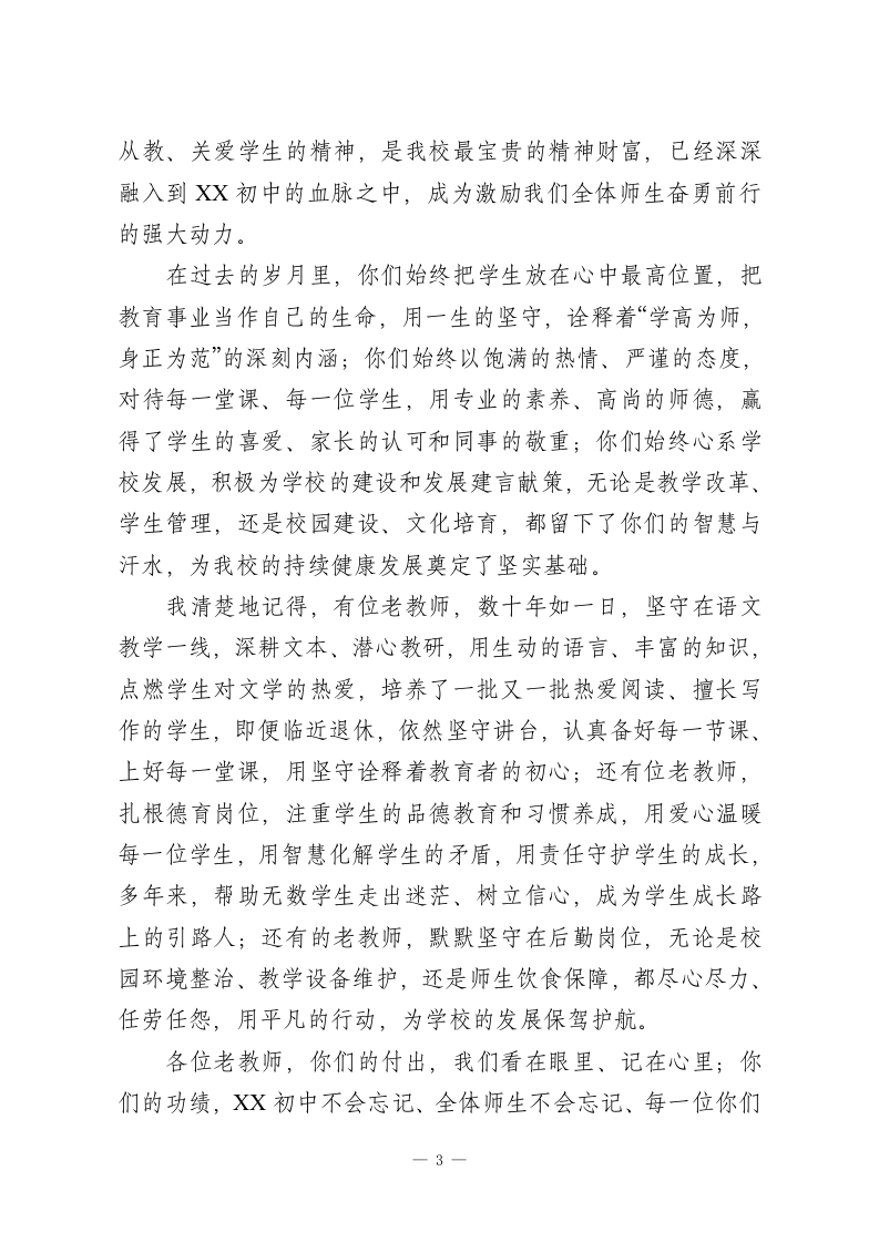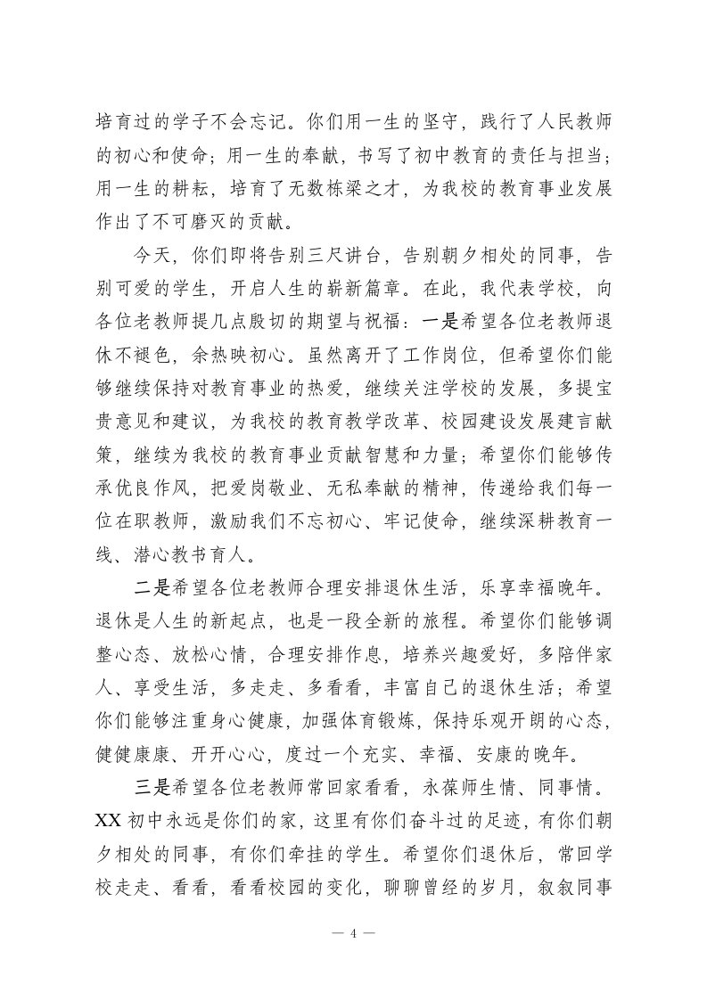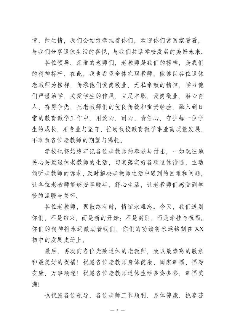 XX初中2026年春季学期“退休教师”欢送会校长讲话尊敬的各位退休老教师、各位领导、亲爱的老师们:大家下午好!春潮涌动,暖意融融;桃李芬芳,感念师恩。今天,我们怀着无比崇敬与不舍的心情,欢聚一堂,隆重举行XX初中2026年春季学期退休教师欢送会,共同送别我们可敬可爱的退休老教师们。首先,我代表学校党支部、校委会,代表全体师生,向光荣退休的各位老教师,致以最崇高的敬意、最诚挚的问候和最美好的祝福!向长期以来关心支持学校发展、默默奉献的各位老教师家属,致以衷心的感谢!今天,我们送别的各位老教师,是XX初中发展历程的见证者、参与者、推动者,是深耕初中教育一线的坚守者、耕耘者、奉献者。你们把最美好的青春年华、最宝贵的心血智慧,都倾注在了这片教育热土上,把毕生精力都奉献给了我校的初中教育事业,用责任与担当、爱心与坚守,书写了一曲曲动人的教育赞歌。你们的名字,将永远镌刻在XX初中的发展史册上;你们的精神,将永远激励着我校一代又一代教育工作者奋勇前行。回望各位老教师的教学生涯,是坚守的一生、奉献的一生、光辉的一生。初中阶段,是学生从童年走向青年的关键过渡期,是世界观、人生观、价值观形成的重要时期,是知识基础夯实、核心素养培育的黄金阶段。你们深知这份责任的厚重,几十年1