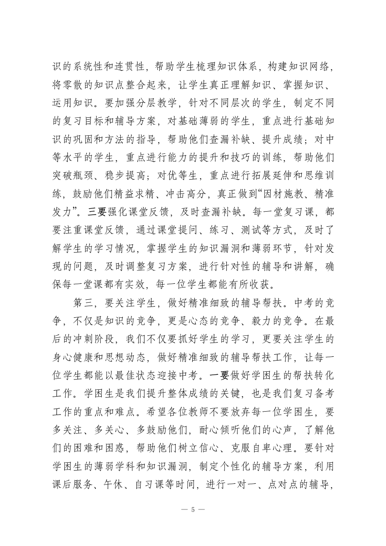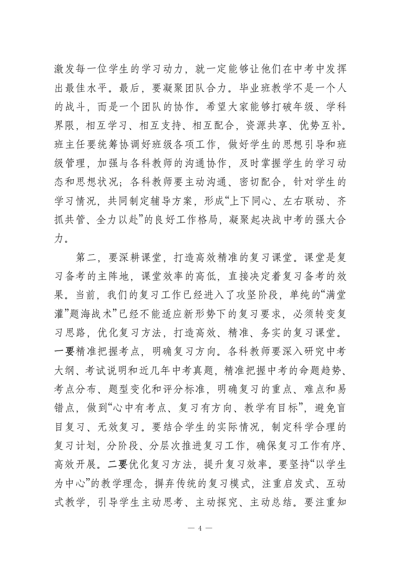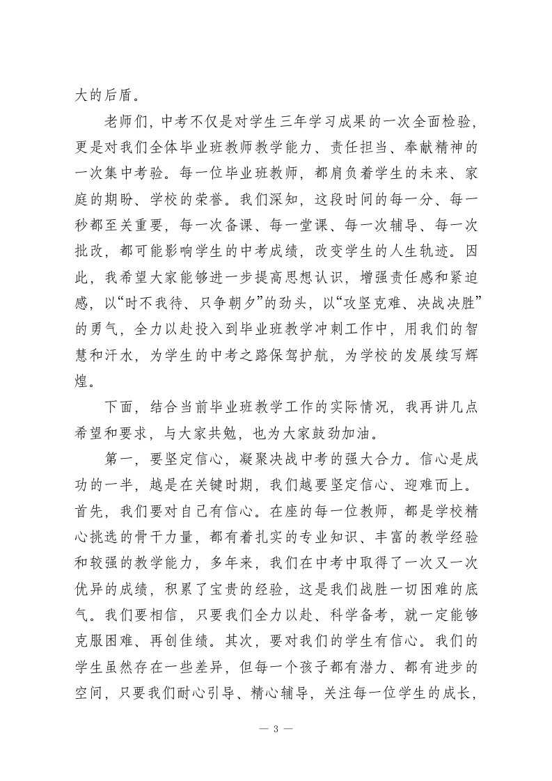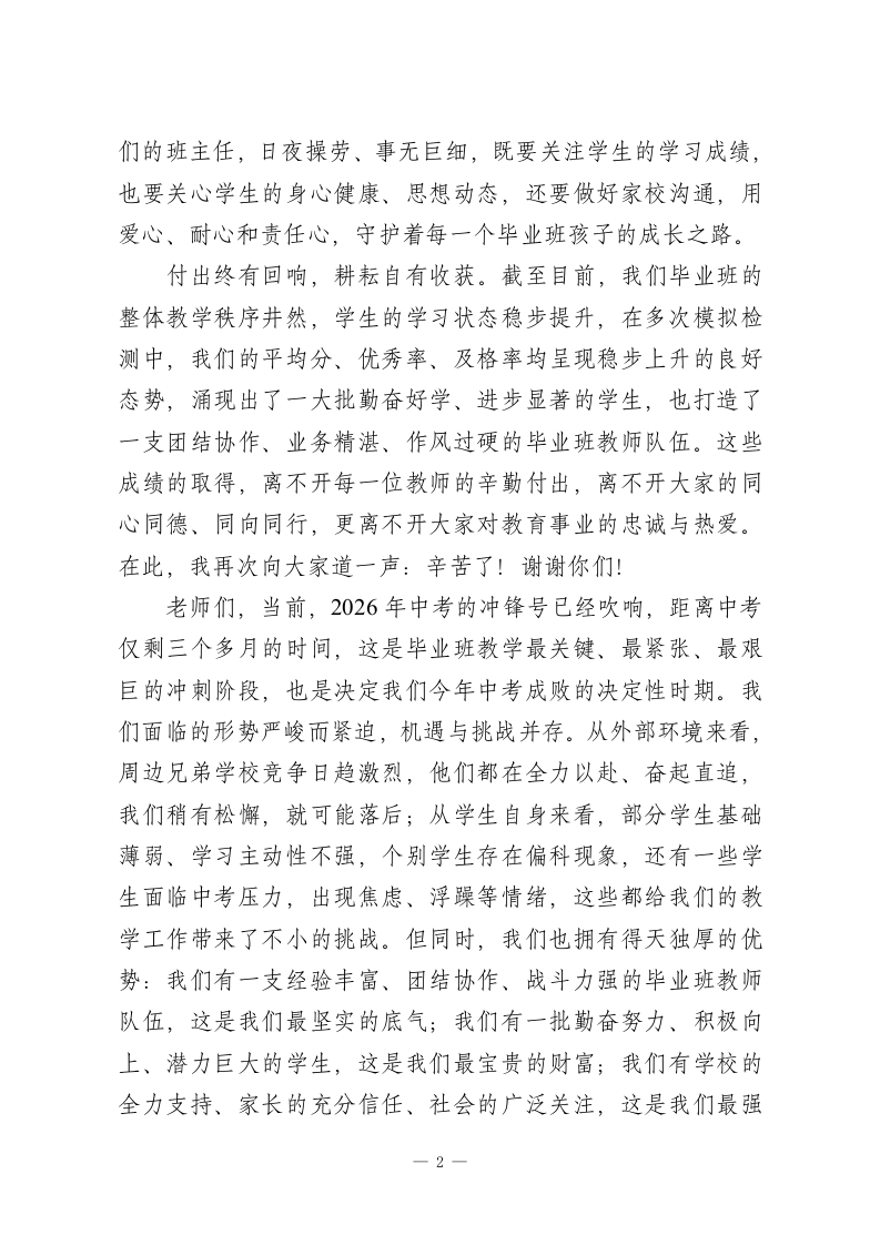 XX初中2026年春季学期毕业班教师座谈会上的校长鼓劲讲话尊敬的各位毕业班全体教师:大家晚上好!春潮涌动启新程,奋楫扬帆正当时。今天,我们特意召集全体毕业班教师,召开这次座谈会,既是一次凝心聚力、加油鼓劲的动员会,也是一次共商对策、共谋发展的研讨会,更是一次压实责任、冲刺攻坚的誓师会。首先,我代表学校党支部、校委会,代表全校师生,向在座的每一位毕业班教师,致以最崇高的敬意和最衷心的感谢!回望过去的几个月,从去年秋季学期的奋力积淀,到今年春季学期的全力冲刺,我们全体毕业班教师始终坚守在教学一线,以高度的责任感、无私的奉献精神、扎实的工作作风,默默耕耘、潜心育人。多少个清晨,你们迎着朝阳走进教室,为学生答疑解惑;多少个深夜,你们伴着星光批改作业、备课研课,梳理教学思路、优化复习方案;多少个休息日,你们放弃陪伴家人的时间,主动加班加点,为学困生辅导、为优等生拔高,为每一位学生的成长保驾护航。你们当中,有深耕毕业班教学多年、经验丰富的老教师,始终坚守初心、以身作则,用专业和坚守为学生指引方向;有朝气蓬勃、勇于创新的青年教师,主动担当、积极探索,用热情和活力点燃学生的学习激情;有兼顾家庭与工作、默默奉献的女教师,克服自身困难,舍小家为大家,把更多的时间和精力投入到毕业班教学中;还有我1