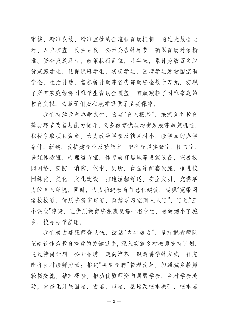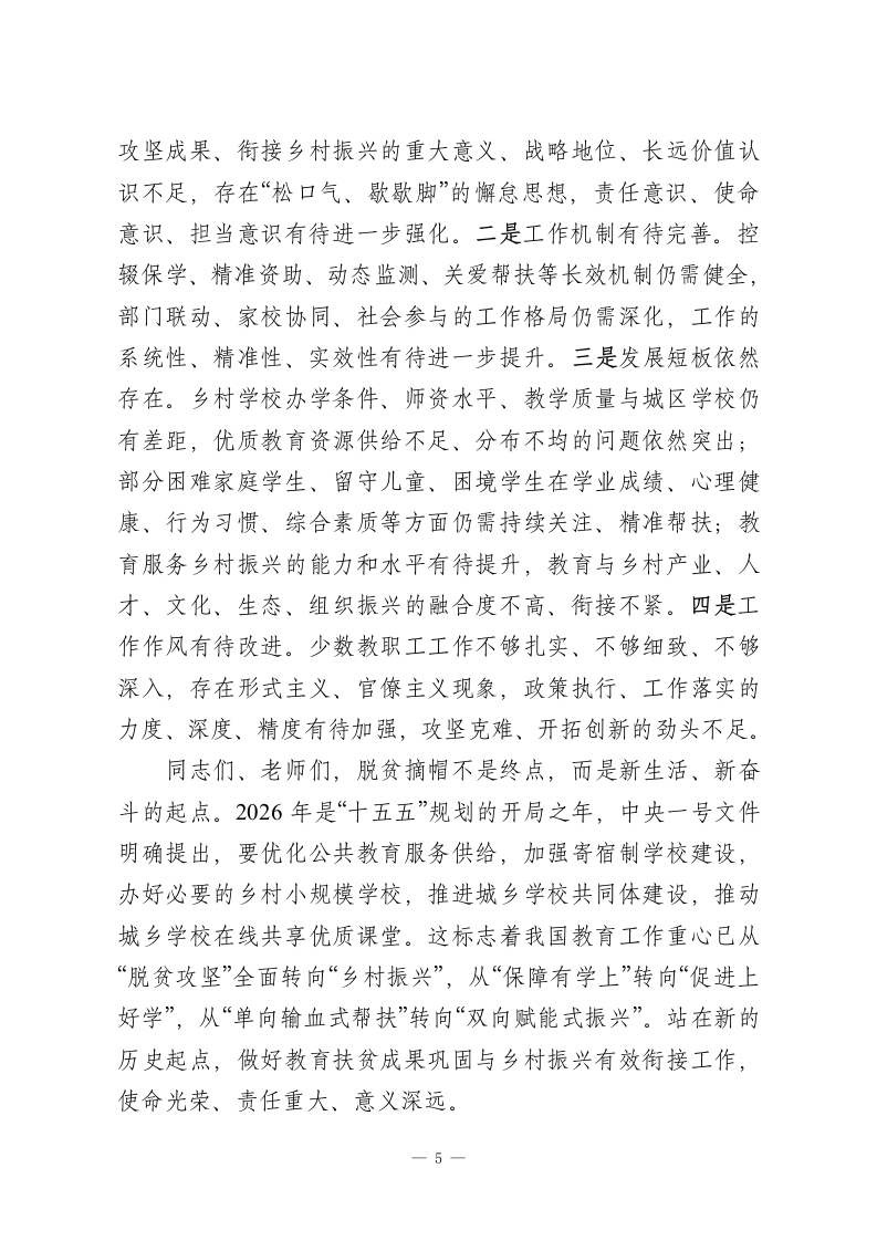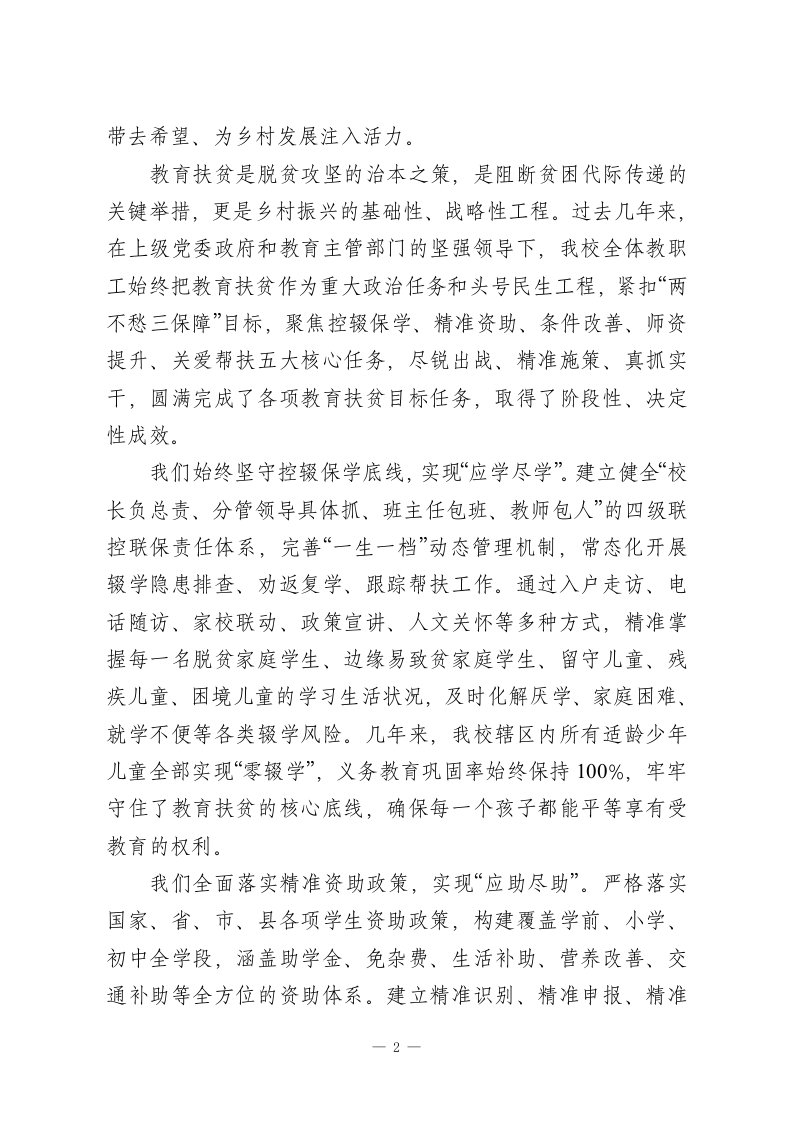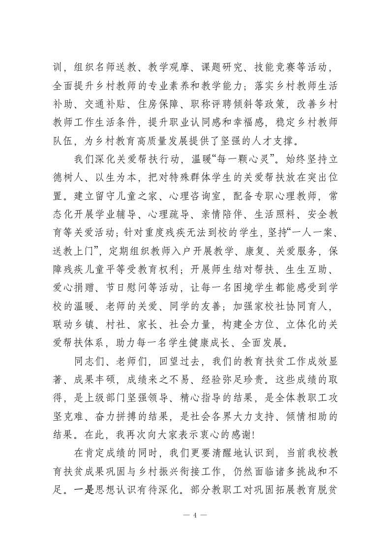 XX初中2026年春季学期教育扶贫成果巩固与乡村振兴衔接会校长发言同志们、老师们:大家上午好!今天,我们齐聚一堂,隆重召开XX初中2026年春季学期教育扶贫成果巩固与乡村振兴衔接工作专题会议。这次会议的主要任务是:深入学习贯彻习近平总书记关于巩固拓展脱贫攻坚成果、全面推进乡村振兴的重要论述,全面落实2026年中央一号文件及教育部、省、市、县关于教育扶贫成果巩固与乡村振兴有效衔接的工作部署,系统总结我校前期教育扶贫工作成效,客观分析当前面临的新形势、新任务、新挑战,全面部署2026年及今后一段时期我校教育扶贫成果巩固与乡村振兴有效衔接的各项工作,进一步统一思想、凝聚共识、明确方向、压实责任,以更高标准、更实举措、更硬作风,持续巩固拓展教育脱贫攻坚成果,全面赋能乡村教育振兴,为实现乡村全面振兴贡献XX初中的教育智慧与坚实力量。首先,我谨代表学校党支部、校委会,向长期以来奋战在教育扶贫一线、默默耕耘、无私奉献的全体教职工,表示最衷心的感谢和最崇高的敬意!向一直以来关心支持我校教育帮扶工作的各级领导、社会各界人士、爱心企业及家长朋友们,致以最诚挚的谢意!正是因为有了大家的同心同德、同向同行、同力同为,我们才能在教育扶贫的道路上攻坚克难、屡创佳绩,才能牢牢守住不让一名学生因贫失学的底线,才能为无数家庭1