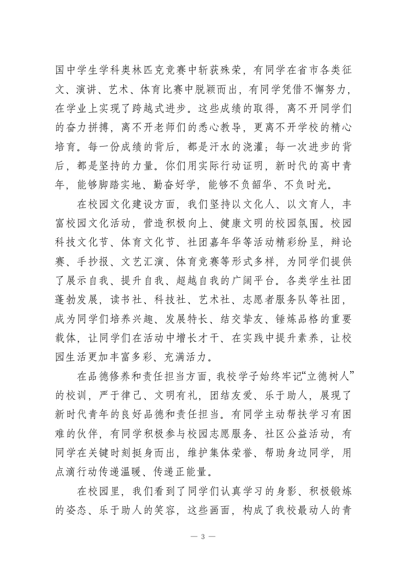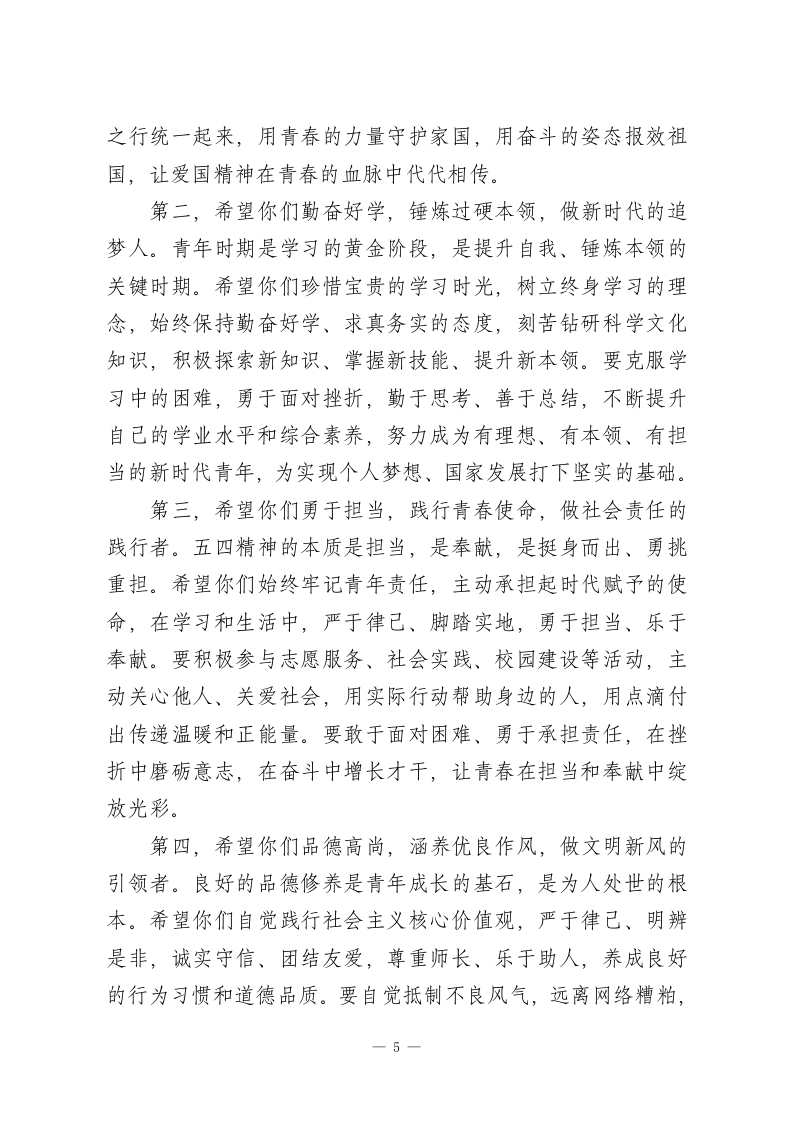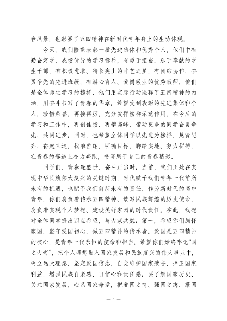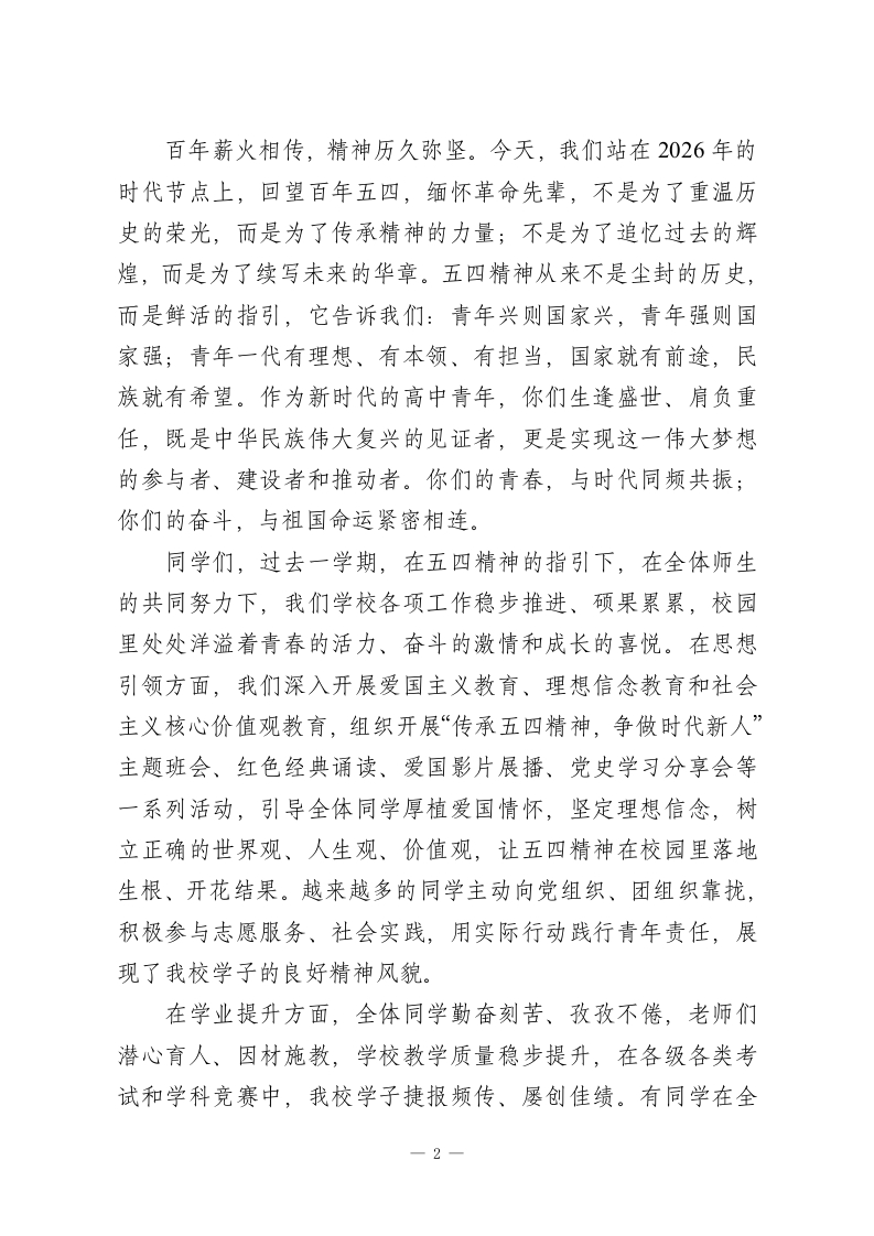 XX高中2026年春季学期校长在“五四”表彰大会上的致辞尊敬的各位老师、亲爱的同学们:大家上午好!春风浩荡,万象更新;薪火相传,青春逐梦。在这充满生机与希望的五月,我们怀着无比崇敬的心情,齐聚一堂,隆重举行XX高中2026年春季学期“五四”表彰大会,共同纪念五四运动107周年,传承五四精神,表彰先进典型,凝聚青春力量,展望美好未来。首先,我谨代表学校全体领导班子,向辛勤耕耘在教育教学一线、悉心培育青年学子的全体教职工,致以最崇高的敬意和最衷心的感谢!向朝气蓬勃、奋发向上的全体同学们,致以最诚挚的节日问候和最美好的青春祝福!更向今天受到表彰的先进集体和优秀个人,表示最热烈的祝贺和最殷切的期望!107年前,一群心怀家国、热血沸腾的青年学子,高举民主与科学的旗帜,冲破封建思想的桎梏,在中华大地上掀起了一场轰轰烈烈的爱国革命运动。他们以青春之我、奋斗之我,挺身而出、勇担使命,用热血和生命唤醒了民族觉醒,用呐喊和行动点燃了救亡图存的希望,谱写了一曲气壮山河、永载史册的青春赞歌。这场运动,不仅彻底改变了中国的历史进程,更孕育了“爱国、进步、民主、科学”的五四精神,成为一代又一代中国青年砥砺前行、奋勇争先的精神旗帜,成为中华民族宝贵的精神财富,穿越百年风雨,依然熠熠生辉、历久弥新。1