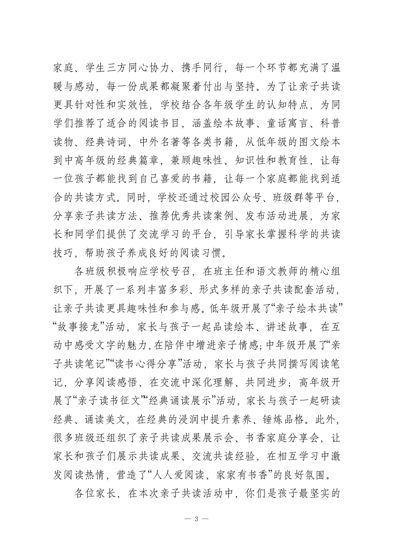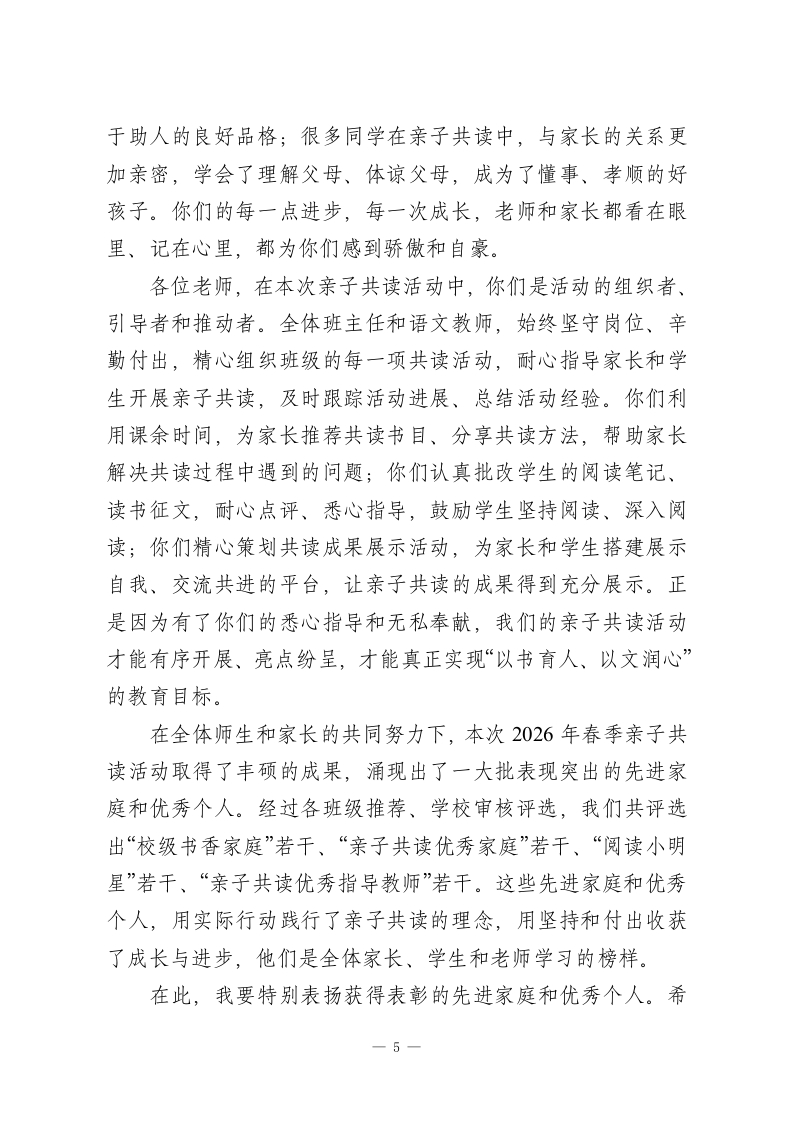 XX市第九小学2026年春季亲子共读活动总结表彰校长致辞尊敬的各位家长、各位老师,亲爱的同学们:大家上午好!春染校园,书香致远;亲子同行,共赴成长。在这繁花似锦、生机盎然的春日里,我们怀着无比欣慰与喜悦的心情,齐聚XX市第九小学的校园,隆重举行2026年春季亲子共读活动总结表彰大会。今天,我们在这里回顾亲子共读的温暖历程,总结活动开展的丰硕成果,表彰在活动中表现突出的先进家庭、优秀个人,进一步凝聚家校合力,持续深化亲子共读活动,让书香浸润家庭、滋养童心,让亲子陪伴更有温度、更有深度。在此,我谨代表学校领导班子,向本次亲子共读活动的圆满落幕,表示最热烈的祝贺!向精心筹备、辛勤付出的全体班主任、语文教师及相关工作人员,致以最崇高的敬意和最衷心的感谢!向积极参与、携手同行的每一位家长,致以最诚挚的问候!向在活动中认真阅读、努力成长的每一位同学,致以最美好的祝愿!更向今天获得表彰的先进家庭和优秀个人,致以最热烈的祝贺和最崇高的敬意!各位家长、同学们,阅读是滋养心灵的雨露,是启迪智慧的钥匙;亲子共读,是亲子陪伴的最佳方式,是家校共育的重要桥梁。小学阶段是孩子阅读习惯养成、品格塑造、知识积累的关键时期,而家庭作为孩子成长的第一课堂,家长作为孩子的第一任老师,与孩子并肩共读、携手同行,不仅能够让孩子1
