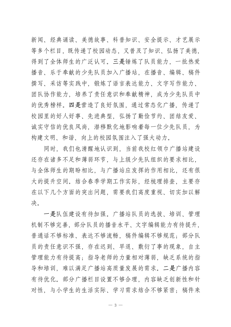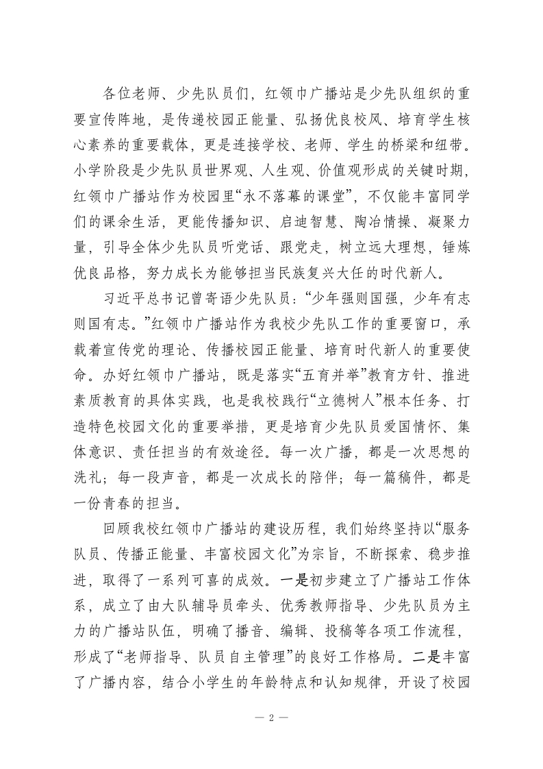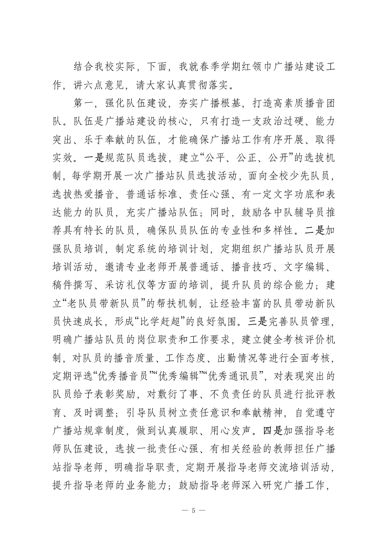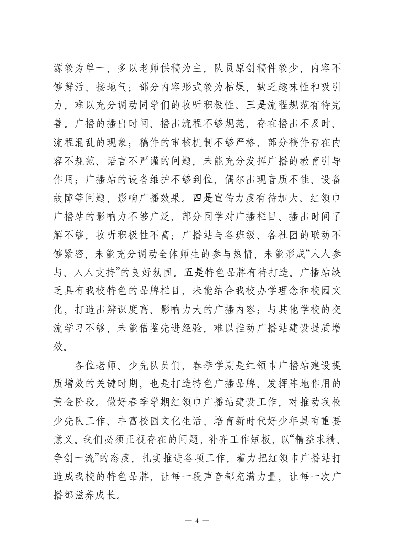 XX小学2026年春季学期红领巾广播站建设推进会校长发言尊敬的各位老师、亲爱的少先队员们、同志们:大家下午好!春和景明,万物生辉;红领巾飘,声动校园。今天,我们怀着无比喜悦和庄重的心情,齐聚一堂,隆重召开XX小学2026年春季学期红领巾广播站建设推进会。本次会议的核心任务是:深入贯彻落实少先队工作的各项要求,全面总结我校红领巾广播站建设的过往成效与不足,明确春季学期广播站建设的目标任务、重点举措,进一步统一思想、凝聚共识、压实责任,着力打造一支高素质的广播站队伍,优化广播内容、规范广播流程,让红领巾广播站真正成为我校少先队工作的重要阵地、校园文化建设的璀璨明珠、学生成长成才的重要平台,以声音传递正能量,以广播滋养少年心,推动我校少先队工作和校园文化建设高质量发展。首先,我谨代表学校党支部、校委会,向长期以来坚守在红领巾广播站岗位上,默默奉献、用心发声的全体指导老师和少先队员们,致以最诚挚的问候和最衷心的感谢!向一直以来关心、支持红领巾广播站建设,积极参与广播投稿、主动配合广播工作的全体师生,致以最崇高的敬意!正是因为你们的坚守与付出、热爱与支持,我校红领巾广播站才能稳步发展,成为校园里一道亮丽的风景线,为丰富校园文化生活、培育新时代好少年发挥了重要作用。1