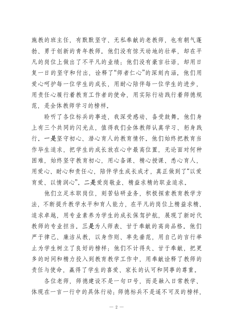XX小学2026年春季学期师德标兵事迹宣讲会校长总结发言各位老师、同志们:大家好!今天,我们齐聚一堂,隆重举行XX小学2026年春季学期师德标兵事迹宣讲会。刚才,我们认真聆听了各位师德标兵的先进事迹,他们用朴实的语言、真挚的情感、务实的行动,讲述了自己在教育岗位上坚守初心、潜心育人、默默奉献的动人故事,展现了我校教师立德树人、爱岗敬业、关爱学生、为人师表的良好精神风貌。在此,我代表学校全体师生,向各位受到表彰的师德标兵,表示最热烈的祝贺和最崇高的敬意!向辛勤耕耘在教育教学一线、默默奉献的全体教职工,致以衷心的感谢和诚挚的问候!师德是教师的立身之本、育人之基,是教育事业的灵魂和生命线。一直以来,我校始终坚持把师德师风建设放在教师队伍建设的首位,大力弘扬“学高为师、身正为范”的师德风尚,引导全体教师坚守教育初心、践行育人使命,努力打造一支师德高尚、业务精湛、充满活力的教师队伍。本次师德标兵事迹宣讲会,既是对我校师德师风建设成果的一次集中展示,也是对全体教师的一次精神洗礼和思想动员,目的就是通过榜样的力量,引领全体教师见贤思齐、比学赶超,进一步提升师德修养,凝聚育人合力。刚才宣讲的各位师德标兵,来自我们教学一线的不同岗位,他们中有深耕课堂、潜心教研的骨干教师,有关爱学生、因材1