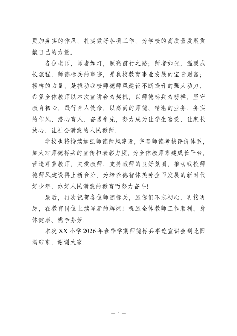 XX小学2026年春季学期师德标兵事迹宣讲会校长总结发言此内容为付费资源,请付费后查看