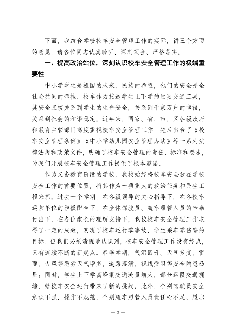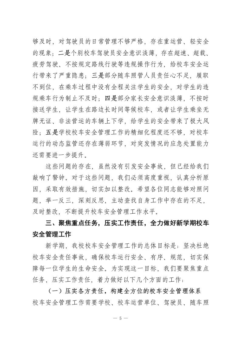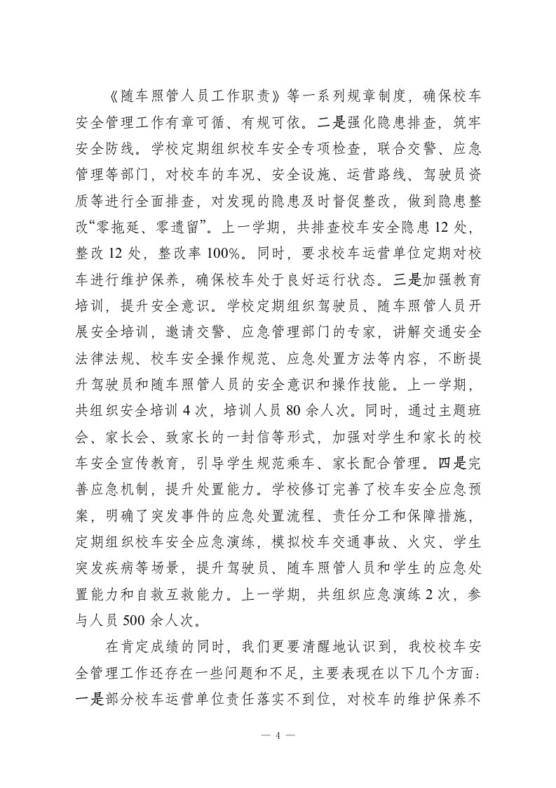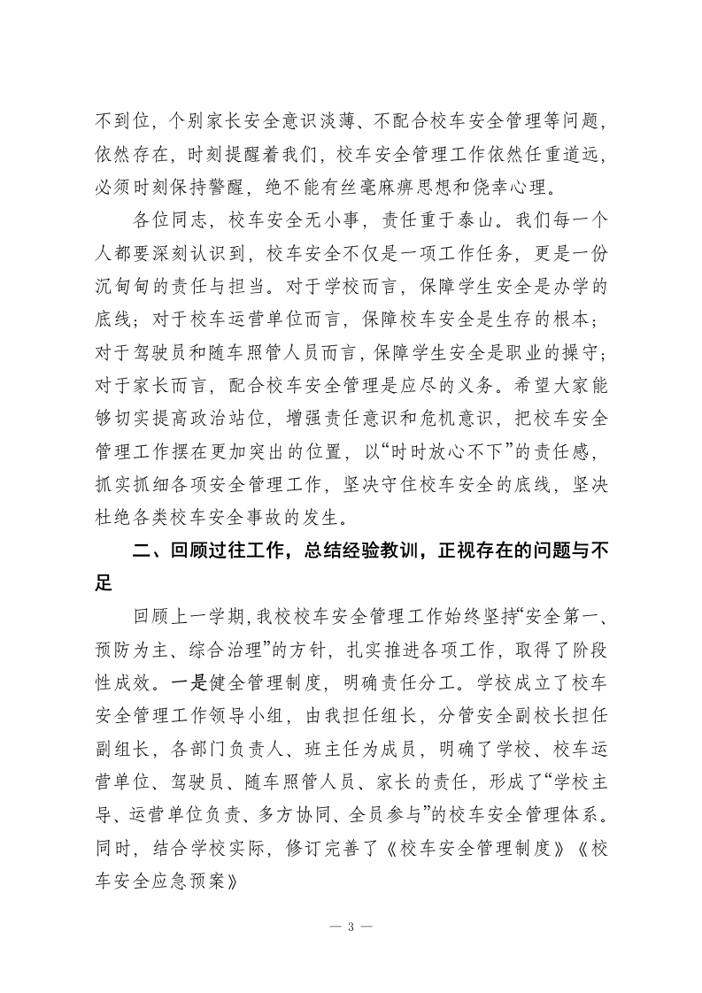 XX小学2026年春季学期校车安全管理联席会议校长发言尊敬的各位领导、各位校车运营单位负责人、各位校车驾驶员、随车照管人员,亲爱的老师们、家长代表们:大家上午好!春回大地,万物复苏,在这充满希望与生机的季节里,我们迎来了2026年春季学期的崭新征程。今天,我们齐聚一堂,隆重召开XX小学2026年春季学期校车安全管理联席会议,既是对过去一段时间校车安全管理工作的全面复盘与总结,更是对新学期校车安全工作的周密部署与庄严承诺。校车安全,关乎每一个孩子的生命健康,关乎每一个家庭的幸福安宁,关乎教育事业的和谐稳定,容不得丝毫懈怠、不能有半点马虎。在此,我谨代表学校,向长期以来关心支持我校校车安全管理工作的各位领导、校车运营单位、驾驶员、随车照管人员以及各位家长代表,表示最衷心的感谢和最崇高的敬意!今天的联席会议,我们有幸邀请到了辖区交警中队、应急管理部门、市场监管部门的各位领导,还有各校车运营公司的负责人、全体校车驾驶员、随车照管人员,以及我们学校的行政管理人员、班主任代表和家长代表。之所以组织这样一次高规格、全覆盖的联席会议,就是要进一步统一思想、凝聚共识压实责任,全面排查校车安全隐患,完善安全管理机制,强化应急处置能力,为孩子们的上下学之路筑牢安全防线,让每一位家长都能放心、安心,让每一个孩子都能平安、快乐地成长。1