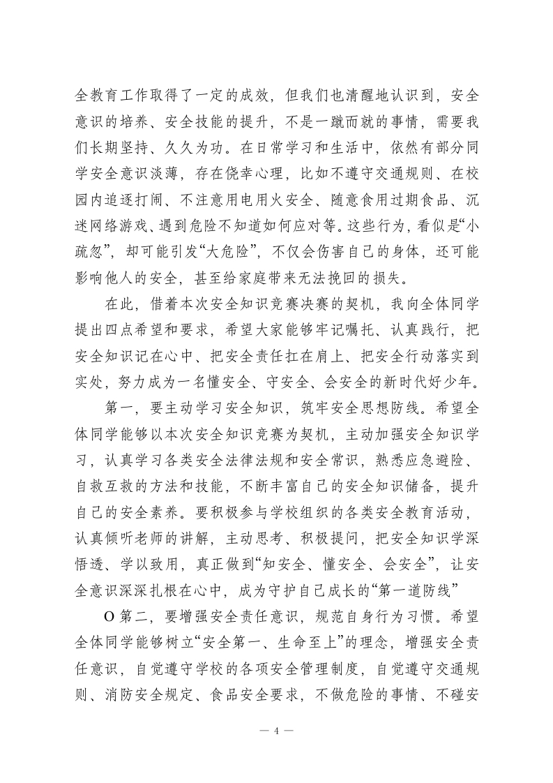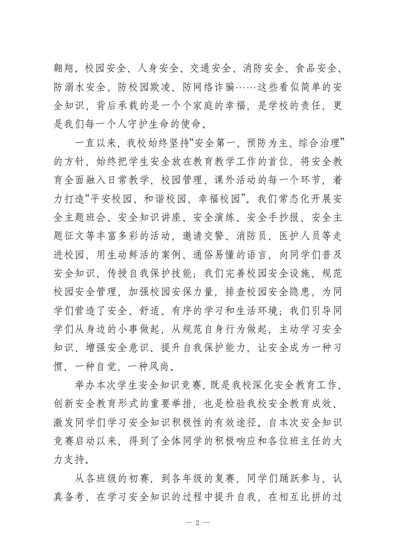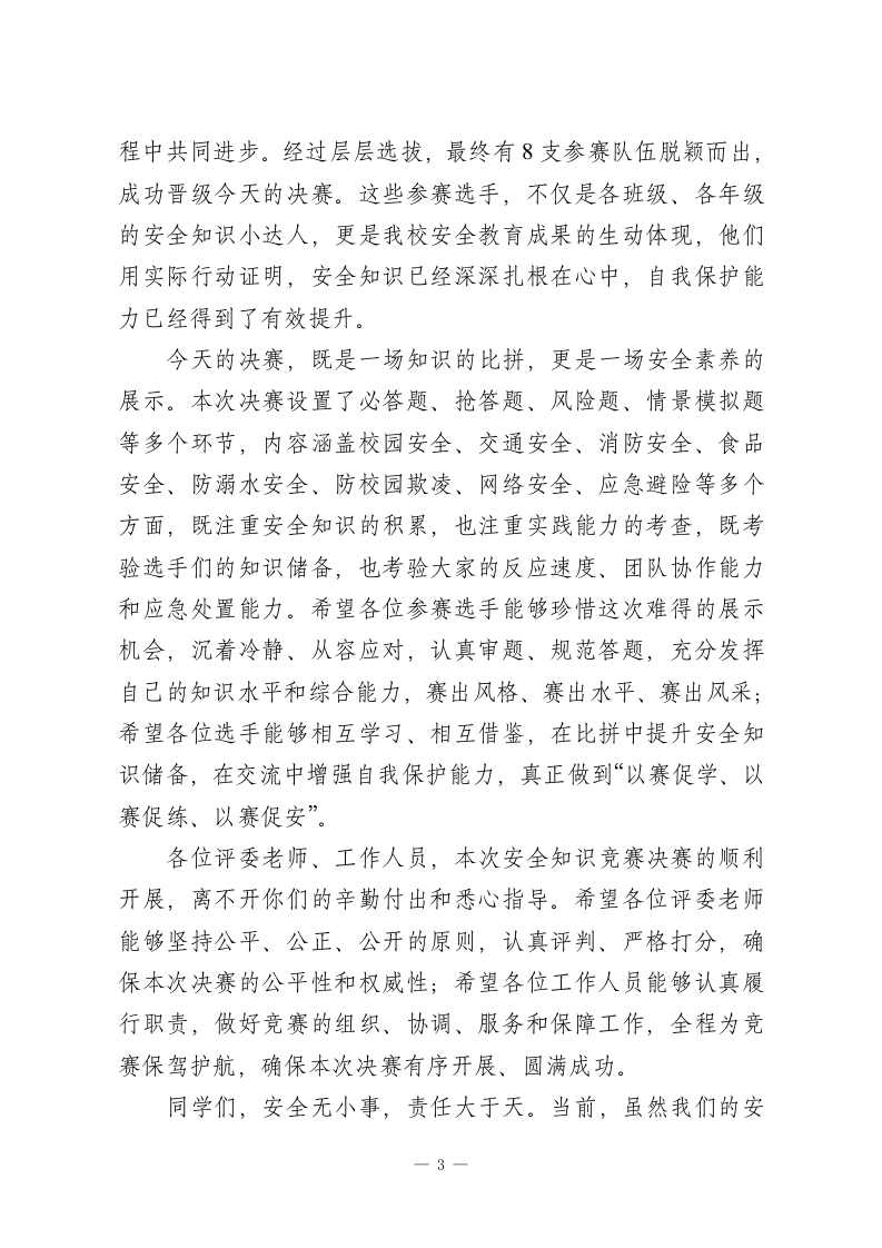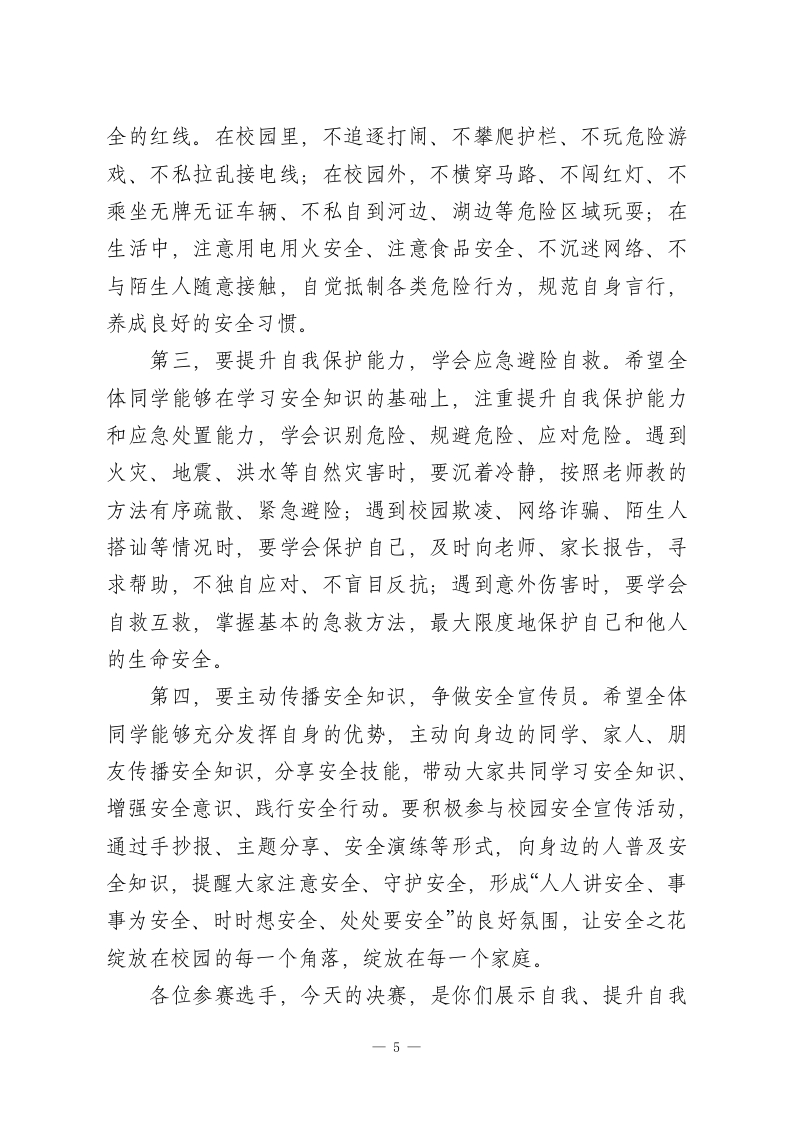 XX小学2026年春季学生安全知识竞赛决赛校长观摩致辞尊敬的各位评委老师、各位工作人员,亲爱的同学们、各位参赛选手:大家上午好!春和景明,万物生辉,在这充满生机与希望的美好时节,我们怀着无比喜悦和期待的心情,齐聚XX小学多功能报告厅,共同观摩2026年春季学生安全知识竞赛决赛。今天,从各年级初赛、复赛中脱颖而出的优秀参赛队伍,将在这里同台竞技、比拼学识、展现风采,用扎实的安全知识、敏捷的反应能力,诠释新时代小学生的安全素养与责任担当。首先,我谨代表学校领导班子,向本次安全知识竞赛决赛的顺利举行,表示最热烈的祝贺!向精心筹备、周密组织本次竞赛活动的各位评委老师、工作人员,致以最崇高的敬意和最衷心的感谢!向一路过关斩将、成功晋级决赛的全体参赛选手,致以最热烈的祝贺和最殷切的期许!更要向在场观摩学习的每一位同学,致以最美好的祝福,希望大家能在本次决赛中收获知识、提升能力、筑牢安全防线!同学们,安全是幸福的基石,是成长的前提,更是学校教育的重中之重。小学阶段是你们健康成长的关键时期,也是安全意识、自我保护能力培养的黄金阶段。你们就像一颗颗含苞待放的幼苗,需要安全的阳光雨露滋养,才能茁壮成长;你们就像一只只展翅欲飞的小鸟,需要安全的天空护航,才能自由1