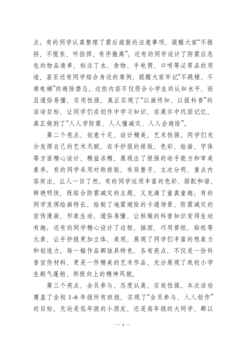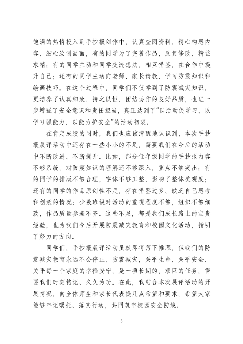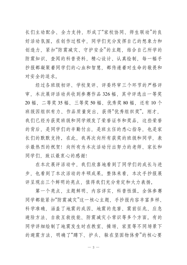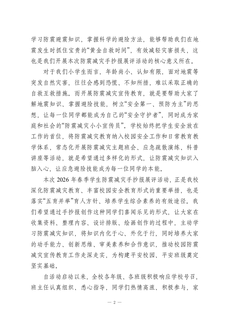 XX小学2026年春季学生防震减灾手抄报展评校长总结讲话尊敬的各位评委老师、各位班主任,亲爱的同学们、各位教职工同志们、家长代表们:大家上午好!春风送暖,万物生辉,在这充满生机与希望的美好时节,我们齐聚一堂,隆重举行XX小学2026年春季学生防震减灾手抄报展评总结大会。经过为期两周的精心筹备、自主创作和严格评审,本次防震减灾手抄报展评活动圆满完成了各项议程,即将落下帷幕。今天,我们共同回顾活动历程、总结活动成果、表彰优秀作品,更重要的是,借助这次展评活动,进一步筑牢全校师生的防震减灾思想防线,普及防震减灾知识,提升应急避险能力。在此,我谨代表学校领导班子,向本次防震减灾手抄报展评活动的顺利举办,表示最热烈的祝贺!向莅临现场的各位家长代表,表示最诚挚的欢迎和最衷心的感谢!向全程参与组织、评审工作的各位评委老师、班主任、教职工,致以最崇高的敬意和最衷心的问候!向积极参与、精心创作的全体同学们,致以最热烈的祝贺和最美好的祝福!同学们,我们生活的地球,时而温柔静谧,时而也会展现出它威严的一面。地震是一种自然现象,是地球内部运动引起的地表震动,具有突发性、不可预测性和破坏性,一旦发生,不仅会造成财产损失,更可能威胁到我们的生命安全。我国地处环太平洋地震带和欧亚地震带之间,是一个多地震的国家,1