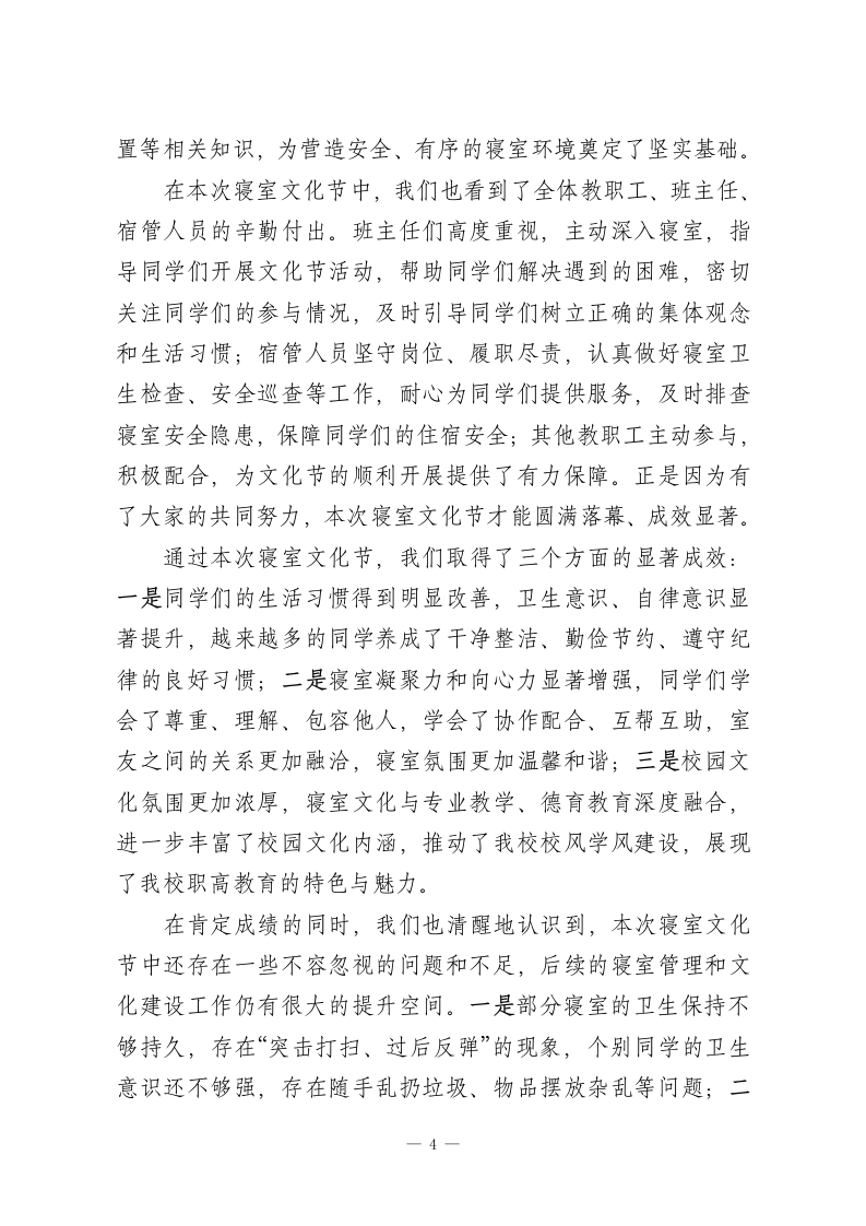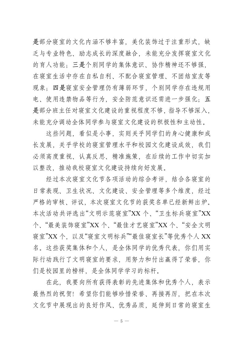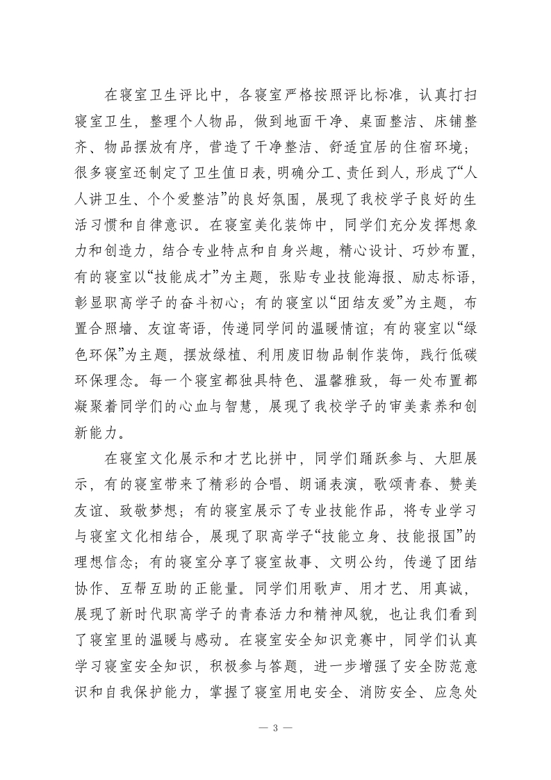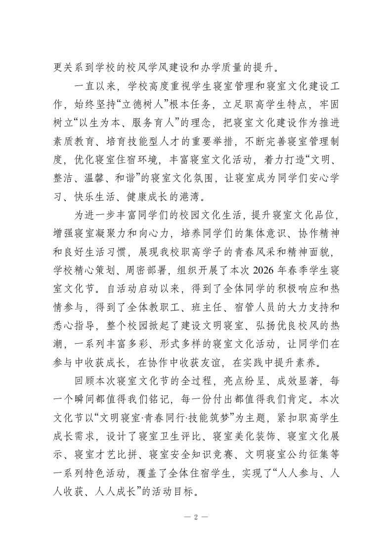 XX职校2026年春季学生寝室文化节总结表彰大会校长致辞尊敬的各位教职工、班主任,亲爱的同学们:大家下午好!春和景明,暖意融融;同心筑梦,共育文明。在这充满生机与希望的美好时节,我们欢聚一堂,隆重举行XX职校2026年春季学生寝室文化节总结表彰大会。今天,我们将共同回顾本次寝室文化节的精彩历程,总结成效、反思不足,表彰在活动中表现突出的先进集体和优秀个人,进一步凝聚共识、明确方向,推动我校寝室文化建设再上新台阶,为同学们营造更加文明、和谐、温馨、有序的住宿环境,助力每一位职高学子健康成长、技能成才。首先,我谨代表学校领导班子,向本次春季学生寝室文化节的圆满落幕,表示最热烈的祝贺!向精心筹备、辛勤付出的全体教职工、班主任、宿管人员,致以最诚挚的感谢和最崇高的敬意!向积极参与、奋勇拼搏、展现青春风采的全体同学,致以最亲切的问候和最美好的期许!同学们,寝室是你们在校期间学习、生活、休息的重要场所,是你们远离家乡后的第二个“家”,更是你们锤炼品格、学会协作、提升素养、收获友谊的重要阵地。职高阶段,不仅是你们学习专业技能、提升综合素养的关键时期,更是你们培养独立生活能力、树立集体观念、养成良好习惯的黄金阶段。而寝室文化,作为校园文化的重要组成部分,承载着育人功能,传递着青春正能量,直接影响着同学们的身心健康和成长发展,1