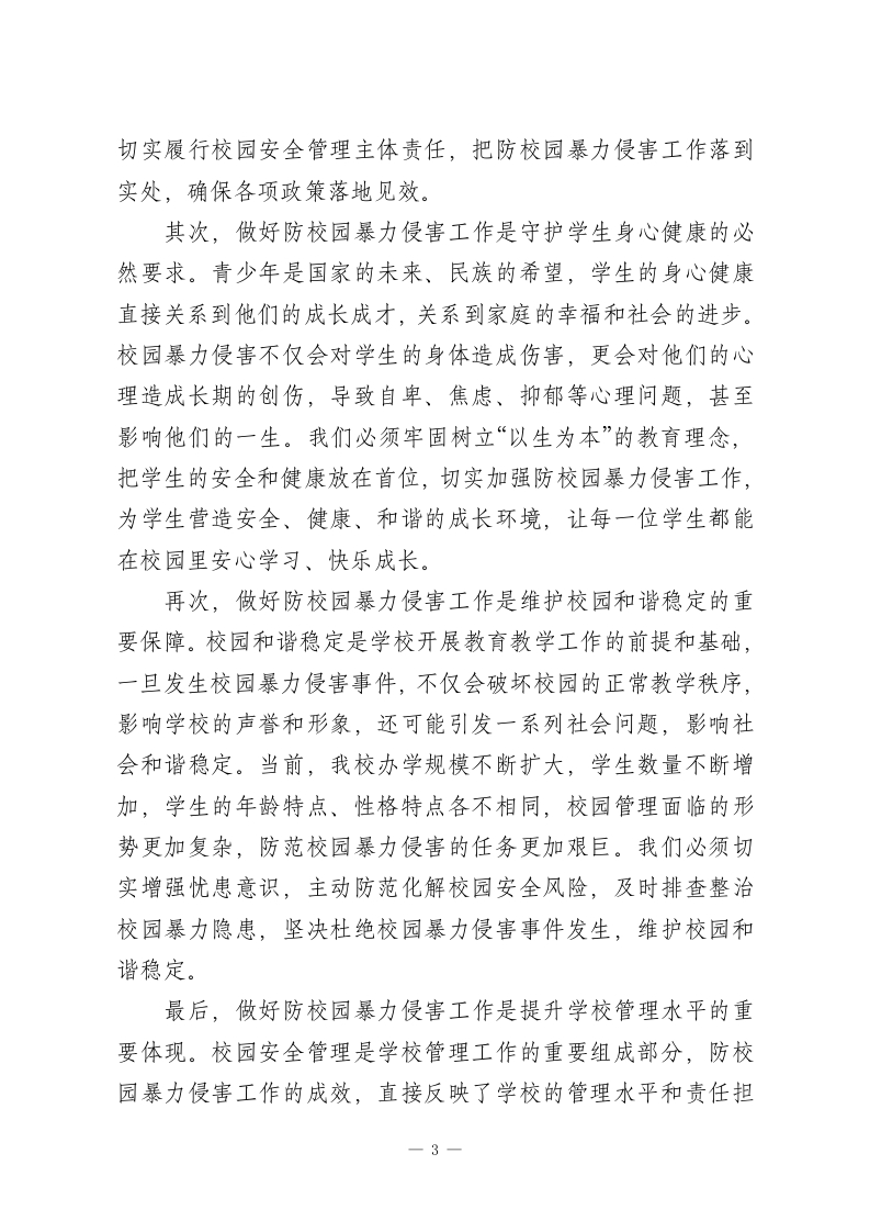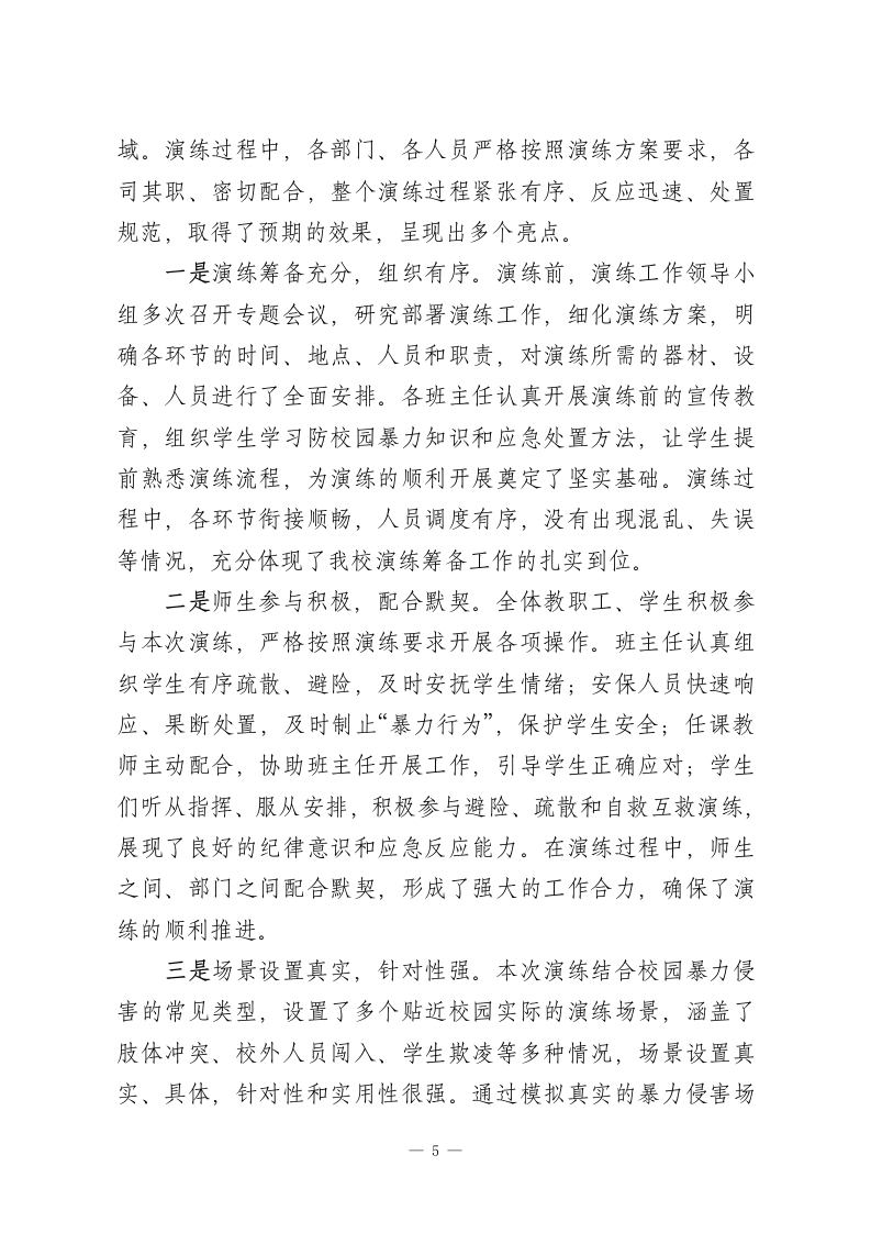 XX中学2026年春季学期防校园暴力侵害应急演练总结评估会校长讲话各位教职工、各位同仁,亲爱的同学们:大家上午好!今天,我们怀着严肃认真的态度,齐聚一堂,召开XX中学2026年春季学期防校园暴力侵害应急演练总结评估会。本次防校园暴力侵害应急演练,是我校深入贯彻落实上级教育主管部门关于校园安全工作的各项部署要求,切实筑牢校园安全防线、保障全体师生人身安全、维护校园和谐稳定的重要举措,也是我校常态化开展校园安全宣传教育、提升师生应急处置能力的具体实践。校园是培育人才、滋养成长的净土,校园安全是教育工作的底线,更是关乎学生健康成长、家庭幸福安宁、社会和谐稳定的头等大事。近年来,校园暴力侵害问题偶有发生,不仅严重伤害了学生的身心健康,破坏了校园的和谐秩序,也给家庭和社会带来了不良影响,成为全社会高度关注的热点问题。作为教育工作者,我们肩负着守护每一位学生健康成长的神圣职责,必须高度重视校园暴力侵害防治工作,将其摆在校园安全工作的突出位置,常抓不懈、久久为功。为有效防范校园暴力侵害事件发生,提升全体师生应对校园暴力的应急反应能力、自我保护能力和协同处置能力,我校经过精心筹备、周密部署,于近期组织开展了本次防校园暴力侵害应急演练。演练覆盖全校各年级、各班级,涉及校园内可能发生暴力侵害的多个场景,全体教职工、学生积极参与、密1