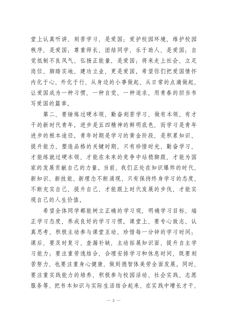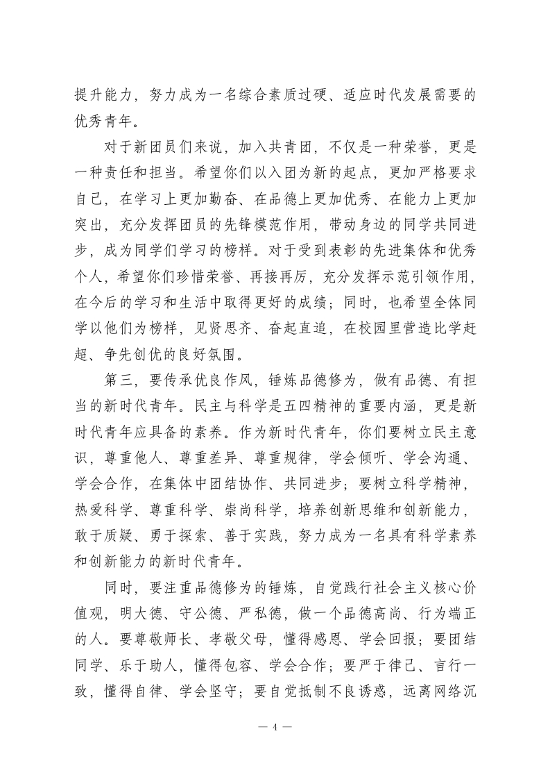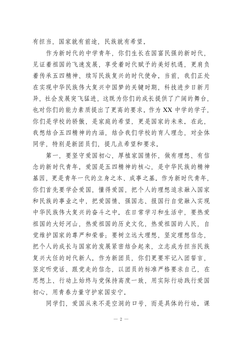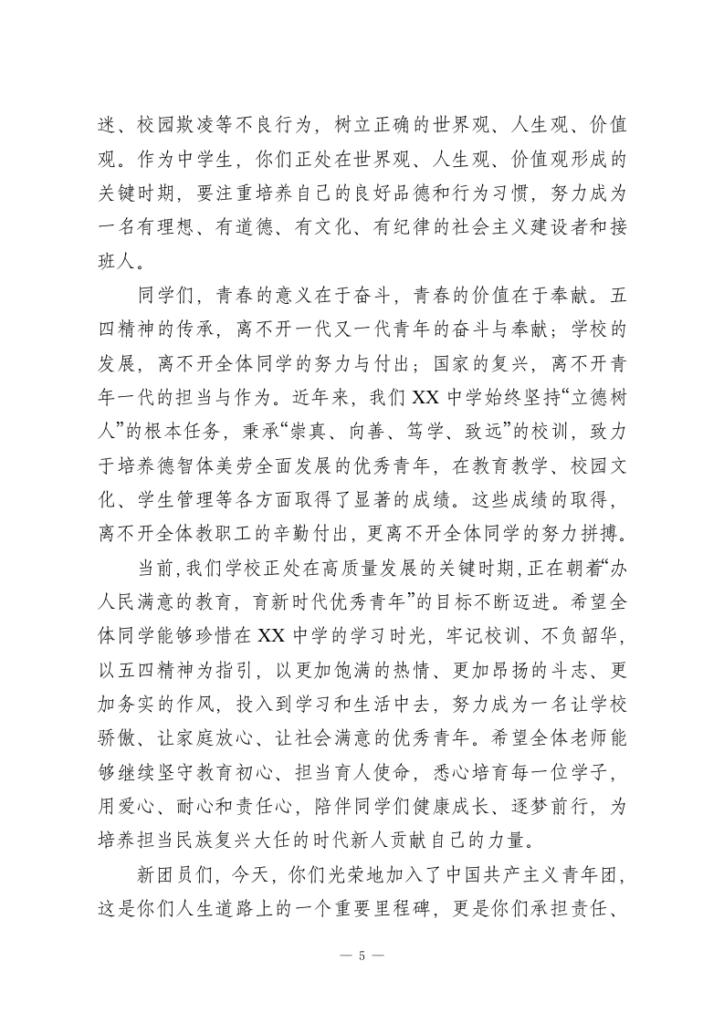 XX中学2026年春季学期五四表彰暨新团员入团宣誓仪式校长致辞尊敬的各位老师、亲爱的同学们:大家上午好!春潮涌动,万象更新;薪火相传,青春向党。在这充满生机与希望的美好时节,我们怀着无比崇敬的心情,齐聚校园,隆重举行XX中学2026年春季学期五四表彰暨新团员入团宣誓仪式。首先,我谨代表学校党支部、校委会,代表全体教职工,向刚刚光荣加入中国共产主义青年团的新团员们,表示最热烈的祝贺!向在过去一学期里,在学习、工作、志愿服务等各方面表现突出、荣获表彰的先进集体和优秀个人,表示最诚挚的敬意!向辛勤耕耘在教育教学一线,悉心培育青年学子的全体老师们,致以最衷心的感谢!今天,我们站在时代的潮头,回望百年五四,致敬那段热血沸腾、风华正茂的岁月。1919年5月4日,一群心怀家国、意气风发的青年,高举民主与科学的旗帜,挺身而出,呐喊抗争,用青春的热血和生命,点燃了救亡图存的希望之火,开启了中国近代史上具有里程碑意义的爱国革命运动。百年风雨兼程,百年薪火永续,五四精神早已融入中华民族的血脉,成为一代又一代中国青年砥砺前行的精神旗帜。“爱国、进步、民主、科学”的五四精神,不是尘封的历史记忆,而是鲜活的精神指引,它告诉我们:青年兴则国家兴,青年强则国家强,青年一代有理想、有本领、1