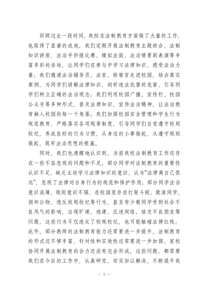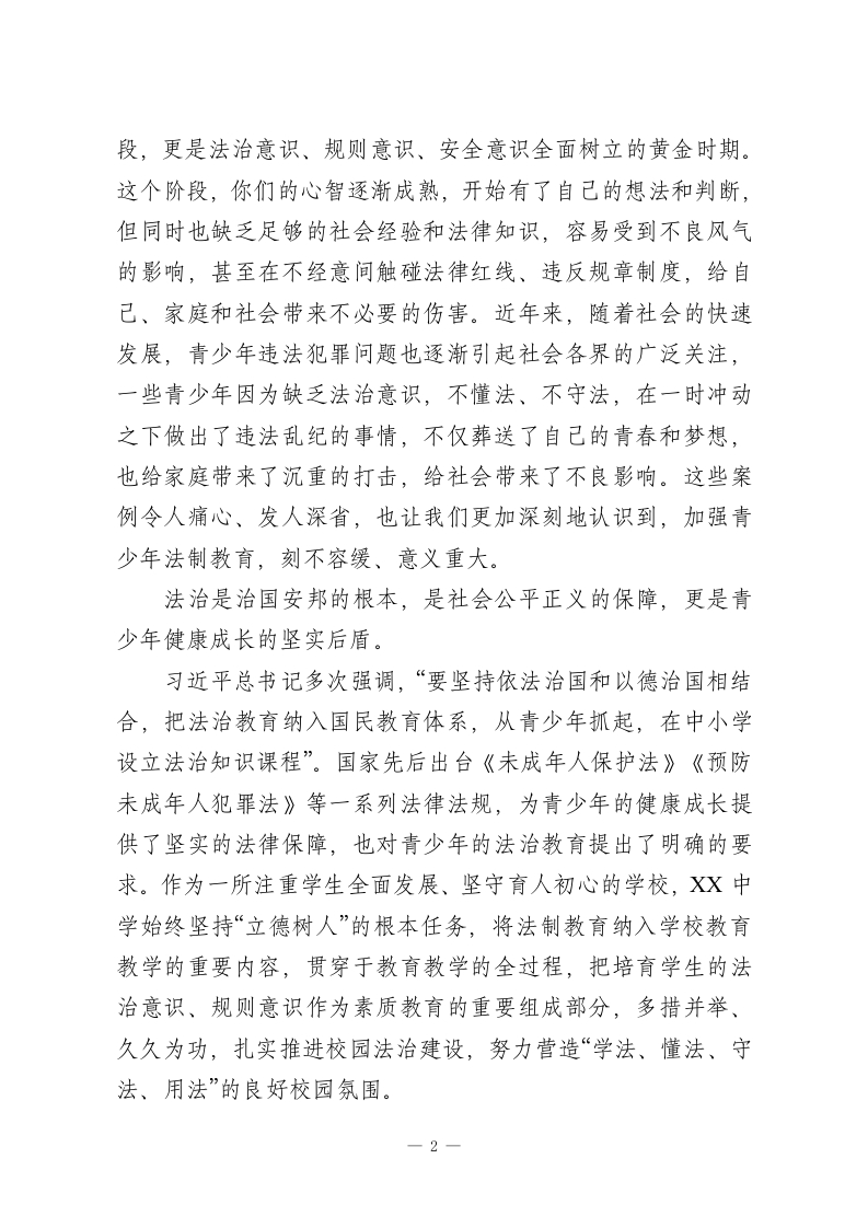 XX中学2026年春季学生法制教育报告会校长开场致辞尊敬的各位法治辅导员、各位来宾,亲爱的老师们、同学们:大家上午好!春和景明,万物生长;法治护航,逐梦前行。在这充满生机与希望的春季学期,我们怀着无比庄重的心情,齐聚XX中学操场,隆重举行2026年春季学生法制教育报告会。今天,我们有幸邀请到各位法治领域的专家、学者和法治辅导员,为全体师生带来一场专业、生动、深刻的法制教育盛宴,目的就是进一步普及法律知识,弘扬法治精神,培育法治观念,引导全体同学树立正确的法治意识、规则意识和安全意识,学会用法律武器保护自己、规范自己,在法治的阳光下健康成长、全面发展,努力成为德智体美劳全面发展的新时代青少年。首先,我代表学校领导班子,向在百忙之中莅临本次报告会的各位法治辅导员、各位来宾,致以最热烈的欢迎和最衷心的感谢!感谢你们长期以来对我校法制教育工作的关心、支持与帮助,感谢你们不辞辛劳,走进校园、走近师生,为我们传法送宝、答疑解惑;向辛勤耕耘在教育教学一线,默默守护学生成长、践行法治教育责任的全体老师们,致以最诚挚的问候和最崇高的敬意;更向在座的每一位朝气蓬勃、心怀梦想的同学们,送上最殷切的期望和最美好的祝福!同学们,中学阶段是你们世界观、人生观、价值观形成的关键时期,是从懵懂走向成熟、从校园走向社会的重要过渡阶1
