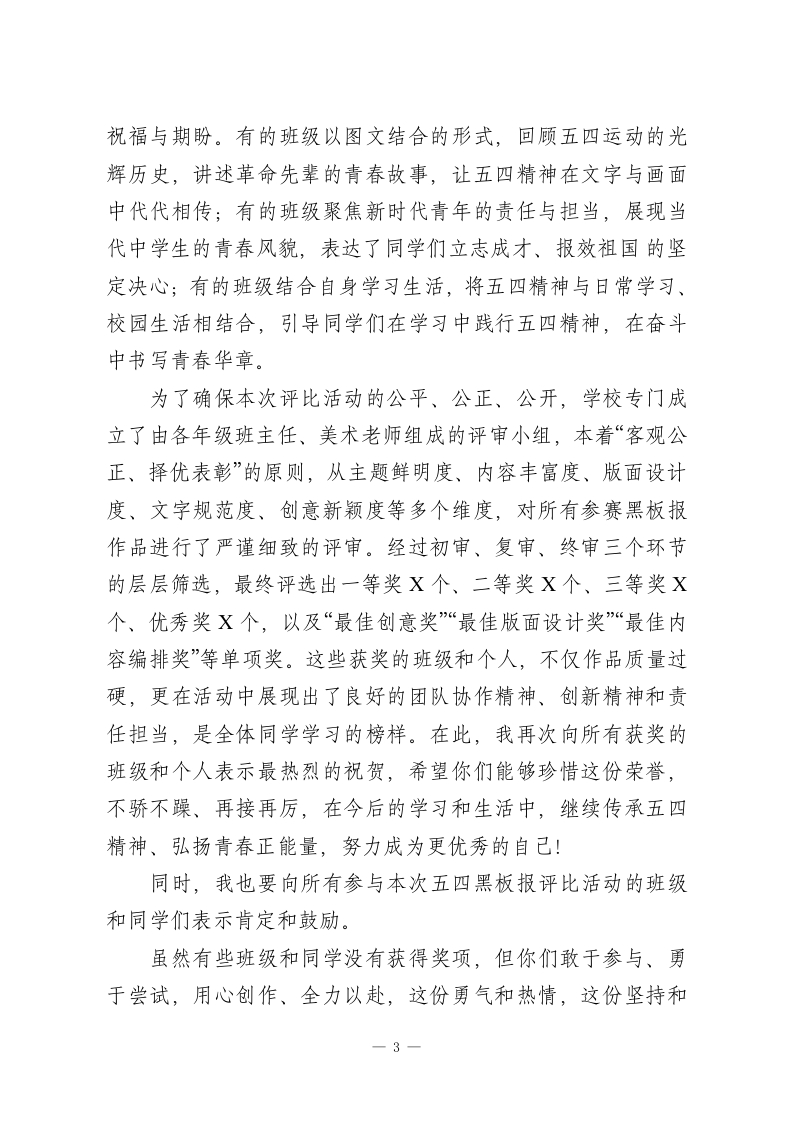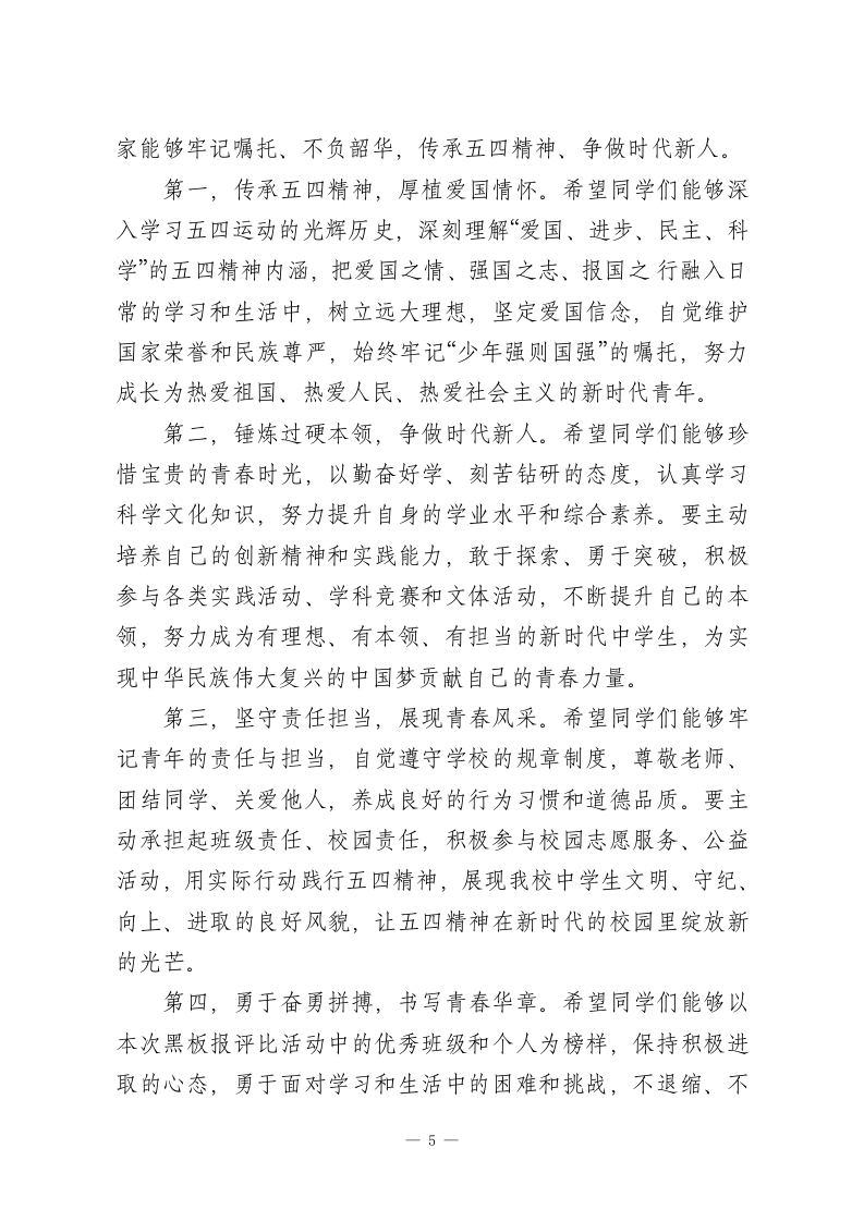 XX中学2026年春季学生五四黑板报评比颁奖仪式校长讲话尊敬的各位老师、亲爱的同学们:大家上午好!青春似火,薪火相传;五四精神,永放光芒。在这充满朝气与希望的五月,我们怀着无比崇敬与喜悦的心情,齐聚校园,隆重举行XX中学2026年春季学生五四黑板报评比颁奖仪式。首先,我谨代表学校领导班子,代表全体教职工,向在本次五四黑板报评比活动中脱颖而出、荣获表彰的先进班级和优秀个人,致以最热烈的祝贺和最诚挚的掌声!向精心组织、悉心指导本次评比活动的各位班主任、美术老师和工作人员,致以最衷心的感谢和最崇高的敬意!向积极参与、用心创作,用画笔和文字诠释五四精神的每一位同学,致以最亲切的问候和最美好的期许!同学们,五月四日,是一个值得永远铭记的日子。107年前,一群热血沸腾的青年学子,高举民主与科学的旗帜,冲破封建思想的桎梏,挺身而出、奋勇抗争,用青春的热血和生命的呐喊,开启了中国近代史上具有划时代意义的五四运动,铸就了“爱国、进步、民主、科学”的五四精神。这精神,是穿越百年的精神火炬,是激励一代又一代中国青年奋勇前行的精神旗帜;这精神,承载着青年的责任与担当,蕴含着青年的理想与追求,指引着我们在时代的浪潮中奋勇拼搏、勇毅前行。作为新时代的中学生,你们是五四精神的传承者、弘扬者,1