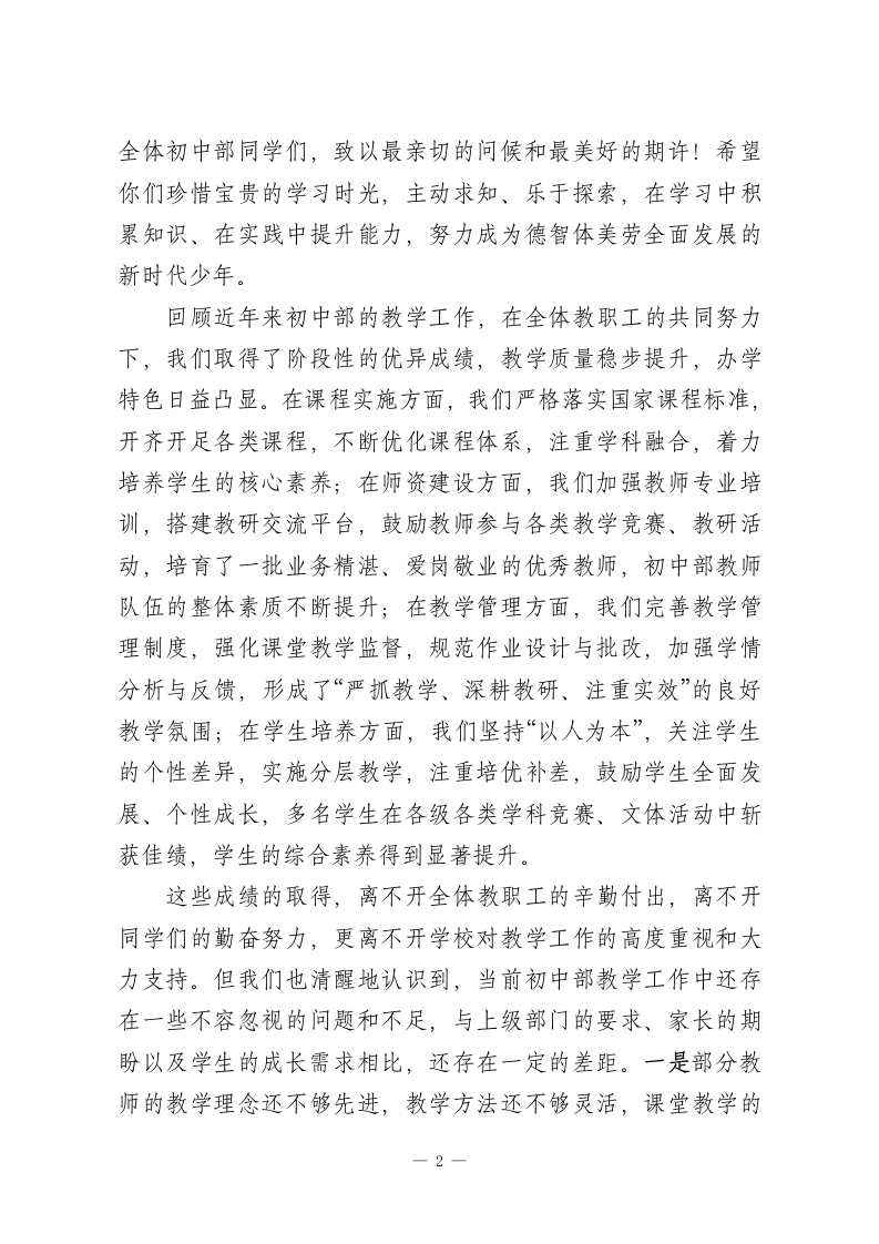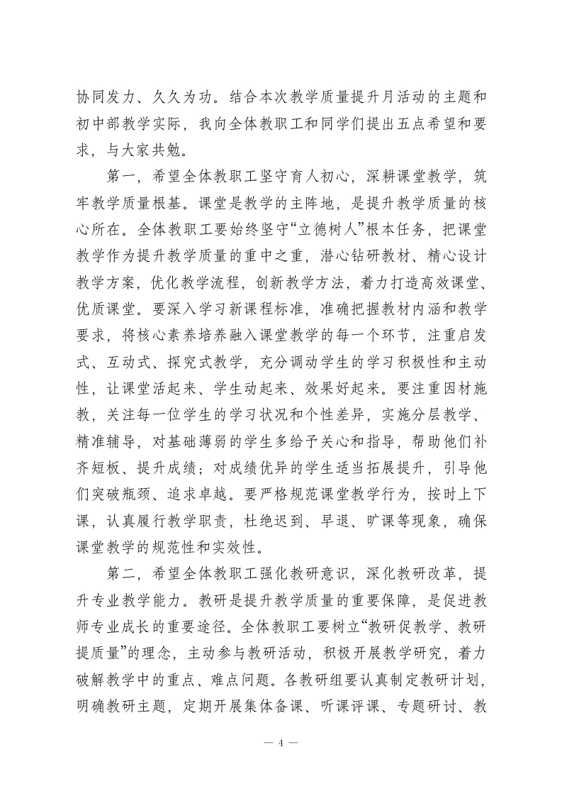 XX中学初中部2026年春季教学质量提升月启动会校长讲话尊敬的各位教职工,亲爱的同学们:大家上午好!春潮涌动启新程,深耕教学提质效。在这万物复苏、生机盎然的春日里,我们齐聚XX中学初中部校园,隆重举行2026年春季教学质量提升月启动会。教学质量是学校的生命线,是教育工作的核心任务,更是我们践行“立德树人”根本使命、培育时代新人的重要根基。初中阶段是学生知识积累、能力提升、品格塑造的关键时期,直接关系到学生未来的成长与发展,关系到学校的办学声誉与长远发展。当前,春季学期已过半,正是查漏补缺、提质增效、冲刺提升的黄金阶段,我们组织开展本次教学质量提升月活动,目的就是进一步凝聚全体师生共识,聚焦教学核心,破解教学难题,强化教学管理,优化教学方法,全面提升初中部教学质量,为每一位学生的成长成才保驾护航。首先,我谨代表学校领导班子,向长期以来深耕教学一线、默默奉献、潜心育人的全体初中部教职工,致以最诚挚的感谢和最崇高的敬意!感谢你们坚守教育初心,牢记育人使命,以高度的责任意识和严谨的工作态度,扎根课堂、深耕教研,用心浇灌每一位学生,用爱呵护每一份成长;感谢你们在教学工作中勇于探索、不断创新,积极践行先进的教育理念,努力提升教学水平,为初中部教学质量的稳步提升付出了辛勤的汗水和不懈的努力。同时,也向勤奋好学、刻苦钻研、积极进取的1